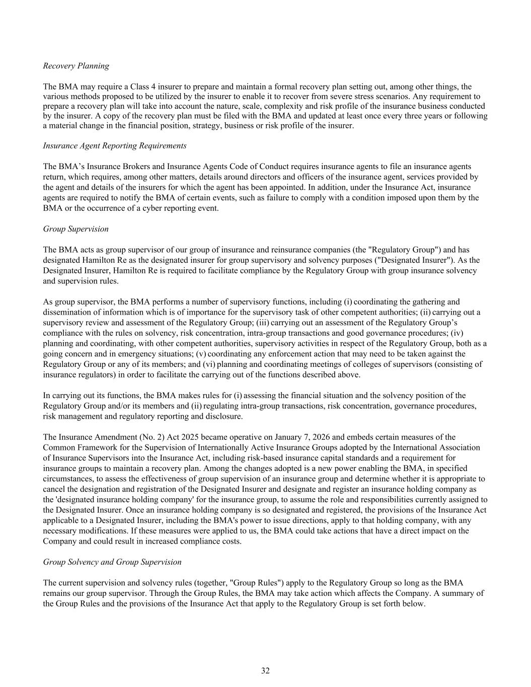 Recovery Planning The BMA may require a Class 4 insurer to prepare and maintain a formal recovery plan setting out, among other things, the various methods proposed to be utilized by the insurer to enable it to recover from severe stress scenarios. Any requirement to prepare a recovery plan will take into account the nature, scale, complexity and risk profile of the insurance business conducted by the insurer. A copy of the recovery plan must be filed with the BMA and updated at least once every three years or following a material change in the financial position, strategy, business or risk profile of the insurer. Insurance Agent Reporting Requirements The BMA’s Insurance Brokers and Insurance Agents Code of Conduct requires insurance agents to file an insurance agents return, which requires, among other matters, details around directors and officers of the insurance agent, services provided by the agent and details of the insurers for which the agent has been appointed. In addition, under the Insurance Act, insurance agents are required to notify the BMA of certain events, such as failure to comply with a condition imposed upon them by the BMA or the occurrence of a cyber reporting event. Group Supervision The BMA acts as group supervisor of our group of insurance and reinsurance companies (the "Regulatory Group") and has designated Hamilton Re as the designated insurer for group supervisory and solvency purposes ("Designated Insurer"). As the Designated Insurer, Hamilton Re is required to facilitate compliance by the Regulatory Group with group insurance solvency and supervision rules. As group supervisor, the BMA performs a number of supervisory functions, including (i) coordinating the gathering and dissemination of information which is of importance for the supervisory task of other competent authorities; (ii) carrying out a supervisory review and assessment of the Regulatory Group; (iii) carrying out an assessment of the Regulatory Group’s compliance with the rules on solvency, risk concentration, intra-group transactions and good governance procedures; (iv) planning and coordinating, with other competent authorities, supervisory activities in respect of the Regulatory Group, both as a going concern and in emergency situations; (v) coordinating any enforcement action that may need to be taken against the Regulatory Group or any of its members; and (vi) planning and coordinating meetings of colleges of supervisors (consisting of insurance regulators) in order to facilitate the carrying out of the functions described above. In carrying out its functions, the BMA makes rules for (i) assessing the financial situation and the solvency position of the Regulatory Group and/or its members and (ii) regulating intra-group transactions, risk concentration, governance procedures, risk management and regulatory reporting and disclosure. The Insurance Amendment (No. 2) Act 2025 became operative on January 7, 2026 and embeds certain measures of the Common Framework for the Supervision of Internationally Active Insurance Groups adopted by the International Association of Insurance Supervisors into the Insurance Act, including risk-based insurance capital standards and a requirement for insurance groups to maintain a recovery plan. Among the changes adopted is a new power enabling the BMA, in specified circumstances, to assess the effectiveness of group supervision of an insurance group and determine whether it is appropriate to cancel the designation and registration of the Designated Insurer and designate and register an insurance holding company as the 'designated insurance holding company' for the insurance group, to assume the role and responsibilities currently assigned to the Designated Insurer. Once an insurance holding company is so designated and registered, the provisions of the Insurance Act applicable to a Designated Insurer, including the BMA's power to issue directions, apply to that holding company, with any necessary modifications. If these measures were applied to us, the BMA could take actions that have a direct impact on the Company and could result in increased compliance costs. Group Solvency and Group Supervision The current supervision and solvency rules (together, "Group Rules") apply to the Regulatory Group so long as the BMA remains our group supervisor. Through the Group Rules, the BMA may take action which affects the Company. A summary of the Group Rules and the provisions of the Insurance Act that apply to the Regulatory Group is set forth below. 32
