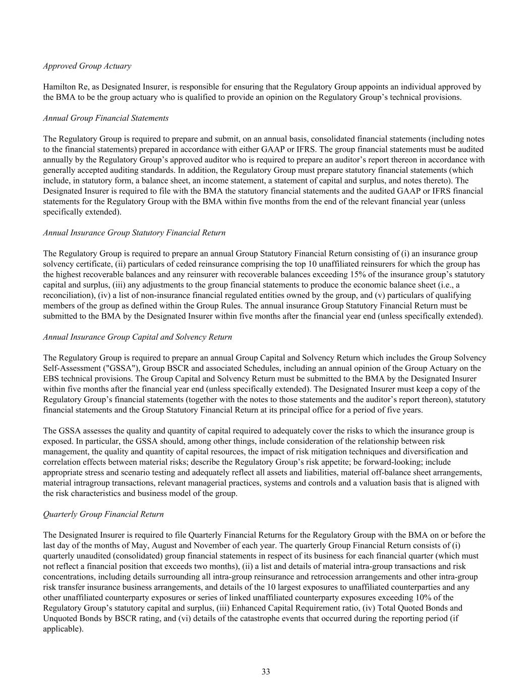 Approved Group Actuary Hamilton Re, as Designated Insurer, is responsible for ensuring that the Regulatory Group appoints an individual approved by the BMA to be the group actuary who is qualified to provide an opinion on the Regulatory Group’s technical provisions. Annual Group Financial Statements The Regulatory Group is required to prepare and submit, on an annual basis, consolidated financial statements (including notes to the financial statements) prepared in accordance with either GAAP or IFRS. The group financial statements must be audited annually by the Regulatory Group’s approved auditor who is required to prepare an auditor’s report thereon in accordance with generally accepted auditing standards. In addition, the Regulatory Group must prepare statutory financial statements (which include, in statutory form, a balance sheet, an income statement, a statement of capital and surplus, and notes thereto). The Designated Insurer is required to file with the BMA the statutory financial statements and the audited GAAP or IFRS financial statements for the Regulatory Group with the BMA within five months from the end of the relevant financial year (unless specifically extended). Annual Insurance Group Statutory Financial Return The Regulatory Group is required to prepare an annual Group Statutory Financial Return consisting of (i) an insurance group solvency certificate, (ii) particulars of ceded reinsurance comprising the top 10 unaffiliated reinsurers for which the group has the highest recoverable balances and any reinsurer with recoverable balances exceeding 15% of the insurance group’s statutory capital and surplus, (iii) any adjustments to the group financial statements to produce the economic balance sheet (i.e., a reconciliation), (iv) a list of non-insurance financial regulated entities owned by the group, and (v) particulars of qualifying members of the group as defined within the Group Rules. The annual insurance Group Statutory Financial Return must be submitted to the BMA by the Designated Insurer within five months after the financial year end (unless specifically extended). Annual Insurance Group Capital and Solvency Return The Regulatory Group is required to prepare an annual Group Capital and Solvency Return which includes the Group Solvency Self-Assessment ("GSSA"), Group BSCR and associated Schedules, including an annual opinion of the Group Actuary on the EBS technical provisions. The Group Capital and Solvency Return must be submitted to the BMA by the Designated Insurer within five months after the financial year end (unless specifically extended). The Designated Insurer must keep a copy of the Regulatory Group’s financial statements (together with the notes to those statements and the auditor’s report thereon), statutory financial statements and the Group Statutory Financial Return at its principal office for a period of five years. The GSSA assesses the quality and quantity of capital required to adequately cover the risks to which the insurance group is exposed. In particular, the GSSA should, among other things, include consideration of the relationship between risk management, the quality and quantity of capital resources, the impact of risk mitigation techniques and diversification and correlation effects between material risks; describe the Regulatory Group’s risk appetite; be forward-looking; include appropriate stress and scenario testing and adequately reflect all assets and liabilities, material off-balance sheet arrangements, material intragroup transactions, relevant managerial practices, systems and controls and a valuation basis that is aligned with the risk characteristics and business model of the group. Quarterly Group Financial Return The Designated Insurer is required to file Quarterly Financial Returns for the Regulatory Group with the BMA on or before the last day of the months of May, August and November of each year. The quarterly Group Financial Return consists of (i) quarterly unaudited (consolidated) group financial statements in respect of its business for each financial quarter (which must not reflect a financial position that exceeds two months), (ii) a list and details of material intra-group transactions and risk concentrations, including details surrounding all intra-group reinsurance and retrocession arrangements and other intra-group risk transfer insurance business arrangements, and details of the 10 largest exposures to unaffiliated counterparties and any other unaffiliated counterparty exposures or series of linked unaffiliated counterparty exposures exceeding 10% of the Regulatory Group’s statutory capital and surplus, (iii) Enhanced Capital Requirement ratio, (iv) Total Quoted Bonds and Unquoted Bonds by BSCR rating, and (vi) details of the catastrophe events that occurred during the reporting period (if applicable). 33