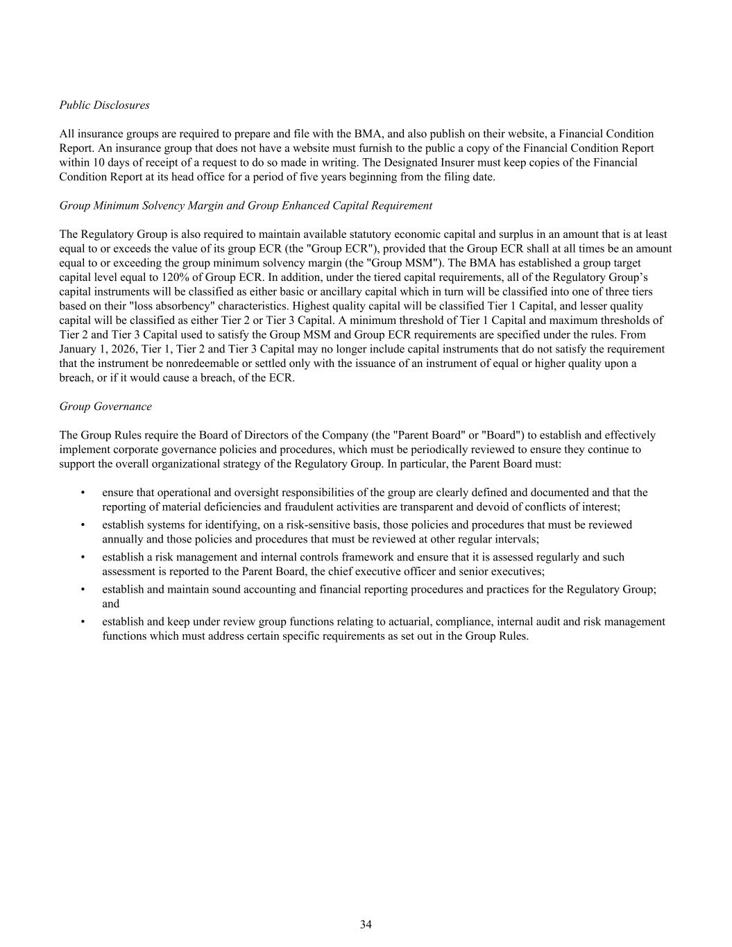 Public Disclosures All insurance groups are required to prepare and file with the BMA, and also publish on their website, a Financial Condition Report. An insurance group that does not have a website must furnish to the public a copy of the Financial Condition Report within 10 days of receipt of a request to do so made in writing. The Designated Insurer must keep copies of the Financial Condition Report at its head office for a period of five years beginning from the filing date. Group Minimum Solvency Margin and Group Enhanced Capital Requirement The Regulatory Group is also required to maintain available statutory economic capital and surplus in an amount that is at least equal to or exceeds the value of its group ECR (the "Group ECR"), provided that the Group ECR shall at all times be an amount equal to or exceeding the group minimum solvency margin (the "Group MSM"). The BMA has established a group target capital level equal to 120% of Group ECR. In addition, under the tiered capital requirements, all of the Regulatory Group’s capital instruments will be classified as either basic or ancillary capital which in turn will be classified into one of three tiers based on their "loss absorbency" characteristics. Highest quality capital will be classified Tier 1 Capital, and lesser quality capital will be classified as either Tier 2 or Tier 3 Capital. A minimum threshold of Tier 1 Capital and maximum thresholds of Tier 2 and Tier 3 Capital used to satisfy the Group MSM and Group ECR requirements are specified under the rules. From January 1, 2026, Tier 1, Tier 2 and Tier 3 Capital may no longer include capital instruments that do not satisfy the requirement that the instrument be nonredeemable or settled only with the issuance of an instrument of equal or higher quality upon a breach, or if it would cause a breach, of the ECR. Group Governance The Group Rules require the Board of Directors of the Company (the "Parent Board" or "Board") to establish and effectively implement corporate governance policies and procedures, which must be periodically reviewed to ensure they continue to support the overall organizational strategy of the Regulatory Group. In particular, the Parent Board must: • ensure that operational and oversight responsibilities of the group are clearly defined and documented and that the reporting of material deficiencies and fraudulent activities are transparent and devoid of conflicts of interest; • establish systems for identifying, on a risk-sensitive basis, those policies and procedures that must be reviewed annually and those policies and procedures that must be reviewed at other regular intervals; • establish a risk management and internal controls framework and ensure that it is assessed regularly and such assessment is reported to the Parent Board, the chief executive officer and senior executives; • establish and maintain sound accounting and financial reporting procedures and practices for the Regulatory Group; and • establish and keep under review group functions relating to actuarial, compliance, internal audit and risk management functions which must address certain specific requirements as set out in the Group Rules. 34