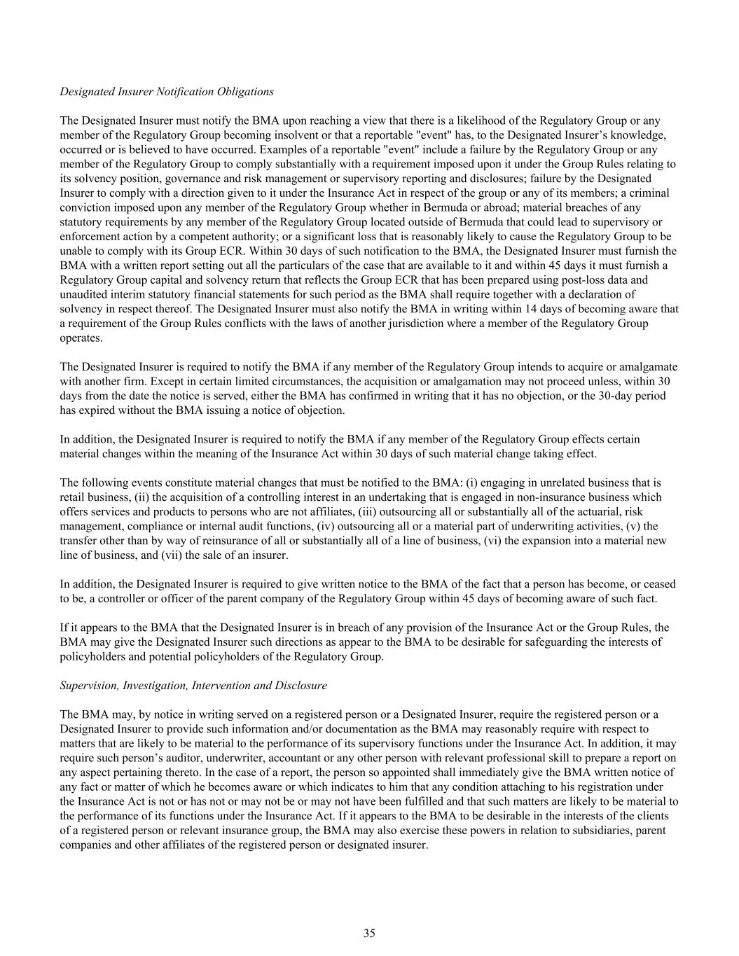 Designated Insurer Notification Obligations The Designated Insurer must notify the BMA upon reaching a view that there is a likelihood of the Regulatory Group or any member of the Regulatory Group becoming insolvent or that a reportable "event" has, to the Designated Insurer’s knowledge, occurred or is believed to have occurred. Examples of a reportable "event" include a failure by the Regulatory Group or any member of the Regulatory Group to comply substantially with a requirement imposed upon it under the Group Rules relating to its solvency position, governance and risk management or supervisory reporting and disclosures; failure by the Designated Insurer to comply with a direction given to it under the Insurance Act in respect of the group or any of its members; a criminal conviction imposed upon any member of the Regulatory Group whether in Bermuda or abroad; material breaches of any statutory requirements by any member of the Regulatory Group located outside of Bermuda that could lead to supervisory or enforcement action by a competent authority; or a significant loss that is reasonably likely to cause the Regulatory Group to be unable to comply with its Group ECR. Within 30 days of such notification to the BMA, the Designated Insurer must furnish the BMA with a written report setting out all the particulars of the case that are available to it and within 45 days it must furnish a Regulatory Group capital and solvency return that reflects the Group ECR that has been prepared using post-loss data and unaudited interim statutory financial statements for such period as the BMA shall require together with a declaration of solvency in respect thereof. The Designated Insurer must also notify the BMA in writing within 14 days of becoming aware that a requirement of the Group Rules conflicts with the laws of another jurisdiction where a member of the Regulatory Group operates. The Designated Insurer is required to notify the BMA if any member of the Regulatory Group intends to acquire or amalgamate with another firm. Except in certain limited circumstances, the acquisition or amalgamation may not proceed unless, within 30 days from the date the notice is served, either the BMA has confirmed in writing that it has no objection, or the 30-day period has expired without the BMA issuing a notice of objection. In addition, the Designated Insurer is required to notify the BMA if any member of the Regulatory Group effects certain material changes within the meaning of the Insurance Act within 30 days of such material change taking effect. The following events constitute material changes that must be notified to the BMA: (i) engaging in unrelated business that is retail business, (ii) the acquisition of a controlling interest in an undertaking that is engaged in non-insurance business which offers services and products to persons who are not affiliates, (iii) outsourcing all or substantially all of the actuarial, risk management, compliance or internal audit functions, (iv) outsourcing all or a material part of underwriting activities, (v) the transfer other than by way of reinsurance of all or substantially all of a line of business, (vi) the expansion into a material new line of business, and (vii) the sale of an insurer. In addition, the Designated Insurer is required to give written notice to the BMA of the fact that a person has become, or ceased to be, a controller or officer of the parent company of the Regulatory Group within 45 days of becoming aware of such fact. If it appears to the BMA that the Designated Insurer is in breach of any provision of the Insurance Act or the Group Rules, the BMA may give the Designated Insurer such directions as appear to the BMA to be desirable for safeguarding the interests of policyholders and potential policyholders of the Regulatory Group. Supervision, Investigation, Intervention and Disclosure The BMA may, by notice in writing served on a registered person or a Designated Insurer, require the registered person or a Designated Insurer to provide such information and/or documentation as the BMA may reasonably require with respect to matters that are likely to be material to the performance of its supervisory functions under the Insurance Act. In addition, it may require such person’s auditor, underwriter, accountant or any other person with relevant professional skill to prepare a report on any aspect pertaining thereto. In the case of a report, the person so appointed shall immediately give the BMA written notice of any fact or matter of which he becomes aware or which indicates to him that any condition attaching to his registration under the Insurance Act is not or has not or may not be or may not have been fulfilled and that such matters are likely to be material to the performance of its functions under the Insurance Act. If it appears to the BMA to be desirable in the interests of the clients of a registered person or relevant insurance group, the BMA may also exercise these powers in relation to subsidiaries, parent companies and other affiliates of the registered person or designated insurer. 35