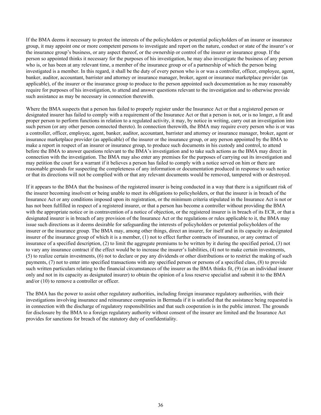 If the BMA deems it necessary to protect the interests of the policyholders or potential policyholders of an insurer or insurance group, it may appoint one or more competent persons to investigate and report on the nature, conduct or state of the insurer’s or the insurance group’s business, or any aspect thereof, or the ownership or control of the insurer or insurance group. If the person so appointed thinks it necessary for the purposes of his investigation, he may also investigate the business of any person who is, or has been at any relevant time, a member of the insurance group or of a partnership of which the person being investigated is a member. In this regard, it shall be the duty of every person who is or was a controller, officer, employee, agent, banker, auditor, accountant, barrister and attorney or insurance manager, broker, agent or insurance marketplace provider (as applicable), of the insurer or the insurance group to produce to the person appointed such documentation as he may reasonably require for purposes of his investigation, to attend and answer questions relevant to the investigation and to otherwise provide such assistance as may be necessary in connection therewith. Where the BMA suspects that a person has failed to properly register under the Insurance Act or that a registered person or designated insurer has failed to comply with a requirement of the Insurance Act or that a person is not, or is no longer, a fit and proper person to perform functions in relation to a regulated activity, it may, by notice in writing, carry out an investigation into such person (or any other person connected thereto). In connection therewith, the BMA may require every person who is or was a controller, officer, employee, agent, banker, auditor, accountant, barrister and attorney or insurance manager, broker, agent or insurance marketplace provider (as applicable) of the insurer or the insurance group, or any person appointed by the BMA to make a report in respect of an insurer or insurance group, to produce such documents in his custody and control, to attend before the BMA to answer questions relevant to the BMA’s investigation and to take such actions as the BMA may direct in connection with the investigation. The BMA may also enter any premises for the purposes of carrying out its investigation and may petition the court for a warrant if it believes a person has failed to comply with a notice served on him or there are reasonable grounds for suspecting the completeness of any information or documentation produced in response to such notice or that its directions will not be complied with or that any relevant documents would be removed, tampered with or destroyed. If it appears to the BMA that the business of the registered insurer is being conducted in a way that there is a significant risk of the insurer becoming insolvent or being unable to meet its obligations to policyholders, or that the insurer is in breach of the Insurance Act or any conditions imposed upon its registration, or the minimum criteria stipulated in the Insurance Act is not or has not been fulfilled in respect of a registered insurer, or that a person has become a controller without providing the BMA with the appropriate notice or in contravention of a notice of objection, or the registered insurer is in breach of its ECR, or that a designated insurer is in breach of any provision of the Insurance Act or the regulations or rules applicable to it, the BMA may issue such directions as it deems desirable for safeguarding the interests of policyholders or potential policyholders of the insurer or the insurance group. The BMA may, among other things, direct an insurer, for itself and in its capacity as designated insurer of the insurance group of which it is a member, (1) not to effect further contracts of insurance, or any contract of insurance of a specified description, (2) to limit the aggregate premiums to be written by it during the specified period, (3) not to vary any insurance contract if the effect would be to increase the insurer’s liabilities, (4) not to make certain investments, (5) to realize certain investments, (6) not to declare or pay any dividends or other distributions or to restrict the making of such payments, (7) not to enter into specified transactions with any specified person or persons of a specified class, (8) to provide such written particulars relating to the financial circumstances of the insurer as the BMA thinks fit, (9) (as an individual insurer only and not in its capacity as designated insurer) to obtain the opinion of a loss reserve specialist and submit it to the BMA and/or (10) to remove a controller or officer. The BMA has the power to assist other regulatory authorities, including foreign insurance regulatory authorities, with their investigations involving insurance and reinsurance companies in Bermuda if it is satisfied that the assistance being requested is in connection with the discharge of regulatory responsibilities and that such cooperation is in the public interest. The grounds for disclosure by the BMA to a foreign regulatory authority without consent of the insurer are limited and the Insurance Act provides for sanctions for breach of the statutory duty of confidentiality. 36