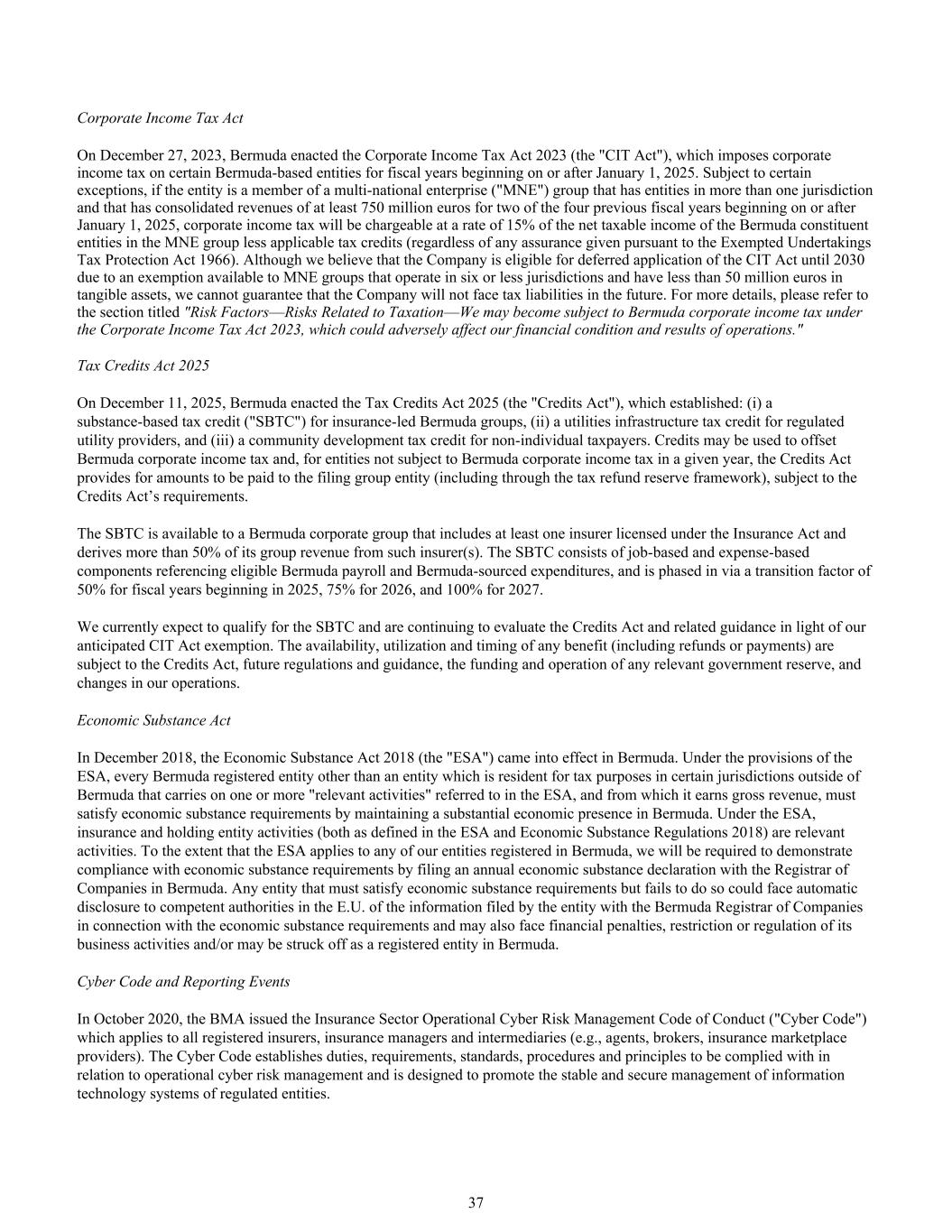 Corporate Income Tax Act On December 27, 2023, Bermuda enacted the Corporate Income Tax Act 2023 (the "CIT Act"), which imposes corporate income tax on certain Bermuda-based entities for fiscal years beginning on or after January 1, 2025. Subject to certain exceptions, if the entity is a member of a multi-national enterprise ("MNE") group that has entities in more than one jurisdiction and that has consolidated revenues of at least 750 million euros for two of the four previous fiscal years beginning on or after January 1, 2025, corporate income tax will be chargeable at a rate of 15% of the net taxable income of the Bermuda constituent entities in the MNE group less applicable tax credits (regardless of any assurance given pursuant to the Exempted Undertakings Tax Protection Act 1966). Although we believe that the Company is eligible for deferred application of the CIT Act until 2030 due to an exemption available to MNE groups that operate in six or less jurisdictions and have less than 50 million euros in tangible assets, we cannot guarantee that the Company will not face tax liabilities in the future. For more details, please refer to the section titled "Risk Factors––Risks Related to Taxation––We may become subject to Bermuda corporate income tax under the Corporate Income Tax Act 2023, which could adversely affect our financial condition and results of operations." Tax Credits Act 2025 On December 11, 2025, Bermuda enacted the Tax Credits Act 2025 (the "Credits Act"), which established: (i) a substance-based tax credit ("SBTC") for insurance-led Bermuda groups, (ii) a utilities infrastructure tax credit for regulated utility providers, and (iii) a community development tax credit for non-individual taxpayers. Credits may be used to offset Bermuda corporate income tax and, for entities not subject to Bermuda corporate income tax in a given year, the Credits Act provides for amounts to be paid to the filing group entity (including through the tax refund reserve framework), subject to the Credits Act’s requirements. The SBTC is available to a Bermuda corporate group that includes at least one insurer licensed under the Insurance Act and derives more than 50% of its group revenue from such insurer(s). The SBTC consists of job-based and expense-based components referencing eligible Bermuda payroll and Bermuda-sourced expenditures, and is phased in via a transition factor of 50% for fiscal years beginning in 2025, 75% for 2026, and 100% for 2027. We currently expect to qualify for the SBTC and are continuing to evaluate the Credits Act and related guidance in light of our anticipated CIT Act exemption. The availability, utilization and timing of any benefit (including refunds or payments) are subject to the Credits Act, future regulations and guidance, the funding and operation of any relevant government reserve, and changes in our operations. Economic Substance Act In December 2018, the Economic Substance Act 2018 (the "ESA") came into effect in Bermuda. Under the provisions of the ESA, every Bermuda registered entity other than an entity which is resident for tax purposes in certain jurisdictions outside of Bermuda that carries on one or more "relevant activities" referred to in the ESA, and from which it earns gross revenue, must satisfy economic substance requirements by maintaining a substantial economic presence in Bermuda. Under the ESA, insurance and holding entity activities (both as defined in the ESA and Economic Substance Regulations 2018) are relevant activities. To the extent that the ESA applies to any of our entities registered in Bermuda, we will be required to demonstrate compliance with economic substance requirements by filing an annual economic substance declaration with the Registrar of Companies in Bermuda. Any entity that must satisfy economic substance requirements but fails to do so could face automatic disclosure to competent authorities in the E.U. of the information filed by the entity with the Bermuda Registrar of Companies in connection with the economic substance requirements and may also face financial penalties, restriction or regulation of its business activities and/or may be struck off as a registered entity in Bermuda. Cyber Code and Reporting Events In October 2020, the BMA issued the Insurance Sector Operational Cyber Risk Management Code of Conduct ("Cyber Code") which applies to all registered insurers, insurance managers and intermediaries (e.g., agents, brokers, insurance marketplace providers). The Cyber Code establishes duties, requirements, standards, procedures and principles to be complied with in relation to operational cyber risk management and is designed to promote the stable and secure management of information technology systems of regulated entities. 37