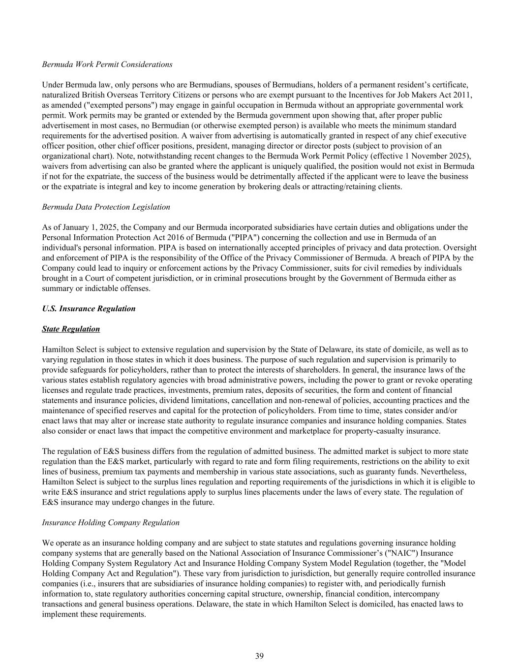 Bermuda Work Permit Considerations Under Bermuda law, only persons who are Bermudians, spouses of Bermudians, holders of a permanent resident’s certificate, naturalized British Overseas Territory Citizens or persons who are exempt pursuant to the Incentives for Job Makers Act 2011, as amended ("exempted persons") may engage in gainful occupation in Bermuda without an appropriate governmental work permit. Work permits may be granted or extended by the Bermuda government upon showing that, after proper public advertisement in most cases, no Bermudian (or otherwise exempted person) is available who meets the minimum standard requirements for the advertised position. A waiver from advertising is automatically granted in respect of any chief executive officer position, other chief officer positions, president, managing director or director posts (subject to provision of an organizational chart). Note, notwithstanding recent changes to the Bermuda Work Permit Policy (effective 1 November 2025), waivers from advertising can also be granted where the applicant is uniquely qualified, the position would not exist in Bermuda if not for the expatriate, the success of the business would be detrimentally affected if the applicant were to leave the business or the expatriate is integral and key to income generation by brokering deals or attracting/retaining clients. Bermuda Data Protection Legislation As of January 1, 2025, the Company and our Bermuda incorporated subsidiaries have certain duties and obligations under the Personal Information Protection Act 2016 of Bermuda ("PIPA") concerning the collection and use in Bermuda of an individual's personal information. PIPA is based on internationally accepted principles of privacy and data protection. Oversight and enforcement of PIPA is the responsibility of the Office of the Privacy Commissioner of Bermuda. A breach of PIPA by the Company could lead to inquiry or enforcement actions by the Privacy Commissioner, suits for civil remedies by individuals brought in a Court of competent jurisdiction, or in criminal prosecutions brought by the Government of Bermuda either as summary or indictable offenses. U.S. Insurance Regulation State Regulation Hamilton Select is subject to extensive regulation and supervision by the State of Delaware, its state of domicile, as well as to varying regulation in those states in which it does business. The purpose of such regulation and supervision is primarily to provide safeguards for policyholders, rather than to protect the interests of shareholders. In general, the insurance laws of the various states establish regulatory agencies with broad administrative powers, including the power to grant or revoke operating licenses and regulate trade practices, investments, premium rates, deposits of securities, the form and content of financial statements and insurance policies, dividend limitations, cancellation and non-renewal of policies, accounting practices and the maintenance of specified reserves and capital for the protection of policyholders. From time to time, states consider and/or enact laws that may alter or increase state authority to regulate insurance companies and insurance holding companies. States also consider or enact laws that impact the competitive environment and marketplace for property-casualty insurance. The regulation of E&S business differs from the regulation of admitted business. The admitted market is subject to more state regulation than the E&S market, particularly with regard to rate and form filing requirements, restrictions on the ability to exit lines of business, premium tax payments and membership in various state associations, such as guaranty funds. Nevertheless, Hamilton Select is subject to the surplus lines regulation and reporting requirements of the jurisdictions in which it is eligible to write E&S insurance and strict regulations apply to surplus lines placements under the laws of every state. The regulation of E&S insurance may undergo changes in the future. Insurance Holding Company Regulation We operate as an insurance holding company and are subject to state statutes and regulations governing insurance holding company systems that are generally based on the National Association of Insurance Commissioner’s ("NAIC") Insurance Holding Company System Regulatory Act and Insurance Holding Company System Model Regulation (together, the "Model Holding Company Act and Regulation"). These vary from jurisdiction to jurisdiction, but generally require controlled insurance companies (i.e., insurers that are subsidiaries of insurance holding companies) to register with, and periodically furnish information to, state regulatory authorities concerning capital structure, ownership, financial condition, intercompany transactions and general business operations. Delaware, the state in which Hamilton Select is domiciled, has enacted laws to implement these requirements. 39