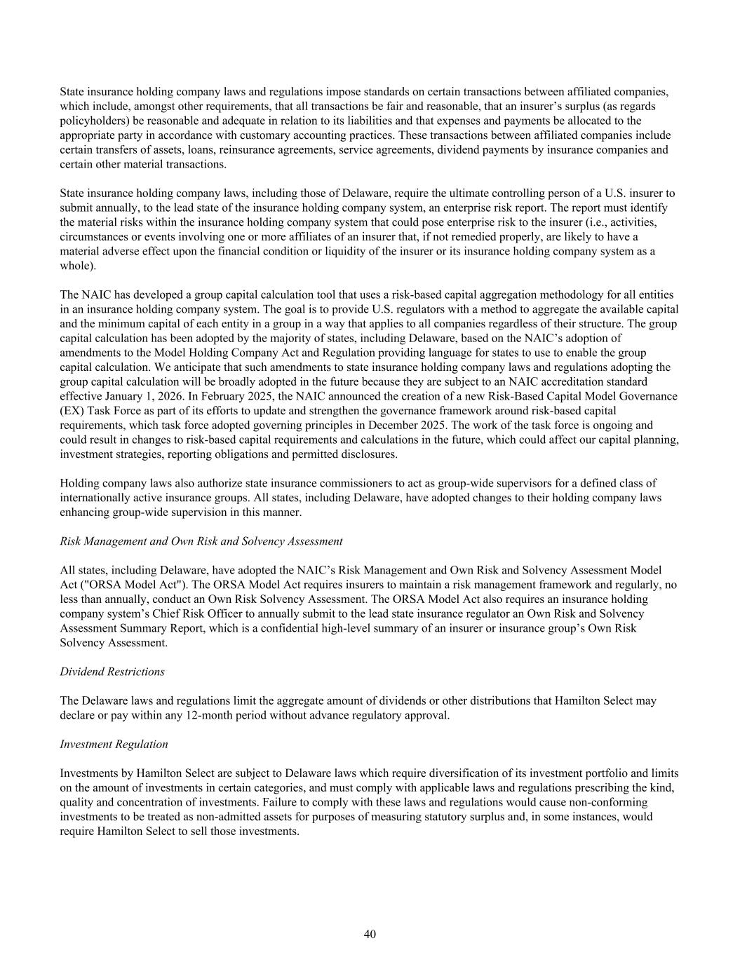 State insurance holding company laws and regulations impose standards on certain transactions between affiliated companies, which include, amongst other requirements, that all transactions be fair and reasonable, that an insurer’s surplus (as regards policyholders) be reasonable and adequate in relation to its liabilities and that expenses and payments be allocated to the appropriate party in accordance with customary accounting practices. These transactions between affiliated companies include certain transfers of assets, loans, reinsurance agreements, service agreements, dividend payments by insurance companies and certain other material transactions. State insurance holding company laws, including those of Delaware, require the ultimate controlling person of a U.S. insurer to submit annually, to the lead state of the insurance holding company system, an enterprise risk report. The report must identify the material risks within the insurance holding company system that could pose enterprise risk to the insurer (i.e., activities, circumstances or events involving one or more affiliates of an insurer that, if not remedied properly, are likely to have a material adverse effect upon the financial condition or liquidity of the insurer or its insurance holding company system as a whole). The NAIC has developed a group capital calculation tool that uses a risk-based capital aggregation methodology for all entities in an insurance holding company system. The goal is to provide U.S. regulators with a method to aggregate the available capital and the minimum capital of each entity in a group in a way that applies to all companies regardless of their structure. The group capital calculation has been adopted by the majority of states, including Delaware, based on the NAIC’s adoption of amendments to the Model Holding Company Act and Regulation providing language for states to use to enable the group capital calculation. We anticipate that such amendments to state insurance holding company laws and regulations adopting the group capital calculation will be broadly adopted in the future because they are subject to an NAIC accreditation standard effective January 1, 2026. In February 2025, the NAIC announced the creation of a new Risk-Based Capital Model Governance (EX) Task Force as part of its efforts to update and strengthen the governance framework around risk-based capital requirements, which task force adopted governing principles in December 2025. The work of the task force is ongoing and could result in changes to risk-based capital requirements and calculations in the future, which could affect our capital planning, investment strategies, reporting obligations and permitted disclosures. Holding company laws also authorize state insurance commissioners to act as group-wide supervisors for a defined class of internationally active insurance groups. All states, including Delaware, have adopted changes to their holding company laws enhancing group-wide supervision in this manner. Risk Management and Own Risk and Solvency Assessment All states, including Delaware, have adopted the NAIC’s Risk Management and Own Risk and Solvency Assessment Model Act ("ORSA Model Act"). The ORSA Model Act requires insurers to maintain a risk management framework and regularly, no less than annually, conduct an Own Risk Solvency Assessment. The ORSA Model Act also requires an insurance holding company system’s Chief Risk Officer to annually submit to the lead state insurance regulator an Own Risk and Solvency Assessment Summary Report, which is a confidential high-level summary of an insurer or insurance group’s Own Risk Solvency Assessment. Dividend Restrictions The Delaware laws and regulations limit the aggregate amount of dividends or other distributions that Hamilton Select may declare or pay within any 12-month period without advance regulatory approval. Investment Regulation Investments by Hamilton Select are subject to Delaware laws which require diversification of its investment portfolio and limits on the amount of investments in certain categories, and must comply with applicable laws and regulations prescribing the kind, quality and concentration of investments. Failure to comply with these laws and regulations would cause non-conforming investments to be treated as non-admitted assets for purposes of measuring statutory surplus and, in some instances, would require Hamilton Select to sell those investments. 40
