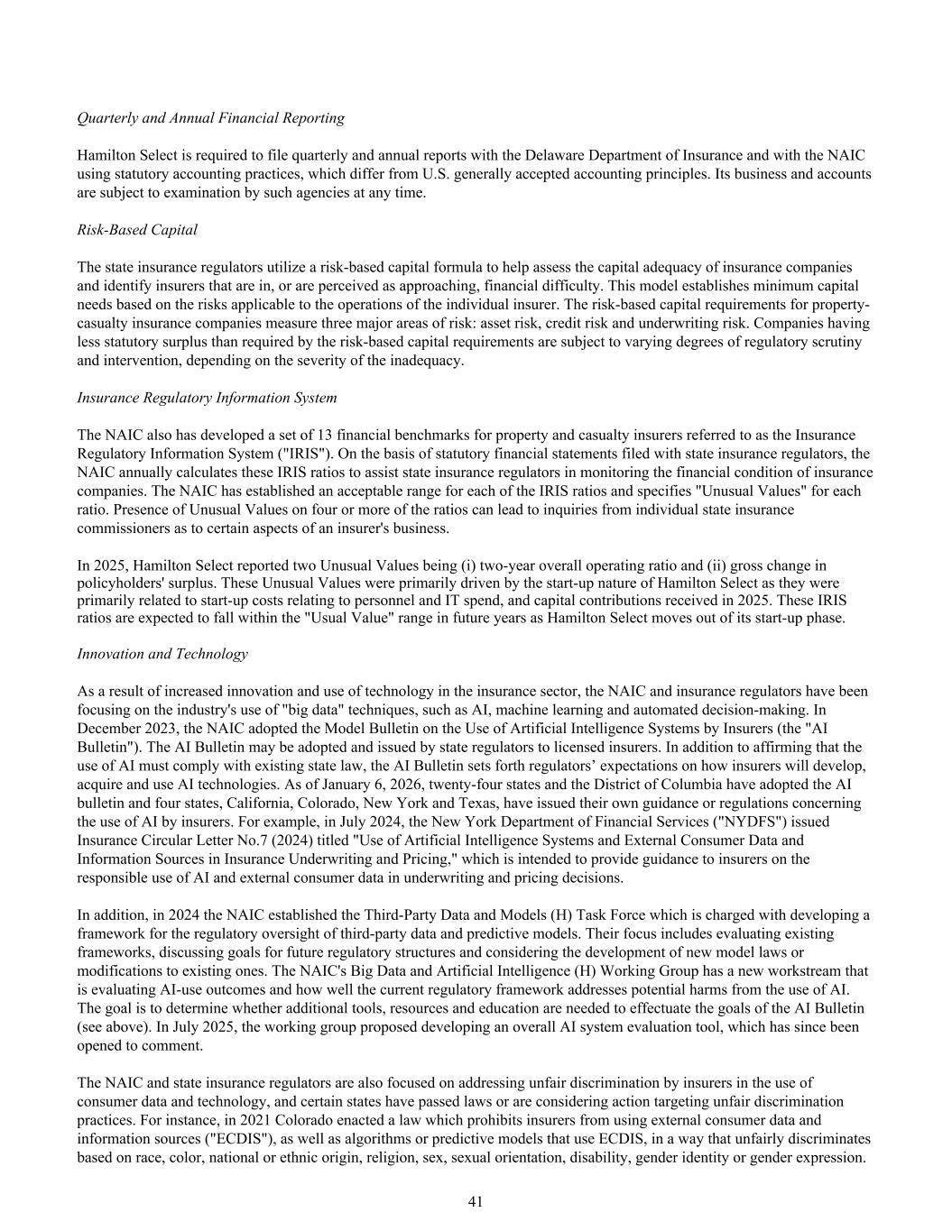 Quarterly and Annual Financial Reporting Hamilton Select is required to file quarterly and annual reports with the Delaware Department of Insurance and with the NAIC using statutory accounting practices, which differ from U.S. generally accepted accounting principles. Its business and accounts are subject to examination by such agencies at any time. Risk-Based Capital The state insurance regulators utilize a risk-based capital formula to help assess the capital adequacy of insurance companies and identify insurers that are in, or are perceived as approaching, financial difficulty. This model establishes minimum capital needs based on the risks applicable to the operations of the individual insurer. The risk-based capital requirements for property- casualty insurance companies measure three major areas of risk: asset risk, credit risk and underwriting risk. Companies having less statutory surplus than required by the risk-based capital requirements are subject to varying degrees of regulatory scrutiny and intervention, depending on the severity of the inadequacy. Insurance Regulatory Information System The NAIC also has developed a set of 13 financial benchmarks for property and casualty insurers referred to as the Insurance Regulatory Information System ("IRIS"). On the basis of statutory financial statements filed with state insurance regulators, the NAIC annually calculates these IRIS ratios to assist state insurance regulators in monitoring the financial condition of insurance companies. The NAIC has established an acceptable range for each of the IRIS ratios and specifies "Unusual Values" for each ratio. Presence of Unusual Values on four or more of the ratios can lead to inquiries from individual state insurance commissioners as to certain aspects of an insurer's business. In 2025, Hamilton Select reported two Unusual Values being (i) two-year overall operating ratio and (ii) gross change in policyholders' surplus. These Unusual Values were primarily driven by the start-up nature of Hamilton Select as they were primarily related to start-up costs relating to personnel and IT spend, and capital contributions received in 2025. These IRIS ratios are expected to fall within the "Usual Value" range in future years as Hamilton Select moves out of its start-up phase. Innovation and Technology As a result of increased innovation and use of technology in the insurance sector, the NAIC and insurance regulators have been focusing on the industry's use of "big data" techniques, such as AI, machine learning and automated decision-making. In December 2023, the NAIC adopted the Model Bulletin on the Use of Artificial Intelligence Systems by Insurers (the "AI Bulletin"). The AI Bulletin may be adopted and issued by state regulators to licensed insurers. In addition to affirming that the use of AI must comply with existing state law, the AI Bulletin sets forth regulators’ expectations on how insurers will develop, acquire and use AI technologies. As of January 6, 2026, twenty-four states and the District of Columbia have adopted the AI bulletin and four states, California, Colorado, New York and Texas, have issued their own guidance or regulations concerning the use of AI by insurers. For example, in July 2024, the New York Department of Financial Services ("NYDFS") issued Insurance Circular Letter No.7 (2024) titled "Use of Artificial Intelligence Systems and External Consumer Data and Information Sources in Insurance Underwriting and Pricing," which is intended to provide guidance to insurers on the responsible use of AI and external consumer data in underwriting and pricing decisions. In addition, in 2024 the NAIC established the Third-Party Data and Models (H) Task Force which is charged with developing a framework for the regulatory oversight of third-party data and predictive models. Their focus includes evaluating existing frameworks, discussing goals for future regulatory structures and considering the development of new model laws or modifications to existing ones. The NAIC's Big Data and Artificial Intelligence (H) Working Group has a new workstream that is evaluating AI-use outcomes and how well the current regulatory framework addresses potential harms from the use of AI. The goal is to determine whether additional tools, resources and education are needed to effectuate the goals of the AI Bulletin (see above). In July 2025, the working group proposed developing an overall AI system evaluation tool, which has since been opened to comment. The NAIC and state insurance regulators are also focused on addressing unfair discrimination by insurers in the use of consumer data and technology, and certain states have passed laws or are considering action targeting unfair discrimination practices. For instance, in 2021 Colorado enacted a law which prohibits insurers from using external consumer data and information sources ("ECDIS"), as well as algorithms or predictive models that use ECDIS, in a way that unfairly discriminates based on race, color, national or ethnic origin, religion, sex, sexual orientation, disability, gender identity or gender expression. 41