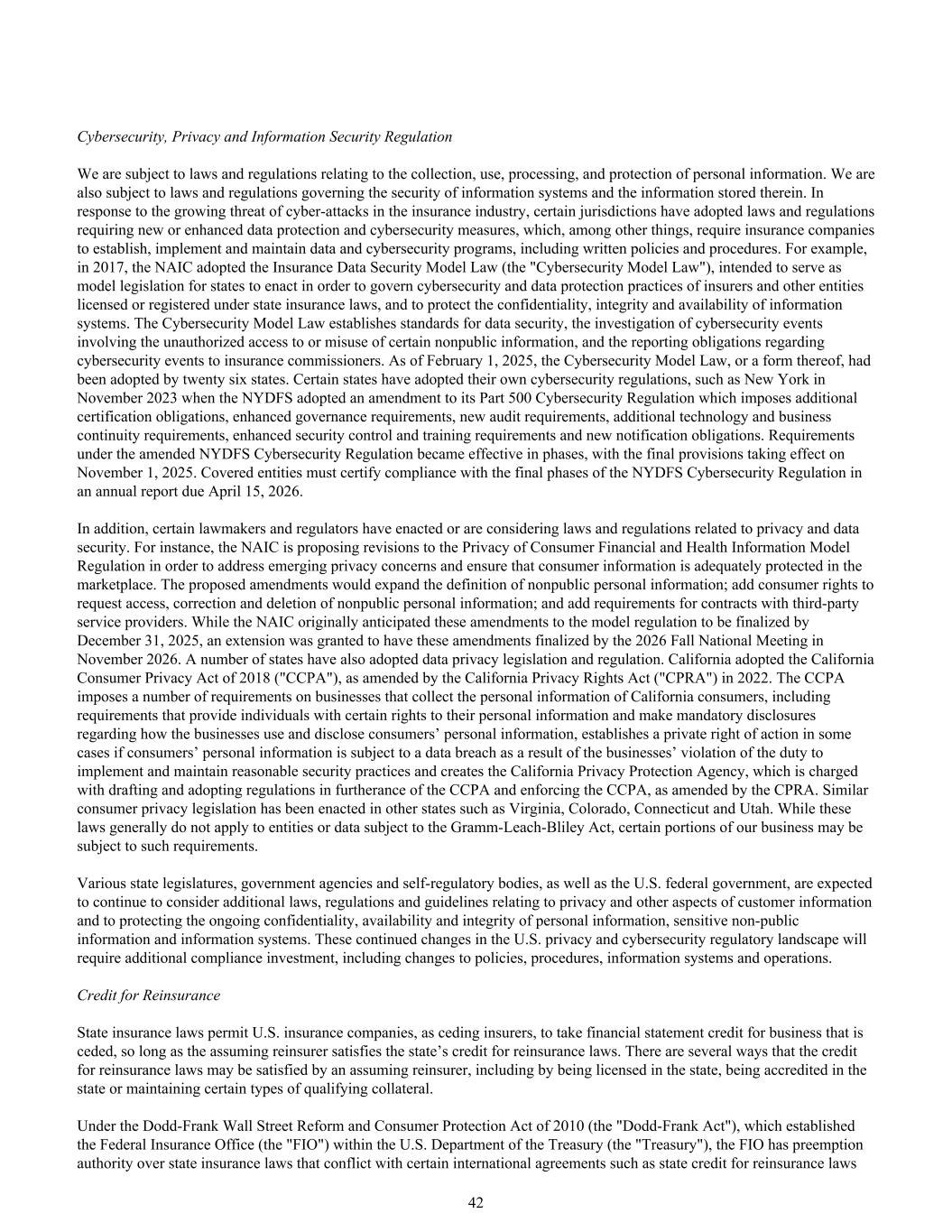 Cybersecurity, Privacy and Information Security Regulation We are subject to laws and regulations relating to the collection, use, processing, and protection of personal information. We are also subject to laws and regulations governing the security of information systems and the information stored therein. In response to the growing threat of cyber-attacks in the insurance industry, certain jurisdictions have adopted laws and regulations requiring new or enhanced data protection and cybersecurity measures, which, among other things, require insurance companies to establish, implement and maintain data and cybersecurity programs, including written policies and procedures. For example, in 2017, the NAIC adopted the Insurance Data Security Model Law (the "Cybersecurity Model Law"), intended to serve as model legislation for states to enact in order to govern cybersecurity and data protection practices of insurers and other entities licensed or registered under state insurance laws, and to protect the confidentiality, integrity and availability of information systems. The Cybersecurity Model Law establishes standards for data security, the investigation of cybersecurity events involving the unauthorized access to or misuse of certain nonpublic information, and the reporting obligations regarding cybersecurity events to insurance commissioners. As of February 1, 2025, the Cybersecurity Model Law, or a form thereof, had been adopted by twenty six states. Certain states have adopted their own cybersecurity regulations, such as New York in November 2023 when the NYDFS adopted an amendment to its Part 500 Cybersecurity Regulation which imposes additional certification obligations, enhanced governance requirements, new audit requirements, additional technology and business continuity requirements, enhanced security control and training requirements and new notification obligations. Requirements under the amended NYDFS Cybersecurity Regulation became effective in phases, with the final provisions taking effect on November 1, 2025. Covered entities must certify compliance with the final phases of the NYDFS Cybersecurity Regulation in an annual report due April 15, 2026. In addition, certain lawmakers and regulators have enacted or are considering laws and regulations related to privacy and data security. For instance, the NAIC is proposing revisions to the Privacy of Consumer Financial and Health Information Model Regulation in order to address emerging privacy concerns and ensure that consumer information is adequately protected in the marketplace. The proposed amendments would expand the definition of nonpublic personal information; add consumer rights to request access, correction and deletion of nonpublic personal information; and add requirements for contracts with third-party service providers. While the NAIC originally anticipated these amendments to the model regulation to be finalized by December 31, 2025, an extension was granted to have these amendments finalized by the 2026 Fall National Meeting in November 2026. A number of states have also adopted data privacy legislation and regulation. California adopted the California Consumer Privacy Act of 2018 ("CCPA"), as amended by the California Privacy Rights Act ("CPRA") in 2022. The CCPA imposes a number of requirements on businesses that collect the personal information of California consumers, including requirements that provide individuals with certain rights to their personal information and make mandatory disclosures regarding how the businesses use and disclose consumers’ personal information, establishes a private right of action in some cases if consumers’ personal information is subject to a data breach as a result of the businesses’ violation of the duty to implement and maintain reasonable security practices and creates the California Privacy Protection Agency, which is charged with drafting and adopting regulations in furtherance of the CCPA and enforcing the CCPA, as amended by the CPRA. Similar consumer privacy legislation has been enacted in other states such as Virginia, Colorado, Connecticut and Utah. While these laws generally do not apply to entities or data subject to the Gramm-Leach-Bliley Act, certain portions of our business may be subject to such requirements. Various state legislatures, government agencies and self-regulatory bodies, as well as the U.S. federal government, are expected to continue to consider additional laws, regulations and guidelines relating to privacy and other aspects of customer information and to protecting the ongoing confidentiality, availability and integrity of personal information, sensitive non-public information and information systems. These continued changes in the U.S. privacy and cybersecurity regulatory landscape will require additional compliance investment, including changes to policies, procedures, information systems and operations. Credit for Reinsurance State insurance laws permit U.S. insurance companies, as ceding insurers, to take financial statement credit for business that is ceded, so long as the assuming reinsurer satisfies the state’s credit for reinsurance laws. There are several ways that the credit for reinsurance laws may be satisfied by an assuming reinsurer, including by being licensed in the state, being accredited in the state or maintaining certain types of qualifying collateral. Under the Dodd-Frank Wall Street Reform and Consumer Protection Act of 2010 (the "Dodd-Frank Act"), which established the Federal Insurance Office (the "FIO") within the U.S. Department of the Treasury (the "Treasury"), the FIO has preemption authority over state insurance laws that conflict with certain international agreements such as state credit for reinsurance laws 42