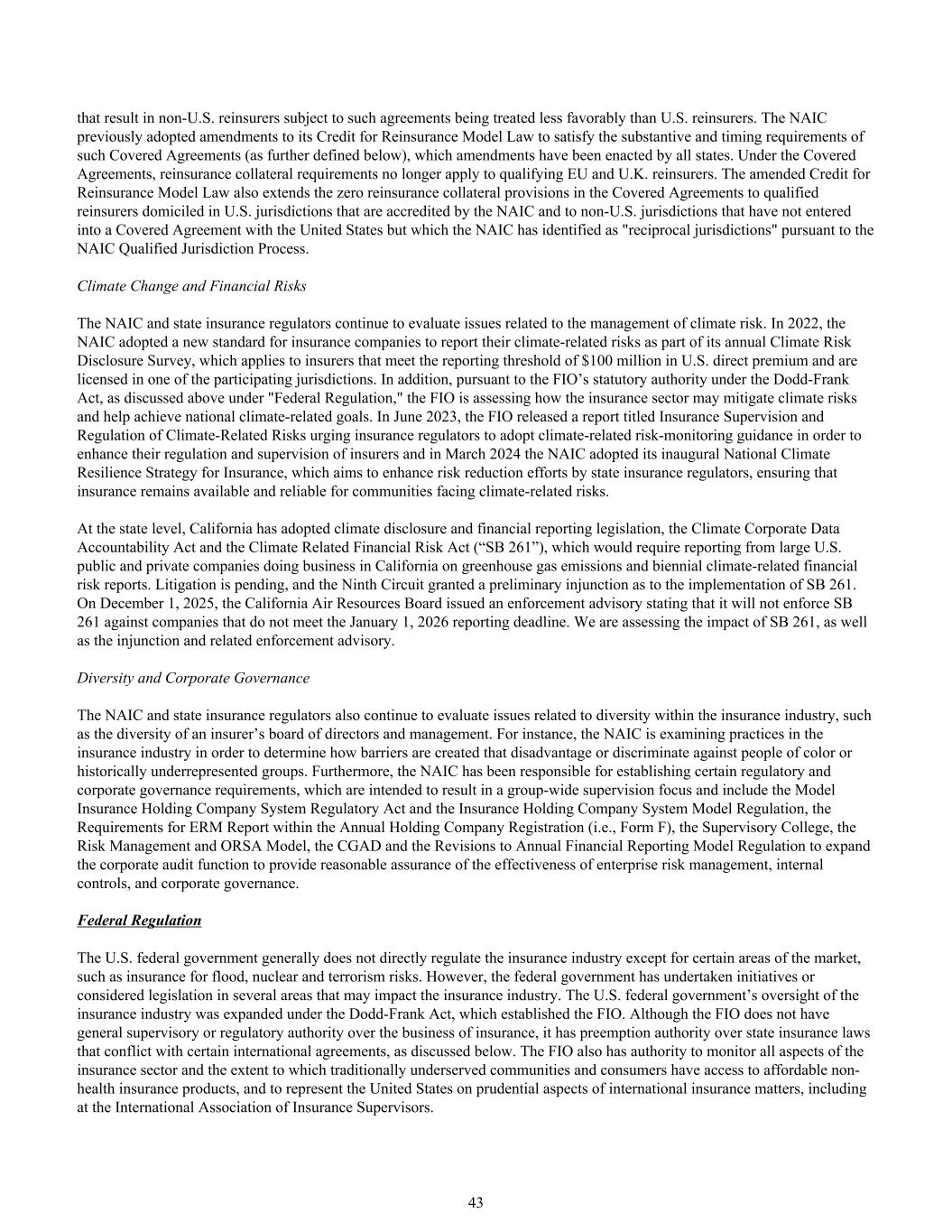 that result in non-U.S. reinsurers subject to such agreements being treated less favorably than U.S. reinsurers. The NAIC previously adopted amendments to its Credit for Reinsurance Model Law to satisfy the substantive and timing requirements of such Covered Agreements (as further defined below), which amendments have been enacted by all states. Under the Covered Agreements, reinsurance collateral requirements no longer apply to qualifying EU and U.K. reinsurers. The amended Credit for Reinsurance Model Law also extends the zero reinsurance collateral provisions in the Covered Agreements to qualified reinsurers domiciled in U.S. jurisdictions that are accredited by the NAIC and to non-U.S. jurisdictions that have not entered into a Covered Agreement with the United States but which the NAIC has identified as "reciprocal jurisdictions" pursuant to the NAIC Qualified Jurisdiction Process. Climate Change and Financial Risks The NAIC and state insurance regulators continue to evaluate issues related to the management of climate risk. In 2022, the NAIC adopted a new standard for insurance companies to report their climate-related risks as part of its annual Climate Risk Disclosure Survey, which applies to insurers that meet the reporting threshold of $100 million in U.S. direct premium and are licensed in one of the participating jurisdictions. In addition, pursuant to the FIO’s statutory authority under the Dodd-Frank Act, as discussed above under "Federal Regulation," the FIO is assessing how the insurance sector may mitigate climate risks and help achieve national climate-related goals. In June 2023, the FIO released a report titled Insurance Supervision and Regulation of Climate-Related Risks urging insurance regulators to adopt climate-related risk-monitoring guidance in order to enhance their regulation and supervision of insurers and in March 2024 the NAIC adopted its inaugural National Climate Resilience Strategy for Insurance, which aims to enhance risk reduction efforts by state insurance regulators, ensuring that insurance remains available and reliable for communities facing climate-related risks. At the state level, California has adopted climate disclosure and financial reporting legislation, the Climate Corporate Data Accountability Act and the Climate Related Financial Risk Act (“SB 261”), which would require reporting from large U.S. public and private companies doing business in California on greenhouse gas emissions and biennial climate-related financial risk reports. Litigation is pending, and the Ninth Circuit granted a preliminary injunction as to the implementation of SB 261. On December 1, 2025, the California Air Resources Board issued an enforcement advisory stating that it will not enforce SB 261 against companies that do not meet the January 1, 2026 reporting deadline. We are assessing the impact of SB 261, as well as the injunction and related enforcement advisory. Diversity and Corporate Governance The NAIC and state insurance regulators also continue to evaluate issues related to diversity within the insurance industry, such as the diversity of an insurer’s board of directors and management. For instance, the NAIC is examining practices in the insurance industry in order to determine how barriers are created that disadvantage or discriminate against people of color or historically underrepresented groups. Furthermore, the NAIC has been responsible for establishing certain regulatory and corporate governance requirements, which are intended to result in a group-wide supervision focus and include the Model Insurance Holding Company System Regulatory Act and the Insurance Holding Company System Model Regulation, the Requirements for ERM Report within the Annual Holding Company Registration (i.e., Form F), the Supervisory College, the Risk Management and ORSA Model, the CGAD and the Revisions to Annual Financial Reporting Model Regulation to expand the corporate audit function to provide reasonable assurance of the effectiveness of enterprise risk management, internal controls, and corporate governance. Federal Regulation The U.S. federal government generally does not directly regulate the insurance industry except for certain areas of the market, such as insurance for flood, nuclear and terrorism risks. However, the federal government has undertaken initiatives or considered legislation in several areas that may impact the insurance industry. The U.S. federal government’s oversight of the insurance industry was expanded under the Dodd-Frank Act, which established the FIO. Although the FIO does not have general supervisory or regulatory authority over the business of insurance, it has preemption authority over state insurance laws that conflict with certain international agreements, as discussed below. The FIO also has authority to monitor all aspects of the insurance sector and the extent to which traditionally underserved communities and consumers have access to affordable non- health insurance products, and to represent the United States on prudential aspects of international insurance matters, including at the International Association of Insurance Supervisors. 43