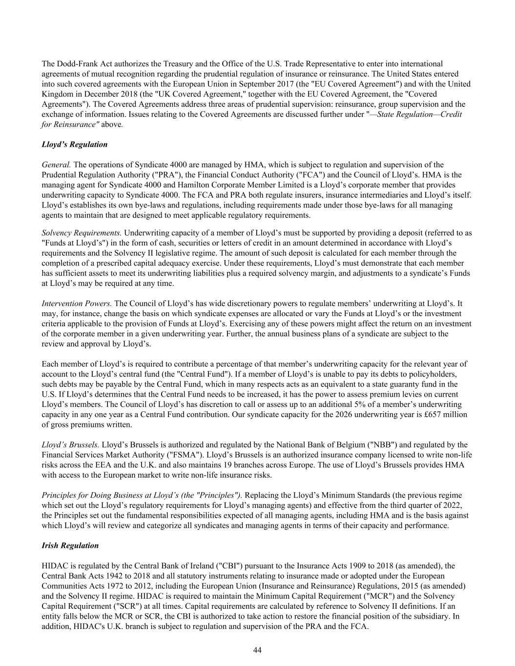The Dodd-Frank Act authorizes the Treasury and the Office of the U.S. Trade Representative to enter into international agreements of mutual recognition regarding the prudential regulation of insurance or reinsurance. The United States entered into such covered agreements with the European Union in September 2017 (the "EU Covered Agreement") and with the United Kingdom in December 2018 (the "UK Covered Agreement," together with the EU Covered Agreement, the "Covered Agreements"). The Covered Agreements address three areas of prudential supervision: reinsurance, group supervision and the exchange of information. Issues relating to the Covered Agreements are discussed further under "—State Regulation—Credit for Reinsurance" above. Lloyd’s Regulation General. The operations of Syndicate 4000 are managed by HMA, which is subject to regulation and supervision of the Prudential Regulation Authority ("PRA"), the Financial Conduct Authority ("FCA") and the Council of Lloyd’s. HMA is the managing agent for Syndicate 4000 and Hamilton Corporate Member Limited is a Lloyd’s corporate member that provides underwriting capacity to Syndicate 4000. The FCA and PRA both regulate insurers, insurance intermediaries and Lloyd’s itself. Lloyd’s establishes its own bye-laws and regulations, including requirements made under those bye-laws for all managing agents to maintain that are designed to meet applicable regulatory requirements. Solvency Requirements. Underwriting capacity of a member of Lloyd’s must be supported by providing a deposit (referred to as "Funds at Lloyd’s") in the form of cash, securities or letters of credit in an amount determined in accordance with Lloyd’s requirements and the Solvency II legislative regime. The amount of such deposit is calculated for each member through the completion of a prescribed capital adequacy exercise. Under these requirements, Lloyd’s must demonstrate that each member has sufficient assets to meet its underwriting liabilities plus a required solvency margin, and adjustments to a syndicate’s Funds at Lloyd’s may be required at any time. Intervention Powers. The Council of Lloyd’s has wide discretionary powers to regulate members’ underwriting at Lloyd’s. It may, for instance, change the basis on which syndicate expenses are allocated or vary the Funds at Lloyd’s or the investment criteria applicable to the provision of Funds at Lloyd’s. Exercising any of these powers might affect the return on an investment of the corporate member in a given underwriting year. Further, the annual business plans of a syndicate are subject to the review and approval by Lloyd’s. Each member of Lloyd’s is required to contribute a percentage of that member’s underwriting capacity for the relevant year of account to the Lloyd’s central fund (the "Central Fund"). If a member of Lloyd’s is unable to pay its debts to policyholders, such debts may be payable by the Central Fund, which in many respects acts as an equivalent to a state guaranty fund in the U.S. If Lloyd’s determines that the Central Fund needs to be increased, it has the power to assess premium levies on current Lloyd’s members. The Council of Lloyd’s has discretion to call or assess up to an additional 5% of a member’s underwriting capacity in any one year as a Central Fund contribution. Our syndicate capacity for the 2026 underwriting year is £657 million of gross premiums written. Lloyd’s Brussels. Lloyd’s Brussels is authorized and regulated by the National Bank of Belgium ("NBB") and regulated by the Financial Services Market Authority ("FSMA"). Lloyd’s Brussels is an authorized insurance company licensed to write non-life risks across the EEA and the U.K. and also maintains 19 branches across Europe. The use of Lloyd’s Brussels provides HMA with access to the European market to write non-life insurance risks. Principles for Doing Business at Lloyd’s (the "Principles"). Replacing the Lloyd’s Minimum Standards (the previous regime which set out the Lloyd’s regulatory requirements for Lloyd’s managing agents) and effective from the third quarter of 2022, the Principles set out the fundamental responsibilities expected of all managing agents, including HMA and is the basis against which Lloyd’s will review and categorize all syndicates and managing agents in terms of their capacity and performance. Irish Regulation HIDAC is regulated by the Central Bank of Ireland ("CBI") pursuant to the Insurance Acts 1909 to 2018 (as amended), the Central Bank Acts 1942 to 2018 and all statutory instruments relating to insurance made or adopted under the European Communities Acts 1972 to 2012, including the European Union (Insurance and Reinsurance) Regulations, 2015 (as amended) and the Solvency II regime. HIDAC is required to maintain the Minimum Capital Requirement ("MCR") and the Solvency Capital Requirement ("SCR") at all times. Capital requirements are calculated by reference to Solvency II definitions. If an entity falls below the MCR or SCR, the CBI is authorized to take action to restore the financial position of the subsidiary. In addition, HIDAC's U.K. branch is subject to regulation and supervision of the PRA and the FCA. 44