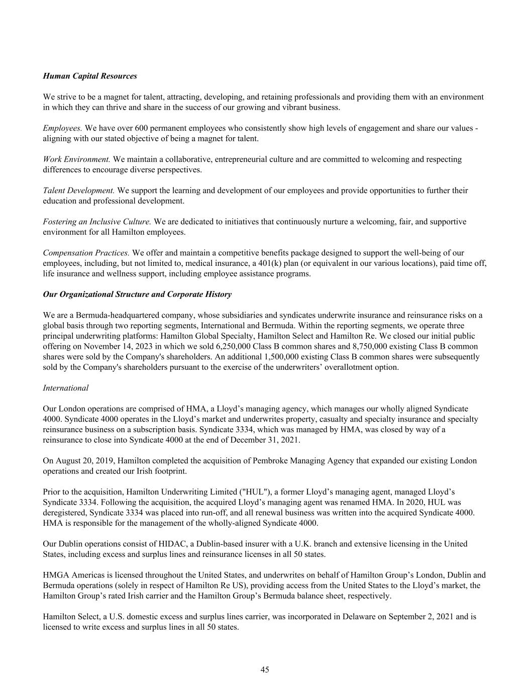 Human Capital Resources We strive to be a magnet for talent, attracting, developing, and retaining professionals and providing them with an environment in which they can thrive and share in the success of our growing and vibrant business. Employees. We have over 600 permanent employees who consistently show high levels of engagement and share our values - aligning with our stated objective of being a magnet for talent. Work Environment. We maintain a collaborative, entrepreneurial culture and are committed to welcoming and respecting differences to encourage diverse perspectives. Talent Development. We support the learning and development of our employees and provide opportunities to further their education and professional development. Fostering an Inclusive Culture. We are dedicated to initiatives that continuously nurture a welcoming, fair, and supportive environment for all Hamilton employees. Compensation Practices. We offer and maintain a competitive benefits package designed to support the well-being of our employees, including, but not limited to, medical insurance, a 401(k) plan (or equivalent in our various locations), paid time off, life insurance and wellness support, including employee assistance programs. Our Organizational Structure and Corporate History We are a Bermuda-headquartered company, whose subsidiaries and syndicates underwrite insurance and reinsurance risks on a global basis through two reporting segments, International and Bermuda. Within the reporting segments, we operate three principal underwriting platforms: Hamilton Global Specialty, Hamilton Select and Hamilton Re. We closed our initial public offering on November 14, 2023 in which we sold 6,250,000 Class B common shares and 8,750,000 existing Class B common shares were sold by the Company's shareholders. An additional 1,500,000 existing Class B common shares were subsequently sold by the Company's shareholders pursuant to the exercise of the underwriters’ overallotment option. International Our London operations are comprised of HMA, a Lloyd’s managing agency, which manages our wholly aligned Syndicate 4000. Syndicate 4000 operates in the Lloyd’s market and underwrites property, casualty and specialty insurance and specialty reinsurance business on a subscription basis. Syndicate 3334, which was managed by HMA, was closed by way of a reinsurance to close into Syndicate 4000 at the end of December 31, 2021. On August 20, 2019, Hamilton completed the acquisition of Pembroke Managing Agency that expanded our existing London operations and created our Irish footprint. Prior to the acquisition, Hamilton Underwriting Limited ("HUL"), a former Lloyd’s managing agent, managed Lloyd’s Syndicate 3334. Following the acquisition, the acquired Lloyd’s managing agent was renamed HMA. In 2020, HUL was deregistered, Syndicate 3334 was placed into run-off, and all renewal business was written into the acquired Syndicate 4000. HMA is responsible for the management of the wholly-aligned Syndicate 4000. Our Dublin operations consist of HIDAC, a Dublin-based insurer with a U.K. branch and extensive licensing in the United States, including excess and surplus lines and reinsurance licenses in all 50 states. HMGA Americas is licensed throughout the United States, and underwrites on behalf of Hamilton Group’s London, Dublin and Bermuda operations (solely in respect of Hamilton Re US), providing access from the United States to the Lloyd’s market, the Hamilton Group’s rated Irish carrier and the Hamilton Group’s Bermuda balance sheet, respectively. Hamilton Select, a U.S. domestic excess and surplus lines carrier, was incorporated in Delaware on September 2, 2021 and is licensed to write excess and surplus lines in all 50 states. 45