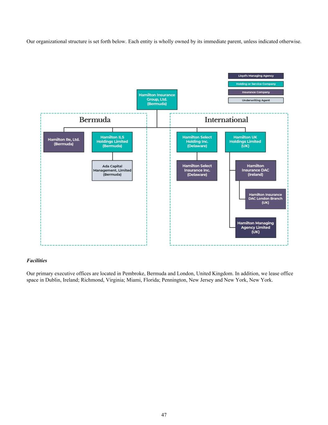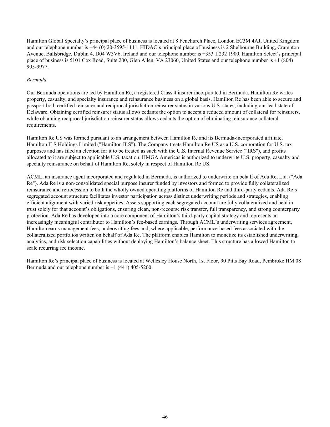 Hamilton Global Specialty’s principal place of business is located at 8 Fenchurch Place, London EC3M 4AJ, United Kingdom and our telephone number is +44 (0) 20-3595-1111. HIDAC’s principal place of business is 2 Shelbourne Building, Crampton Avenue, Ballsbridge, Dublin 4, D04 W3V6, Ireland and our telephone number is +353 1 232 1900. Hamilton Select’s principal place of business is 5101 Cox Road, Suite 200, Glen Allen, VA 23060, United States and our telephone number is +1 (804) 905-9977. Bermuda Our Bermuda operations are led by Hamilton Re, a registered Class 4 insurer incorporated in Bermuda. Hamilton Re writes property, casualty, and specialty insurance and reinsurance business on a global basis. Hamilton Re has been able to secure and passport both certified reinsurer and reciprocal jurisdiction reinsurer status in various U.S. states, including our lead state of Delaware. Obtaining certified reinsurer status allows cedants the option to accept a reduced amount of collateral for reinsurers, while obtaining reciprocal jurisdiction reinsurer status allows cedants the option of eliminating reinsurance collateral requirements. Hamilton Re US was formed pursuant to an arrangement between Hamilton Re and its Bermuda-incorporated affiliate, Hamilton ILS Holdings Limited ("Hamilton ILS"). The Company treats Hamilton Re US as a U.S. corporation for U.S. tax purposes and has filed an election for it to be treated as such with the U.S. Internal Revenue Service ("IRS"), and profits allocated to it are subject to applicable U.S. taxation. HMGA Americas is authorized to underwrite U.S. property, casualty and specialty reinsurance on behalf of Hamilton Re, solely in respect of Hamilton Re US. ACML, an insurance agent incorporated and regulated in Bermuda, is authorized to underwrite on behalf of Ada Re, Ltd. ("Ada Re"). Ada Re is a non-consolidated special purpose insurer funded by investors and formed to provide fully collateralized reinsurance and retrocession to both the wholly owned operating platforms of Hamilton Re and third-party cedants. Ada Re’s segregated account structure facilitates investor participation across distinct underwriting periods and strategies, enabling efficient alignment with varied risk appetites. Assets supporting each segregated account are fully collateralized and held in trust solely for that account’s obligations, ensuring clean, non-recourse risk transfer, full transparency, and strong counterparty protection. Ada Re has developed into a core component of Hamilton’s third-party capital strategy and represents an increasingly meaningful contributor to Hamilton’s fee-based earnings. Through ACML’s underwriting services agreement, Hamilton earns management fees, underwriting fees and, where applicable, performance-based fees associated with the collateralized portfolios written on behalf of Ada Re. The platform enables Hamilton to monetize its established underwriting, analytics, and risk selection capabilities without deploying Hamilton’s balance sheet. This structure has allowed Hamilton to scale recurring fee income. Hamilton Re’s principal place of business is located at Wellesley House North, 1st Floor, 90 Pitts Bay Road, Pembroke HM 08 Bermuda and our telephone number is +1 (441) 405-5200. 46