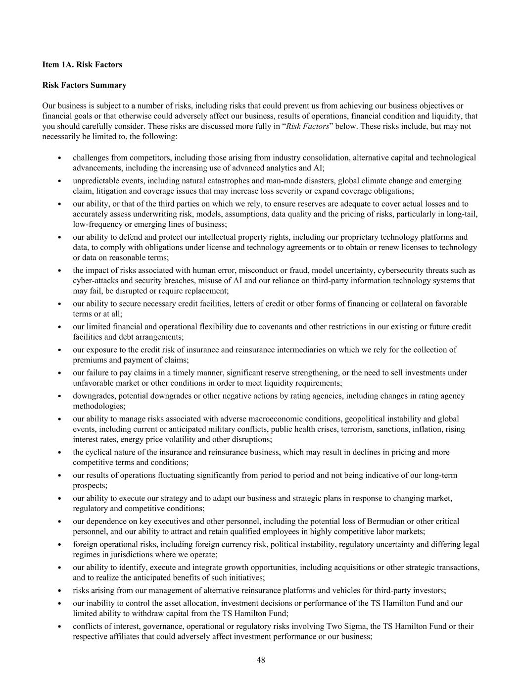 Item 1A. Risk Factors Risk Factors Summary Our business is subject to a number of risks, including risks that could prevent us from achieving our business objectives or financial goals or that otherwise could adversely affect our business, results of operations, financial condition and liquidity, that you should carefully consider. These risks are discussed more fully in “Risk Factors” below. These risks include, but may not necessarily be limited to, the following: • challenges from competitors, including those arising from industry consolidation, alternative capital and technological advancements, including the increasing use of advanced analytics and AI; • unpredictable events, including natural catastrophes and man-made disasters, global climate change and emerging claim, litigation and coverage issues that may increase loss severity or expand coverage obligations; • our ability, or that of the third parties on which we rely, to ensure reserves are adequate to cover actual losses and to accurately assess underwriting risk, models, assumptions, data quality and the pricing of risks, particularly in long-tail, low-frequency or emerging lines of business; • our ability to defend and protect our intellectual property rights, including our proprietary technology platforms and data, to comply with obligations under license and technology agreements or to obtain or renew licenses to technology or data on reasonable terms; • the impact of risks associated with human error, misconduct or fraud, model uncertainty, cybersecurity threats such as cyber-attacks and security breaches, misuse of AI and our reliance on third-party information technology systems that may fail, be disrupted or require replacement; • our ability to secure necessary credit facilities, letters of credit or other forms of financing or collateral on favorable terms or at all; • our limited financial and operational flexibility due to covenants and other restrictions in our existing or future credit facilities and debt arrangements; • our exposure to the credit risk of insurance and reinsurance intermediaries on which we rely for the collection of premiums and payment of claims; • our failure to pay claims in a timely manner, significant reserve strengthening, or the need to sell investments under unfavorable market or other conditions in order to meet liquidity requirements; • downgrades, potential downgrades or other negative actions by rating agencies, including changes in rating agency methodologies; • our ability to manage risks associated with adverse macroeconomic conditions, geopolitical instability and global events, including current or anticipated military conflicts, public health crises, terrorism, sanctions, inflation, rising interest rates, energy price volatility and other disruptions; • the cyclical nature of the insurance and reinsurance business, which may result in declines in pricing and more competitive terms and conditions; • our results of operations fluctuating significantly from period to period and not being indicative of our long-term prospects; • our ability to execute our strategy and to adapt our business and strategic plans in response to changing market, regulatory and competitive conditions; • our dependence on key executives and other personnel, including the potential loss of Bermudian or other critical personnel, and our ability to attract and retain qualified employees in highly competitive labor markets; • foreign operational risks, including foreign currency risk, political instability, regulatory uncertainty and differing legal regimes in jurisdictions where we operate; • our ability to identify, execute and integrate growth opportunities, including acquisitions or other strategic transactions, and to realize the anticipated benefits of such initiatives; • risks arising from our management of alternative reinsurance platforms and vehicles for third-party investors; • our inability to control the asset allocation, investment decisions or performance of the TS Hamilton Fund and our limited ability to withdraw capital from the TS Hamilton Fund; • conflicts of interest, governance, operational or regulatory risks involving Two Sigma, the TS Hamilton Fund or their respective affiliates that could adversely affect investment performance or our business; 48