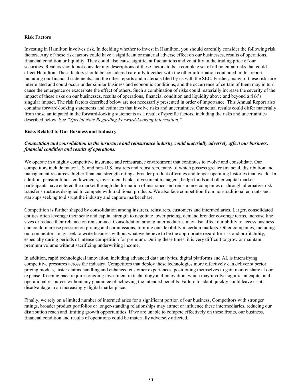 Risk Factors Investing in Hamilton involves risk. In deciding whether to invest in Hamilton, you should carefully consider the following risk factors. Any of these risk factors could have a significant or material adverse effect on our businesses, results of operations, financial condition or liquidity. They could also cause significant fluctuations and volatility in the trading price of our securities. Readers should not consider any descriptions of these factors to be a complete set of all potential risks that could affect Hamilton. These factors should be considered carefully together with the other information contained in this report, including our financial statements, and the other reports and materials filed by us with the SEC. Further, many of these risks are interrelated and could occur under similar business and economic conditions, and the occurrence of certain of them may in turn cause the emergence or exacerbate the effect of others. Such a combination of risks could materially increase the severity of the impact of these risks on our businesses, results of operations, financial condition and liquidity above and beyond a risk’s singular impact. The risk factors described below are not necessarily presented in order of importance. This Annual Report also contains forward-looking statements and estimates that involve risks and uncertainties. Our actual results could differ materially from those anticipated in the forward-looking statements as a result of specific factors, including the risks and uncertainties described below. See “Special Note Regarding Forward-Looking Information.” Risks Related to Our Business and Industry Competition and consolidation in the insurance and reinsurance industry could materially adversely affect our business, financial condition and results of operations. We operate in a highly competitive insurance and reinsurance environment that continues to evolve and consolidate. Our competitors include major U.S. and non-U.S. insurers and reinsurers, many of which possess greater financial, distribution and management resources, higher financial strength ratings, broader product offerings and longer operating histories than we do. In addition, pension funds, endowments, investment banks, investment managers, hedge funds and other capital markets participants have entered the market through the formation of insurance and reinsurance companies or through alternative risk transfer structures designed to compete with traditional products. We also face competition from non-traditional entrants and start-ups seeking to disrupt the industry and capture market share. Competition is further shaped by consolidation among insurers, reinsurers, customers and intermediaries. Larger, consolidated entities often leverage their scale and capital strength to negotiate lower pricing, demand broader coverage terms, increase line sizes or reduce their reliance on reinsurance. Consolidation among intermediaries may also affect our ability to access business and could increase pressure on pricing and commissions, limiting our flexibility in certain markets. Other companies, including our competitors, may seek to write business without what we believe to be the appropriate regard for risk and profitability, especially during periods of intense competition for premium. During these times, it is very difficult to grow or maintain premium volume without sacrificing underwriting income. In addition, rapid technological innovation, including advanced data analytics, digital platforms and AI, is intensifying competitive pressures across the industry. Competitors that deploy these technologies more effectively can deliver superior pricing models, faster claims handling and enhanced customer experiences, positioning themselves to gain market share at our expense. Keeping pace requires ongoing investment in technology and innovation, which may involve significant capital and operational resources without any guarantee of achieving the intended benefits. Failure to adapt quickly could leave us at a disadvantage in an increasingly digital marketplace. Finally, we rely on a limited number of intermediaries for a significant portion of our business. Competitors with stronger ratings, broader product portfolios or longer-standing relationships may attract or influence these intermediaries, reducing our distribution reach and limiting growth opportunities. If we are unable to compete effectively on these fronts, our business, financial condition and results of operations could be materially adversely affected. 50