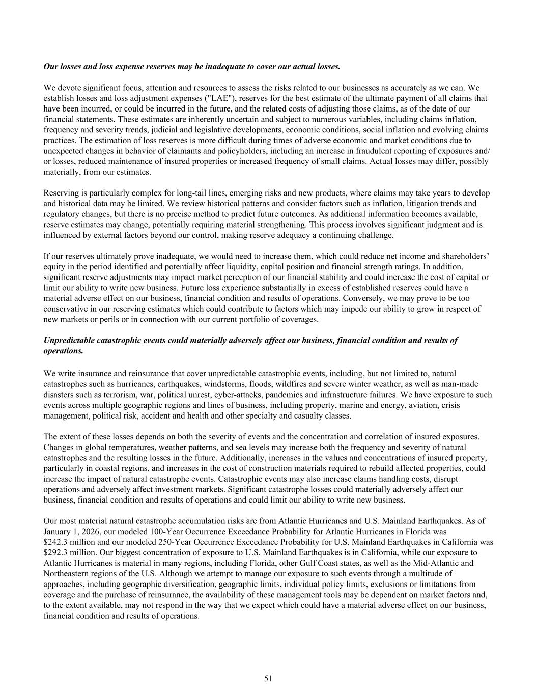 Our losses and loss expense reserves may be inadequate to cover our actual losses. We devote significant focus, attention and resources to assess the risks related to our businesses as accurately as we can. We establish losses and loss adjustment expenses ("LAE"), reserves for the best estimate of the ultimate payment of all claims that have been incurred, or could be incurred in the future, and the related costs of adjusting those claims, as of the date of our financial statements. These estimates are inherently uncertain and subject to numerous variables, including claims inflation, frequency and severity trends, judicial and legislative developments, economic conditions, social inflation and evolving claims practices. The estimation of loss reserves is more difficult during times of adverse economic and market conditions due to unexpected changes in behavior of claimants and policyholders, including an increase in fraudulent reporting of exposures and/ or losses, reduced maintenance of insured properties or increased frequency of small claims. Actual losses may differ, possibly materially, from our estimates. Reserving is particularly complex for long-tail lines, emerging risks and new products, where claims may take years to develop and historical data may be limited. We review historical patterns and consider factors such as inflation, litigation trends and regulatory changes, but there is no precise method to predict future outcomes. As additional information becomes available, reserve estimates may change, potentially requiring material strengthening. This process involves significant judgment and is influenced by external factors beyond our control, making reserve adequacy a continuing challenge. If our reserves ultimately prove inadequate, we would need to increase them, which could reduce net income and shareholders’ equity in the period identified and potentially affect liquidity, capital position and financial strength ratings. In addition, significant reserve adjustments may impact market perception of our financial stability and could increase the cost of capital or limit our ability to write new business. Future loss experience substantially in excess of established reserves could have a material adverse effect on our business, financial condition and results of operations. Conversely, we may prove to be too conservative in our reserving estimates which could contribute to factors which may impede our ability to grow in respect of new markets or perils or in connection with our current portfolio of coverages. Unpredictable catastrophic events could materially adversely affect our business, financial condition and results of operations. We write insurance and reinsurance that cover unpredictable catastrophic events, including, but not limited to, natural catastrophes such as hurricanes, earthquakes, windstorms, floods, wildfires and severe winter weather, as well as man-made disasters such as terrorism, war, political unrest, cyber-attacks, pandemics and infrastructure failures. We have exposure to such events across multiple geographic regions and lines of business, including property, marine and energy, aviation, crisis management, political risk, accident and health and other specialty and casualty classes. The extent of these losses depends on both the severity of events and the concentration and correlation of insured exposures. Changes in global temperatures, weather patterns, and sea levels may increase both the frequency and severity of natural catastrophes and the resulting losses in the future. Additionally, increases in the values and concentrations of insured property, particularly in coastal regions, and increases in the cost of construction materials required to rebuild affected properties, could increase the impact of natural catastrophe events. Catastrophic events may also increase claims handling costs, disrupt operations and adversely affect investment markets. Significant catastrophe losses could materially adversely affect our business, financial condition and results of operations and could limit our ability to write new business. Our most material natural catastrophe accumulation risks are from Atlantic Hurricanes and U.S. Mainland Earthquakes. As of January 1, 2026, our modeled 100-Year Occurrence Exceedance Probability for Atlantic Hurricanes in Florida was $242.3 million and our modeled 250-Year Occurrence Exceedance Probability for U.S. Mainland Earthquakes in California was $292.3 million. Our biggest concentration of exposure to U.S. Mainland Earthquakes is in California, while our exposure to Atlantic Hurricanes is material in many regions, including Florida, other Gulf Coast states, as well as the Mid-Atlantic and Northeastern regions of the U.S. Although we attempt to manage our exposure to such events through a multitude of approaches, including geographic diversification, geographic limits, individual policy limits, exclusions or limitations from coverage and the purchase of reinsurance, the availability of these management tools may be dependent on market factors and, to the extent available, may not respond in the way that we expect which could have a material adverse effect on our business, financial condition and results of operations. 51