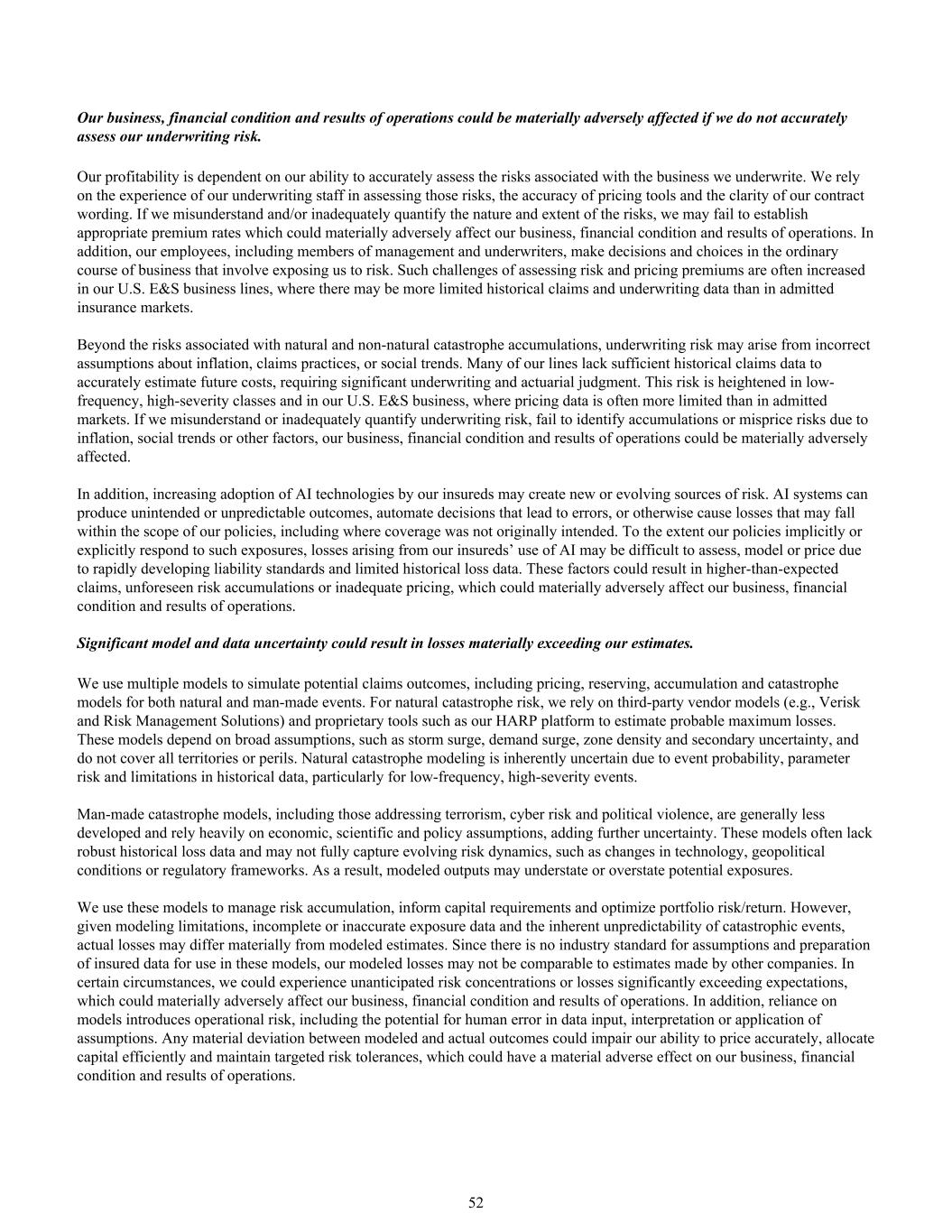 Our business, financial condition and results of operations could be materially adversely affected if we do not accurately assess our underwriting risk. Our profitability is dependent on our ability to accurately assess the risks associated with the business we underwrite. We rely on the experience of our underwriting staff in assessing those risks, the accuracy of pricing tools and the clarity of our contract wording. If we misunderstand and/or inadequately quantify the nature and extent of the risks, we may fail to establish appropriate premium rates which could materially adversely affect our business, financial condition and results of operations. In addition, our employees, including members of management and underwriters, make decisions and choices in the ordinary course of business that involve exposing us to risk. Such challenges of assessing risk and pricing premiums are often increased in our U.S. E&S business lines, where there may be more limited historical claims and underwriting data than in admitted insurance markets. Beyond the risks associated with natural and non-natural catastrophe accumulations, underwriting risk may arise from incorrect assumptions about inflation, claims practices, or social trends. Many of our lines lack sufficient historical claims data to accurately estimate future costs, requiring significant underwriting and actuarial judgment. This risk is heightened in low- frequency, high-severity classes and in our U.S. E&S business, where pricing data is often more limited than in admitted markets. If we misunderstand or inadequately quantify underwriting risk, fail to identify accumulations or misprice risks due to inflation, social trends or other factors, our business, financial condition and results of operations could be materially adversely affected. In addition, increasing adoption of AI technologies by our insureds may create new or evolving sources of risk. AI systems can produce unintended or unpredictable outcomes, automate decisions that lead to errors, or otherwise cause losses that may fall within the scope of our policies, including where coverage was not originally intended. To the extent our policies implicitly or explicitly respond to such exposures, losses arising from our insureds’ use of AI may be difficult to assess, model or price due to rapidly developing liability standards and limited historical loss data. These factors could result in higher-than-expected claims, unforeseen risk accumulations or inadequate pricing, which could materially adversely affect our business, financial condition and results of operations. Significant model and data uncertainty could result in losses materially exceeding our estimates. We use multiple models to simulate potential claims outcomes, including pricing, reserving, accumulation and catastrophe models for both natural and man-made events. For natural catastrophe risk, we rely on third-party vendor models (e.g., Verisk and Risk Management Solutions) and proprietary tools such as our HARP platform to estimate probable maximum losses. These models depend on broad assumptions, such as storm surge, demand surge, zone density and secondary uncertainty, and do not cover all territories or perils. Natural catastrophe modeling is inherently uncertain due to event probability, parameter risk and limitations in historical data, particularly for low-frequency, high-severity events. Man-made catastrophe models, including those addressing terrorism, cyber risk and political violence, are generally less developed and rely heavily on economic, scientific and policy assumptions, adding further uncertainty. These models often lack robust historical loss data and may not fully capture evolving risk dynamics, such as changes in technology, geopolitical conditions or regulatory frameworks. As a result, modeled outputs may understate or overstate potential exposures. We use these models to manage risk accumulation, inform capital requirements and optimize portfolio risk/return. However, given modeling limitations, incomplete or inaccurate exposure data and the inherent unpredictability of catastrophic events, actual losses may differ materially from modeled estimates. Since there is no industry standard for assumptions and preparation of insured data for use in these models, our modeled losses may not be comparable to estimates made by other companies. In certain circumstances, we could experience unanticipated risk concentrations or losses significantly exceeding expectations, which could materially adversely affect our business, financial condition and results of operations. In addition, reliance on models introduces operational risk, including the potential for human error in data input, interpretation or application of assumptions. Any material deviation between modeled and actual outcomes could impair our ability to price accurately, allocate capital efficiently and maintain targeted risk tolerances, which could have a material adverse effect on our business, financial condition and results of operations. 52
