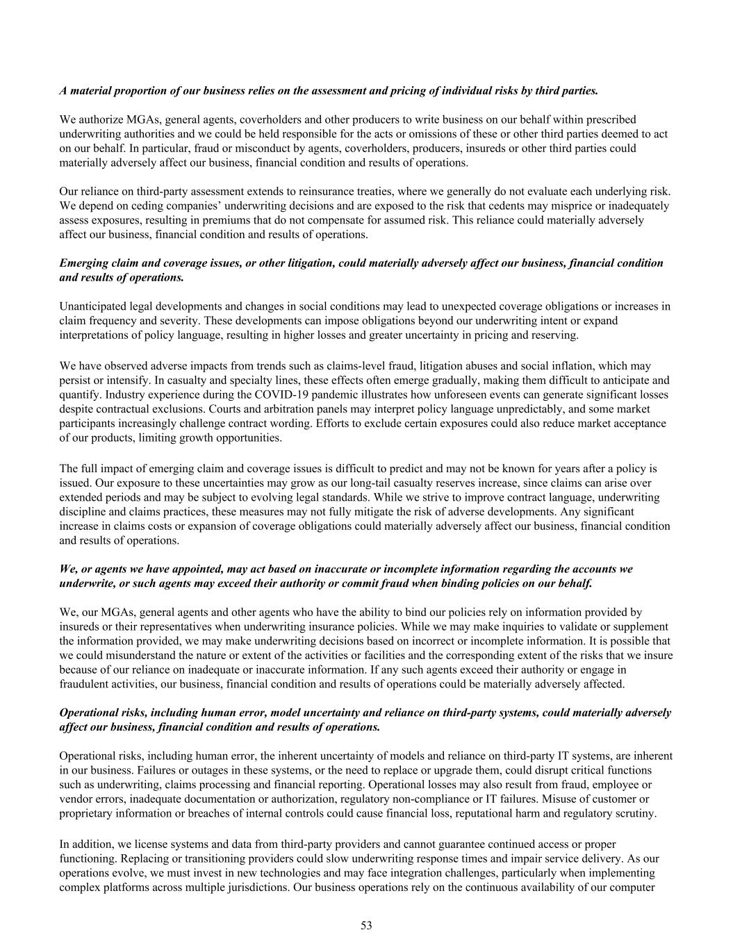 A material proportion of our business relies on the assessment and pricing of individual risks by third parties. We authorize MGAs, general agents, coverholders and other producers to write business on our behalf within prescribed underwriting authorities and we could be held responsible for the acts or omissions of these or other third parties deemed to act on our behalf. In particular, fraud or misconduct by agents, coverholders, producers, insureds or other third parties could materially adversely affect our business, financial condition and results of operations. Our reliance on third-party assessment extends to reinsurance treaties, where we generally do not evaluate each underlying risk. We depend on ceding companies’ underwriting decisions and are exposed to the risk that cedents may misprice or inadequately assess exposures, resulting in premiums that do not compensate for assumed risk. This reliance could materially adversely affect our business, financial condition and results of operations. Emerging claim and coverage issues, or other litigation, could materially adversely affect our business, financial condition and results of operations. Unanticipated legal developments and changes in social conditions may lead to unexpected coverage obligations or increases in claim frequency and severity. These developments can impose obligations beyond our underwriting intent or expand interpretations of policy language, resulting in higher losses and greater uncertainty in pricing and reserving. We have observed adverse impacts from trends such as claims-level fraud, litigation abuses and social inflation, which may persist or intensify. In casualty and specialty lines, these effects often emerge gradually, making them difficult to anticipate and quantify. Industry experience during the COVID-19 pandemic illustrates how unforeseen events can generate significant losses despite contractual exclusions. Courts and arbitration panels may interpret policy language unpredictably, and some market participants increasingly challenge contract wording. Efforts to exclude certain exposures could also reduce market acceptance of our products, limiting growth opportunities. The full impact of emerging claim and coverage issues is difficult to predict and may not be known for years after a policy is issued. Our exposure to these uncertainties may grow as our long-tail casualty reserves increase, since claims can arise over extended periods and may be subject to evolving legal standards. While we strive to improve contract language, underwriting discipline and claims practices, these measures may not fully mitigate the risk of adverse developments. Any significant increase in claims costs or expansion of coverage obligations could materially adversely affect our business, financial condition and results of operations. We, or agents we have appointed, may act based on inaccurate or incomplete information regarding the accounts we underwrite, or such agents may exceed their authority or commit fraud when binding policies on our behalf. We, our MGAs, general agents and other agents who have the ability to bind our policies rely on information provided by insureds or their representatives when underwriting insurance policies. While we may make inquiries to validate or supplement the information provided, we may make underwriting decisions based on incorrect or incomplete information. It is possible that we could misunderstand the nature or extent of the activities or facilities and the corresponding extent of the risks that we insure because of our reliance on inadequate or inaccurate information. If any such agents exceed their authority or engage in fraudulent activities, our business, financial condition and results of operations could be materially adversely affected. Operational risks, including human error, model uncertainty and reliance on third-party systems, could materially adversely affect our business, financial condition and results of operations. Operational risks, including human error, the inherent uncertainty of models and reliance on third-party IT systems, are inherent in our business. Failures or outages in these systems, or the need to replace or upgrade them, could disrupt critical functions such as underwriting, claims processing and financial reporting. Operational losses may also result from fraud, employee or vendor errors, inadequate documentation or authorization, regulatory non-compliance or IT failures. Misuse of customer or proprietary information or breaches of internal controls could cause financial loss, reputational harm and regulatory scrutiny. In addition, we license systems and data from third-party providers and cannot guarantee continued access or proper functioning. Replacing or transitioning providers could slow underwriting response times and impair service delivery. As our operations evolve, we must invest in new technologies and may face integration challenges, particularly when implementing complex platforms across multiple jurisdictions. Our business operations rely on the continuous availability of our computer 53