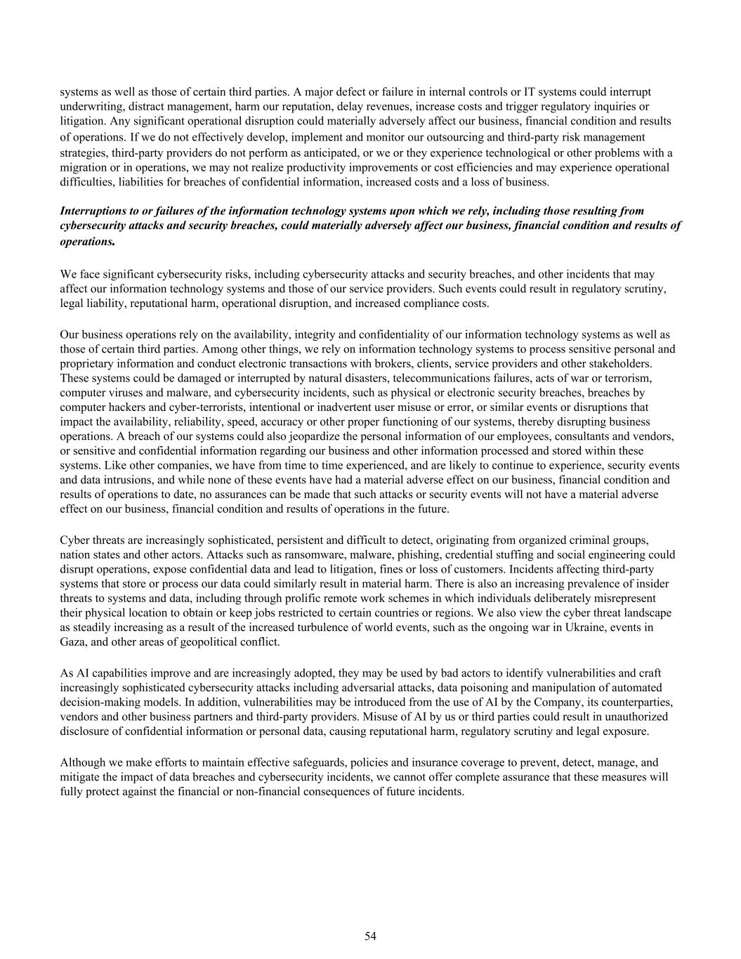 systems as well as those of certain third parties. A major defect or failure in internal controls or IT systems could interrupt underwriting, distract management, harm our reputation, delay revenues, increase costs and trigger regulatory inquiries or litigation. Any significant operational disruption could materially adversely affect our business, financial condition and results of operations. If we do not effectively develop, implement and monitor our outsourcing and third-party risk management strategies, third-party providers do not perform as anticipated, or we or they experience technological or other problems with a migration or in operations, we may not realize productivity improvements or cost efficiencies and may experience operational difficulties, liabilities for breaches of confidential information, increased costs and a loss of business. Interruptions to or failures of the information technology systems upon which we rely, including those resulting from cybersecurity attacks and security breaches, could materially adversely affect our business, financial condition and results of operations. We face significant cybersecurity risks, including cybersecurity attacks and security breaches, and other incidents that may affect our information technology systems and those of our service providers. Such events could result in regulatory scrutiny, legal liability, reputational harm, operational disruption, and increased compliance costs. Our business operations rely on the availability, integrity and confidentiality of our information technology systems as well as those of certain third parties. Among other things, we rely on information technology systems to process sensitive personal and proprietary information and conduct electronic transactions with brokers, clients, service providers and other stakeholders. These systems could be damaged or interrupted by natural disasters, telecommunications failures, acts of war or terrorism, computer viruses and malware, and cybersecurity incidents, such as physical or electronic security breaches, breaches by computer hackers and cyber-terrorists, intentional or inadvertent user misuse or error, or similar events or disruptions that impact the availability, reliability, speed, accuracy or other proper functioning of our systems, thereby disrupting business operations. A breach of our systems could also jeopardize the personal information of our employees, consultants and vendors, or sensitive and confidential information regarding our business and other information processed and stored within these systems. Like other companies, we have from time to time experienced, and are likely to continue to experience, security events and data intrusions, and while none of these events have had a material adverse effect on our business, financial condition and results of operations to date, no assurances can be made that such attacks or security events will not have a material adverse effect on our business, financial condition and results of operations in the future. Cyber threats are increasingly sophisticated, persistent and difficult to detect, originating from organized criminal groups, nation states and other actors. Attacks such as ransomware, malware, phishing, credential stuffing and social engineering could disrupt operations, expose confidential data and lead to litigation, fines or loss of customers. Incidents affecting third-party systems that store or process our data could similarly result in material harm. There is also an increasing prevalence of insider threats to systems and data, including through prolific remote work schemes in which individuals deliberately misrepresent their physical location to obtain or keep jobs restricted to certain countries or regions. We also view the cyber threat landscape as steadily increasing as a result of the increased turbulence of world events, such as the ongoing war in Ukraine, events in Gaza, and other areas of geopolitical conflict. As AI capabilities improve and are increasingly adopted, they may be used by bad actors to identify vulnerabilities and craft increasingly sophisticated cybersecurity attacks including adversarial attacks, data poisoning and manipulation of automated decision-making models. In addition, vulnerabilities may be introduced from the use of AI by the Company, its counterparties, vendors and other business partners and third-party providers. Misuse of AI by us or third parties could result in unauthorized disclosure of confidential information or personal data, causing reputational harm, regulatory scrutiny and legal exposure. Although we make efforts to maintain effective safeguards, policies and insurance coverage to prevent, detect, manage, and mitigate the impact of data breaches and cybersecurity incidents, we cannot offer complete assurance that these measures will fully protect against the financial or non-financial consequences of future incidents. 54