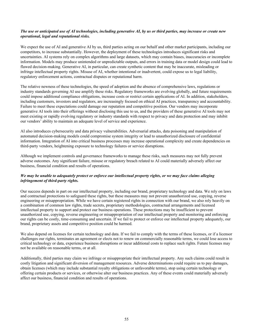 The use or anticipated use of AI technologies, including generative AI, by us or third parties, may increase or create new operational, legal and reputational risks. We expect the use of AI and generative AI by us, third parties acting on our behalf and other market participants, including our competitors, to increase substantially. However, the deployment of these technologies introduces significant risks and uncertainties. AI systems rely on complex algorithms and large datasets, which may contain biases, inaccuracies or incomplete information. Models may produce unintended or unpredictable outputs, and errors in training data or model design could lead to flawed decision-making. Generative AI, in particular, can create synthetic content that may be inaccurate, misleading or infringe intellectual property rights. Misuse of AI, whether intentional or inadvertent, could expose us to legal liability, regulatory enforcement actions, contractual disputes or reputational harm. The relative newness of these technologies, the speed of adoption and the absence of comprehensive laws, regulations or industry standards governing AI use amplify these risks. Regulatory frameworks are evolving globally, and future requirements could impose additional compliance obligations, increase costs or restrict certain applications of AI. In addition, stakeholders, including customers, investors and regulators, are increasingly focused on ethical AI practices, transparency and accountability. Failure to meet these expectations could damage our reputation and competitive position. Our vendors may incorporate generative AI tools into their offerings without disclosing this use to us, and the providers of these generative AI tools may not meet existing or rapidly evolving regulatory or industry standards with respect to privacy and data protection and may inhibit our vendors’ ability to maintain an adequate level of service and experience. AI also introduces cybersecurity and data privacy vulnerabilities. Adversarial attacks, data poisoning and manipulation of automated decision-making models could compromise system integrity or lead to unauthorized disclosure of confidential information. Integration of AI into critical business processes may increase operational complexity and create dependencies on third-party vendors, heightening exposure to technology failures or service disruptions. Although we implement controls and governance frameworks to manage these risks, such measures may not fully prevent adverse outcomes. Any significant failure, misuse or regulatory breach related to AI could materially adversely affect our business, financial condition and results of operations. We may be unable to adequately protect or enforce our intellectual property rights, or we may face claims alleging infringement of third-party rights. Our success depends in part on our intellectual property, including our brand, proprietary technology and data. We rely on laws and contractual protections to safeguard these rights, but these measures may not prevent unauthorized use, copying, reverse engineering or misappropriation. While we have certain registered rights in connection with our brand, we also rely heavily on a combination of common law rights, trade secrets, proprietary methodologies, contractual arrangements and licensed intellectual property to support and protect our business operations. These protections may be insufficient to prevent unauthorized use, copying, reverse engineering or misappropriation of our intellectual property and monitoring and enforcing our rights can be costly, time-consuming and uncertain. If we fail to protect or enforce our intellectual property adequately, our brand, proprietary assets and competitive position could be harmed. We also depend on licenses for certain technology and data. If we fail to comply with the terms of these licenses, or if a licensor challenges our rights, terminates an agreement or elects not to renew on commercially reasonable terms, we could lose access to critical technology or data, experience business disruptions or incur additional costs to replace such rights. Future licenses may not be available on reasonable terms, or at all. Additionally, third parties may claim we infringe or misappropriate their intellectual property. Any such claims could result in costly litigation and significant diversion of management resources. Adverse determinations could require us to pay damages, obtain licenses (which may include substantial royalty obligations or unfavorable terms), stop using certain technology or offering certain products or services, or otherwise alter our business practices. Any of these events could materially adversely affect our business, financial condition and results of operations. 55