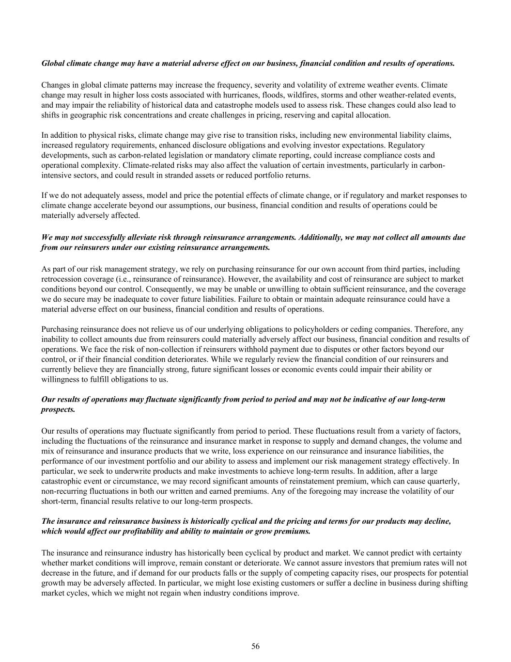 Global climate change may have a material adverse effect on our business, financial condition and results of operations. Changes in global climate patterns may increase the frequency, severity and volatility of extreme weather events. Climate change may result in higher loss costs associated with hurricanes, floods, wildfires, storms and other weather-related events, and may impair the reliability of historical data and catastrophe models used to assess risk. These changes could also lead to shifts in geographic risk concentrations and create challenges in pricing, reserving and capital allocation. In addition to physical risks, climate change may give rise to transition risks, including new environmental liability claims, increased regulatory requirements, enhanced disclosure obligations and evolving investor expectations. Regulatory developments, such as carbon-related legislation or mandatory climate reporting, could increase compliance costs and operational complexity. Climate-related risks may also affect the valuation of certain investments, particularly in carbon- intensive sectors, and could result in stranded assets or reduced portfolio returns. If we do not adequately assess, model and price the potential effects of climate change, or if regulatory and market responses to climate change accelerate beyond our assumptions, our business, financial condition and results of operations could be materially adversely affected. We may not successfully alleviate risk through reinsurance arrangements. Additionally, we may not collect all amounts due from our reinsurers under our existing reinsurance arrangements. As part of our risk management strategy, we rely on purchasing reinsurance for our own account from third parties, including retrocession coverage (i.e., reinsurance of reinsurance). However, the availability and cost of reinsurance are subject to market conditions beyond our control. Consequently, we may be unable or unwilling to obtain sufficient reinsurance, and the coverage we do secure may be inadequate to cover future liabilities. Failure to obtain or maintain adequate reinsurance could have a material adverse effect on our business, financial condition and results of operations. Purchasing reinsurance does not relieve us of our underlying obligations to policyholders or ceding companies. Therefore, any inability to collect amounts due from reinsurers could materially adversely affect our business, financial condition and results of operations. We face the risk of non-collection if reinsurers withhold payment due to disputes or other factors beyond our control, or if their financial condition deteriorates. While we regularly review the financial condition of our reinsurers and currently believe they are financially strong, future significant losses or economic events could impair their ability or willingness to fulfill obligations to us. Our results of operations may fluctuate significantly from period to period and may not be indicative of our long-term prospects. Our results of operations may fluctuate significantly from period to period. These fluctuations result from a variety of factors, including the fluctuations of the reinsurance and insurance market in response to supply and demand changes, the volume and mix of reinsurance and insurance products that we write, loss experience on our reinsurance and insurance liabilities, the performance of our investment portfolio and our ability to assess and implement our risk management strategy effectively. In particular, we seek to underwrite products and make investments to achieve long-term results. In addition, after a large catastrophic event or circumstance, we may record significant amounts of reinstatement premium, which can cause quarterly, non-recurring fluctuations in both our written and earned premiums. Any of the foregoing may increase the volatility of our short-term, financial results relative to our long-term prospects. The insurance and reinsurance business is historically cyclical and the pricing and terms for our products may decline, which would affect our profitability and ability to maintain or grow premiums. The insurance and reinsurance industry has historically been cyclical by product and market. We cannot predict with certainty whether market conditions will improve, remain constant or deteriorate. We cannot assure investors that premium rates will not decrease in the future, and if demand for our products falls or the supply of competing capacity rises, our prospects for potential growth may be adversely affected. In particular, we might lose existing customers or suffer a decline in business during shifting market cycles, which we might not regain when industry conditions improve. 56