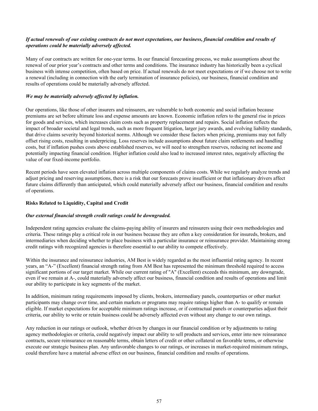 If actual renewals of our existing contracts do not meet expectations, our business, financial condition and results of operations could be materially adversely affected. Many of our contracts are written for one-year terms. In our financial forecasting process, we make assumptions about the renewal of our prior year’s contracts and other terms and conditions. The insurance industry has historically been a cyclical business with intense competition, often based on price. If actual renewals do not meet expectations or if we choose not to write a renewal (including in connection with the early termination of insurance policies), our business, financial condition and results of operations could be materially adversely affected. We may be materially adversely affected by inflation. Our operations, like those of other insurers and reinsurers, are vulnerable to both economic and social inflation because premiums are set before ultimate loss and expense amounts are known. Economic inflation refers to the general rise in prices for goods and services, which increases claim costs such as property replacement and repairs. Social inflation reflects the impact of broader societal and legal trends, such as more frequent litigation, larger jury awards, and evolving liability standards, that drive claims severity beyond historical norms. Although we consider these factors when pricing, premiums may not fully offset rising costs, resulting in underpricing. Loss reserves include assumptions about future claim settlements and handling costs, but if inflation pushes costs above established reserves, we will need to strengthen reserves, reducing net income and potentially impacting financial condition. Higher inflation could also lead to increased interest rates, negatively affecting the value of our fixed-income portfolio. Recent periods have seen elevated inflation across multiple components of claims costs. While we regularly analyze trends and adjust pricing and reserving assumptions, there is a risk that our forecasts prove insufficient or that inflationary drivers affect future claims differently than anticipated, which could materially adversely affect our business, financial condition and results of operations. Risks Related to Liquidity, Capital and Credit Our external financial strength credit ratings could be downgraded. Independent rating agencies evaluate the claims-paying ability of insurers and reinsurers using their own methodologies and criteria. These ratings play a critical role in our business because they are often a key consideration for insureds, brokers, and intermediaries when deciding whether to place business with a particular insurance or reinsurance provider. Maintaining strong credit ratings with recognized agencies is therefore essential to our ability to compete effectively. Within the insurance and reinsurance industries, AM Best is widely regarded as the most influential rating agency. In recent years, an “A-” (Excellent) financial strength rating from AM Best has represented the minimum threshold required to access significant portions of our target market. While our current rating of "A" (Excellent) exceeds this minimum, any downgrade, even if we remain at A-, could materially adversely affect our business, financial condition and results of operations and limit our ability to participate in key segments of the market. In addition, minimum rating requirements imposed by clients, brokers, intermediary panels, counterparties or other market participants may change over time, and certain markets or programs may require ratings higher than A- to qualify or remain eligible. If market expectations for acceptable minimum ratings increase, or if contractual panels or counterparties adjust their criteria, our ability to write or retain business could be adversely affected even without any change to our own ratings. Any reduction in our ratings or outlook, whether driven by changes in our financial condition or by adjustments to rating agency methodologies or criteria, could negatively impact our ability to sell products and services, enter into new reinsurance contracts, secure reinsurance on reasonable terms, obtain letters of credit or other collateral on favorable terms, or otherwise execute our strategic business plan. Any unfavorable changes to our ratings, or increases in market-required minimum ratings, could therefore have a material adverse effect on our business, financial condition and results of operations. 57