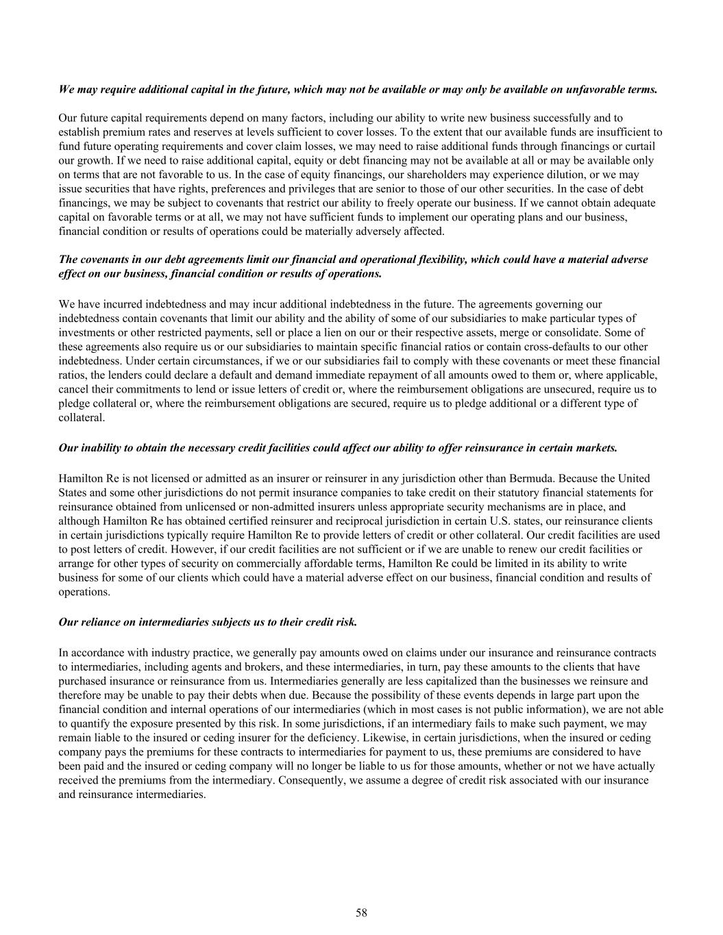We may require additional capital in the future, which may not be available or may only be available on unfavorable terms. Our future capital requirements depend on many factors, including our ability to write new business successfully and to establish premium rates and reserves at levels sufficient to cover losses. To the extent that our available funds are insufficient to fund future operating requirements and cover claim losses, we may need to raise additional funds through financings or curtail our growth. If we need to raise additional capital, equity or debt financing may not be available at all or may be available only on terms that are not favorable to us. In the case of equity financings, our shareholders may experience dilution, or we may issue securities that have rights, preferences and privileges that are senior to those of our other securities. In the case of debt financings, we may be subject to covenants that restrict our ability to freely operate our business. If we cannot obtain adequate capital on favorable terms or at all, we may not have sufficient funds to implement our operating plans and our business, financial condition or results of operations could be materially adversely affected. The covenants in our debt agreements limit our financial and operational flexibility, which could have a material adverse effect on our business, financial condition or results of operations. We have incurred indebtedness and may incur additional indebtedness in the future. The agreements governing our indebtedness contain covenants that limit our ability and the ability of some of our subsidiaries to make particular types of investments or other restricted payments, sell or place a lien on our or their respective assets, merge or consolidate. Some of these agreements also require us or our subsidiaries to maintain specific financial ratios or contain cross-defaults to our other indebtedness. Under certain circumstances, if we or our subsidiaries fail to comply with these covenants or meet these financial ratios, the lenders could declare a default and demand immediate repayment of all amounts owed to them or, where applicable, cancel their commitments to lend or issue letters of credit or, where the reimbursement obligations are unsecured, require us to pledge collateral or, where the reimbursement obligations are secured, require us to pledge additional or a different type of collateral. Our inability to obtain the necessary credit facilities could affect our ability to offer reinsurance in certain markets. Hamilton Re is not licensed or admitted as an insurer or reinsurer in any jurisdiction other than Bermuda. Because the United States and some other jurisdictions do not permit insurance companies to take credit on their statutory financial statements for reinsurance obtained from unlicensed or non-admitted insurers unless appropriate security mechanisms are in place, and although Hamilton Re has obtained certified reinsurer and reciprocal jurisdiction in certain U.S. states, our reinsurance clients in certain jurisdictions typically require Hamilton Re to provide letters of credit or other collateral. Our credit facilities are used to post letters of credit. However, if our credit facilities are not sufficient or if we are unable to renew our credit facilities or arrange for other types of security on commercially affordable terms, Hamilton Re could be limited in its ability to write business for some of our clients which could have a material adverse effect on our business, financial condition and results of operations. Our reliance on intermediaries subjects us to their credit risk. In accordance with industry practice, we generally pay amounts owed on claims under our insurance and reinsurance contracts to intermediaries, including agents and brokers, and these intermediaries, in turn, pay these amounts to the clients that have purchased insurance or reinsurance from us. Intermediaries generally are less capitalized than the businesses we reinsure and therefore may be unable to pay their debts when due. Because the possibility of these events depends in large part upon the financial condition and internal operations of our intermediaries (which in most cases is not public information), we are not able to quantify the exposure presented by this risk. In some jurisdictions, if an intermediary fails to make such payment, we may remain liable to the insured or ceding insurer for the deficiency. Likewise, in certain jurisdictions, when the insured or ceding company pays the premiums for these contracts to intermediaries for payment to us, these premiums are considered to have been paid and the insured or ceding company will no longer be liable to us for those amounts, whether or not we have actually received the premiums from the intermediary. Consequently, we assume a degree of credit risk associated with our insurance and reinsurance intermediaries. 58
