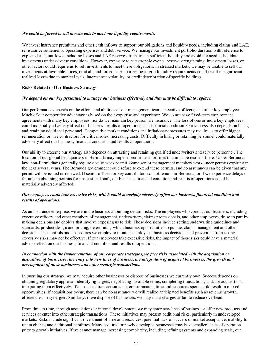 We could be forced to sell investments to meet our liquidity requirements. We invest insurance premiums and other cash inflows to support our obligations and liquidity needs, including claims and LAE, reinsurance settlements, operating expenses and debt service. We manage our investment portfolio duration with reference to expected cash outflows, including losses and LAE reserves, to maintain sufficient liquidity and avoid the need to liquidate investments under adverse conditions. However, exposure to catastrophic events, reserve strengthening, investment losses, or other factors could require us to sell investments to meet these obligations. In stressed markets, we may be unable to sell our investments at favorable prices, or at all, and forced sales to meet near-term liquidity requirements could result in significant realized losses due to market levels, interest rate volatility, or credit deterioration of specific holdings. Risks Related to Our Business Strategy We depend on our key personnel to manage our business effectively and they may be difficult to replace. Our performance depends on the efforts and abilities of our management team, executive officers, and other key employees. Much of our competitive advantage is based on their expertise and experience. We do not have fixed-term employment agreements with many key employees, nor do we maintain key person life insurance. The loss of one or more key employees could materially adversely affect our business, results of operations, and financial condition. Our success also depends on hiring and retaining additional personnel. Competitive market conditions and inflationary pressures may require us to offer higher remuneration or hire contractors for critical roles, increasing costs. Difficulty in hiring or retaining personnel could materially adversely affect our business, financial condition and results of operations. Our ability to execute our strategy also depends on attracting and retaining qualified underwriters and service personnel. The location of our global headquarters in Bermuda may impede recruitment for roles that must be resident there. Under Bermuda law, non-Bermudians generally require a valid work permit. Some senior management members work under permits expiring in the next several years. The Bermuda government could refuse to extend these permits, and no assurances can be given that any permit will be issued or renewed. If senior officers or key contributors cannot remain in Bermuda, or if we experience delays or failures in obtaining permits for professional staff, our business, financial condition and results of operations could be materially adversely affected. Our employees could take excessive risks, which could materially adversely affect our business, financial condition and results of operations. As an insurance enterprise, we are in the business of binding certain risks. The employees who conduct our business, including executive officers and other members of management, underwriters, claims professionals, and other employees, do so in part by making decisions and choices that involve exposing us to risk. These decisions include setting underwriting guidelines and standards, product design and pricing, determining which business opportunities to pursue, claims management and other decisions. The controls and procedures we employ to monitor employees’ business decisions and prevent us from taking excessive risks may not be effective. If our employees take excessive risks, the impact of those risks could have a material adverse effect on our business, financial condition and results of operations. In connection with the implementation of our corporate strategies, we face risks associated with the acquisition or disposition of businesses, the entry into new lines of business, the integration of acquired businesses, the growth and development of these businesses and other strategic transactions. In pursuing our strategy, we may acquire other businesses or dispose of businesses we currently own. Success depends on obtaining regulatory approval, identifying targets, negotiating favorable terms, completing transactions, and, for acquisitions, integrating them effectively. If a proposed transaction is not consummated, time and resources spent could result in missed opportunities. If acquisitions occur, there can be no assurance we will realize anticipated benefits such as revenue growth, efficiencies, or synergies. Similarly, if we dispose of businesses, we may incur charges or fail to reduce overhead. From time to time, through acquisitions or internal development, we may enter new lines of business or offer new products and services or enter into other strategic transactions. These initiatives may present additional risks, particularly in undeveloped markets. Risks include significant investment of time and resources; potential lack of success or market acceptance; inability to retain clients; and additional liabilities. Many acquired or newly developed businesses may have smaller scales of operation prior to growth initiatives. If we cannot manage increasing complexity, including refining systems and expanding scale, our 59
