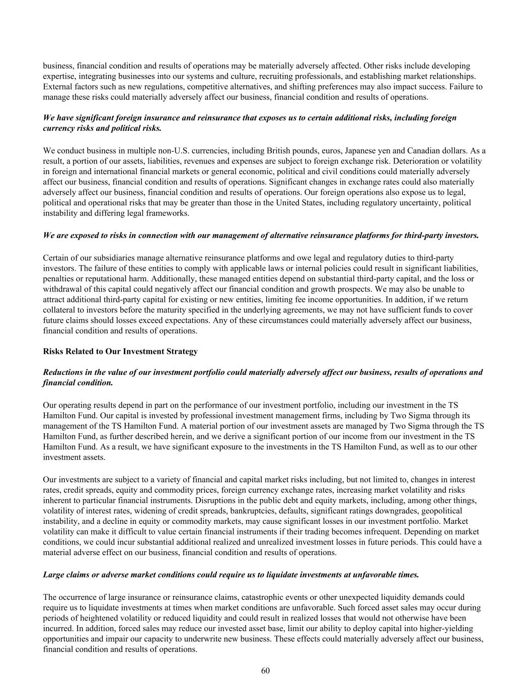 business, financial condition and results of operations may be materially adversely affected. Other risks include developing expertise, integrating businesses into our systems and culture, recruiting professionals, and establishing market relationships. External factors such as new regulations, competitive alternatives, and shifting preferences may also impact success. Failure to manage these risks could materially adversely affect our business, financial condition and results of operations. We have significant foreign insurance and reinsurance that exposes us to certain additional risks, including foreign currency risks and political risks. We conduct business in multiple non-U.S. currencies, including British pounds, euros, Japanese yen and Canadian dollars. As a result, a portion of our assets, liabilities, revenues and expenses are subject to foreign exchange risk. Deterioration or volatility in foreign and international financial markets or general economic, political and civil conditions could materially adversely affect our business, financial condition and results of operations. Significant changes in exchange rates could also materially adversely affect our business, financial condition and results of operations. Our foreign operations also expose us to legal, political and operational risks that may be greater than those in the United States, including regulatory uncertainty, political instability and differing legal frameworks. We are exposed to risks in connection with our management of alternative reinsurance platforms for third-party investors. Certain of our subsidiaries manage alternative reinsurance platforms and owe legal and regulatory duties to third-party investors. The failure of these entities to comply with applicable laws or internal policies could result in significant liabilities, penalties or reputational harm. Additionally, these managed entities depend on substantial third-party capital, and the loss or withdrawal of this capital could negatively affect our financial condition and growth prospects. We may also be unable to attract additional third-party capital for existing or new entities, limiting fee income opportunities. In addition, if we return collateral to investors before the maturity specified in the underlying agreements, we may not have sufficient funds to cover future claims should losses exceed expectations. Any of these circumstances could materially adversely affect our business, financial condition and results of operations. Risks Related to Our Investment Strategy Reductions in the value of our investment portfolio could materially adversely affect our business, results of operations and financial condition. Our operating results depend in part on the performance of our investment portfolio, including our investment in the TS Hamilton Fund. Our capital is invested by professional investment management firms, including by Two Sigma through its management of the TS Hamilton Fund. A material portion of our investment assets are managed by Two Sigma through the TS Hamilton Fund, as further described herein, and we derive a significant portion of our income from our investment in the TS Hamilton Fund. As a result, we have significant exposure to the investments in the TS Hamilton Fund, as well as to our other investment assets. Our investments are subject to a variety of financial and capital market risks including, but not limited to, changes in interest rates, credit spreads, equity and commodity prices, foreign currency exchange rates, increasing market volatility and risks inherent to particular financial instruments. Disruptions in the public debt and equity markets, including, among other things, volatility of interest rates, widening of credit spreads, bankruptcies, defaults, significant ratings downgrades, geopolitical instability, and a decline in equity or commodity markets, may cause significant losses in our investment portfolio. Market volatility can make it difficult to value certain financial instruments if their trading becomes infrequent. Depending on market conditions, we could incur substantial additional realized and unrealized investment losses in future periods. This could have a material adverse effect on our business, financial condition and results of operations. Large claims or adverse market conditions could require us to liquidate investments at unfavorable times. The occurrence of large insurance or reinsurance claims, catastrophic events or other unexpected liquidity demands could require us to liquidate investments at times when market conditions are unfavorable. Such forced asset sales may occur during periods of heightened volatility or reduced liquidity and could result in realized losses that would not otherwise have been incurred. In addition, forced sales may reduce our invested asset base, limit our ability to deploy capital into higher-yielding opportunities and impair our capacity to underwrite new business. These effects could materially adversely affect our business, financial condition and results of operations. 60