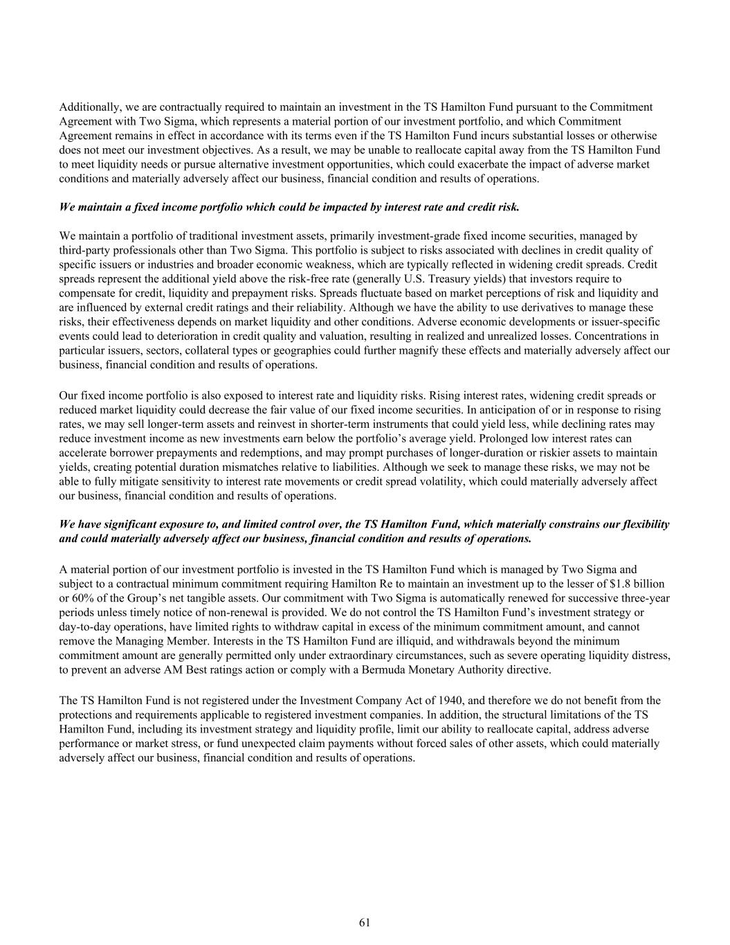 Additionally, we are contractually required to maintain an investment in the TS Hamilton Fund pursuant to the Commitment Agreement with Two Sigma, which represents a material portion of our investment portfolio, and which Commitment Agreement remains in effect in accordance with its terms even if the TS Hamilton Fund incurs substantial losses or otherwise does not meet our investment objectives. As a result, we may be unable to reallocate capital away from the TS Hamilton Fund to meet liquidity needs or pursue alternative investment opportunities, which could exacerbate the impact of adverse market conditions and materially adversely affect our business, financial condition and results of operations. We maintain a fixed income portfolio which could be impacted by interest rate and credit risk. We maintain a portfolio of traditional investment assets, primarily investment-grade fixed income securities, managed by third-party professionals other than Two Sigma. This portfolio is subject to risks associated with declines in credit quality of specific issuers or industries and broader economic weakness, which are typically reflected in widening credit spreads. Credit spreads represent the additional yield above the risk-free rate (generally U.S. Treasury yields) that investors require to compensate for credit, liquidity and prepayment risks. Spreads fluctuate based on market perceptions of risk and liquidity and are influenced by external credit ratings and their reliability. Although we have the ability to use derivatives to manage these risks, their effectiveness depends on market liquidity and other conditions. Adverse economic developments or issuer-specific events could lead to deterioration in credit quality and valuation, resulting in realized and unrealized losses. Concentrations in particular issuers, sectors, collateral types or geographies could further magnify these effects and materially adversely affect our business, financial condition and results of operations. Our fixed income portfolio is also exposed to interest rate and liquidity risks. Rising interest rates, widening credit spreads or reduced market liquidity could decrease the fair value of our fixed income securities. In anticipation of or in response to rising rates, we may sell longer-term assets and reinvest in shorter-term instruments that could yield less, while declining rates may reduce investment income as new investments earn below the portfolio’s average yield. Prolonged low interest rates can accelerate borrower prepayments and redemptions, and may prompt purchases of longer-duration or riskier assets to maintain yields, creating potential duration mismatches relative to liabilities. Although we seek to manage these risks, we may not be able to fully mitigate sensitivity to interest rate movements or credit spread volatility, which could materially adversely affect our business, financial condition and results of operations. We have significant exposure to, and limited control over, the TS Hamilton Fund, which materially constrains our flexibility and could materially adversely affect our business, financial condition and results of operations. A material portion of our investment portfolio is invested in the TS Hamilton Fund which is managed by Two Sigma and subject to a contractual minimum commitment requiring Hamilton Re to maintain an investment up to the lesser of $1.8 billion or 60% of the Group’s net tangible assets. Our commitment with Two Sigma is automatically renewed for successive three-year periods unless timely notice of non-renewal is provided. We do not control the TS Hamilton Fund’s investment strategy or day-to-day operations, have limited rights to withdraw capital in excess of the minimum commitment amount, and cannot remove the Managing Member. Interests in the TS Hamilton Fund are illiquid, and withdrawals beyond the minimum commitment amount are generally permitted only under extraordinary circumstances, such as severe operating liquidity distress, to prevent an adverse AM Best ratings action or comply with a Bermuda Monetary Authority directive. The TS Hamilton Fund is not registered under the Investment Company Act of 1940, and therefore we do not benefit from the protections and requirements applicable to registered investment companies. In addition, the structural limitations of the TS Hamilton Fund, including its investment strategy and liquidity profile, limit our ability to reallocate capital, address adverse performance or market stress, or fund unexpected claim payments without forced sales of other assets, which could materially adversely affect our business, financial condition and results of operations. 61