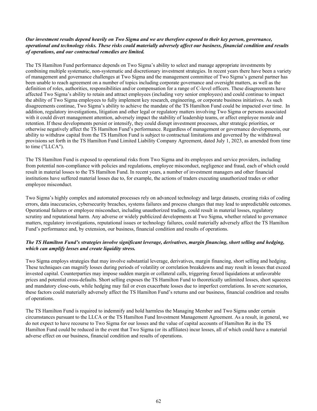 Our investment results depend heavily on Two Sigma and we are therefore exposed to their key person, governance, operational and technology risks. These risks could materially adversely affect our business, financial condition and results of operations, and our contractual remedies are limited. The TS Hamilton Fund performance depends on Two Sigma’s ability to select and manage appropriate investments by combining multiple systematic, non-systematic and discretionary investment strategies. In recent years there have been a variety of management and governance challenges at Two Sigma and the management committee of Two Sigma’s general partner has been unable to reach agreement on a number of topics including corporate governance and oversight matters, as well as the definition of roles, authorities, responsibilities and/or compensation for a range of C-level officers. These disagreements have affected Two Sigma’s ability to retain and attract employees (including very senior employees) and could continue to impact the ability of Two Sigma employees to fully implement key research, engineering, or corporate business initiatives. As such disagreements continue, Two Sigma’s ability to achieve the mandate of the TS Hamilton Fund could be impacted over time. In addition, regulatory investigations, litigation and other legal or regulatory matters involving Two Sigma or persons associated with it could divert management attention, adversely impact the stability of leadership teams, or affect employee morale and retention. If these developments persist or intensify, they could disrupt investment processes, alter strategic priorities, or otherwise negatively affect the TS Hamilton Fund’s performance. Regardless of management or governance developments, our ability to withdraw capital from the TS Hamilton Fund is subject to contractual limitations and governed by the withdrawal provisions set forth in the TS Hamilton Fund Limited Liability Company Agreement, dated July 1, 2023, as amended from time to time ("LLCA"). The TS Hamilton Fund is exposed to operational risks from Two Sigma and its employees and service providers, including from potential non-compliance with policies and regulations, employee misconduct, negligence and fraud, each of which could result in material losses to the TS Hamilton Fund. In recent years, a number of investment managers and other financial institutions have suffered material losses due to, for example, the actions of traders executing unauthorized trades or other employee misconduct. Two Sigma’s highly complex and automated processes rely on advanced technology and large datasets, creating risks of coding errors, data inaccuracies, cybersecurity breaches, systems failures and process changes that may lead to unpredictable outcomes. Operational failures or employee misconduct, including unauthorized trading, could result in material losses, regulatory scrutiny and reputational harm. Any adverse or widely publicized developments at Two Sigma, whether related to governance matters, regulatory investigations, reputational issues or technology failures, could materially adversely affect the TS Hamilton Fund’s performance and, by extension, our business, financial condition and results of operations. The TS Hamilton Fund’s strategies involve significant leverage, derivatives, margin financing, short selling and hedging, which can amplify losses and create liquidity stress. Two Sigma employs strategies that may involve substantial leverage, derivatives, margin financing, short selling and hedging. These techniques can magnify losses during periods of volatility or correlation breakdowns and may result in losses that exceed invested capital. Counterparties may impose sudden margin or collateral calls, triggering forced liquidations at unfavorable prices and potential cross-defaults. Short selling exposes the TS Hamilton Fund to theoretically unlimited losses, short squeezes and mandatory close-outs, while hedging may fail or even exacerbate losses due to imperfect correlations. In severe scenarios, these factors could materially adversely affect the TS Hamilton Fund’s returns and our business, financial condition and results of operations. The TS Hamilton Fund is required to indemnify and hold harmless the Managing Member and Two Sigma under certain circumstances pursuant to the LLCA or the TS Hamilton Fund Investment Management Agreement. As a result, in general, we do not expect to have recourse to Two Sigma for our losses and the value of capital accounts of Hamilton Re in the TS Hamilton Fund could be reduced in the event that Two Sigma (or its affiliates) incur losses, all of which could have a material adverse effect on our business, financial condition and results of operations. 62