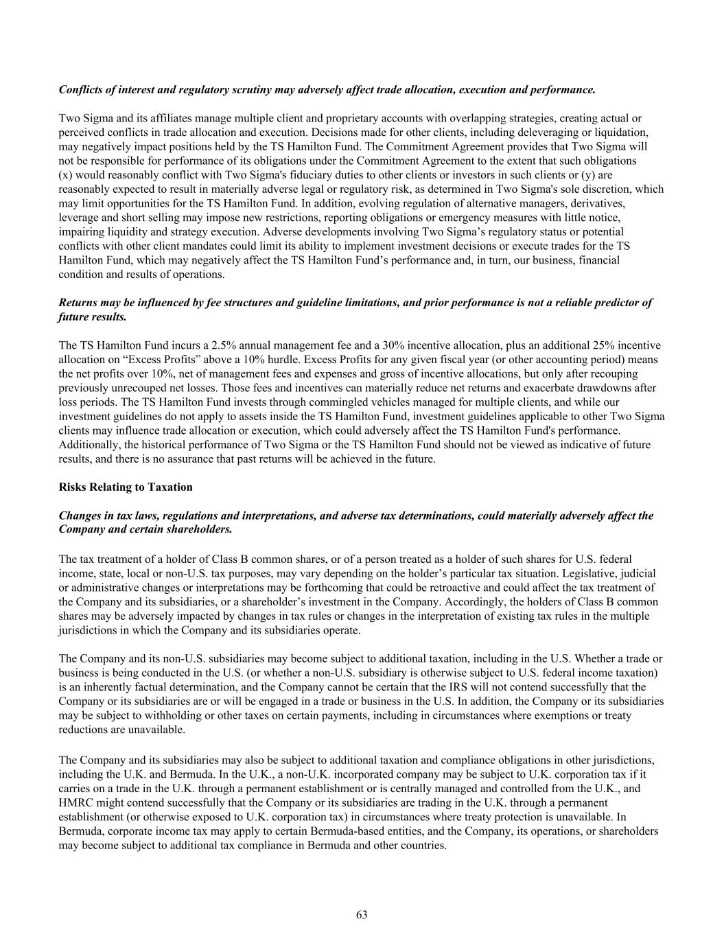 Conflicts of interest and regulatory scrutiny may adversely affect trade allocation, execution and performance. Two Sigma and its affiliates manage multiple client and proprietary accounts with overlapping strategies, creating actual or perceived conflicts in trade allocation and execution. Decisions made for other clients, including deleveraging or liquidation, may negatively impact positions held by the TS Hamilton Fund. The Commitment Agreement provides that Two Sigma will not be responsible for performance of its obligations under the Commitment Agreement to the extent that such obligations (x) would reasonably conflict with Two Sigma's fiduciary duties to other clients or investors in such clients or (y) are reasonably expected to result in materially adverse legal or regulatory risk, as determined in Two Sigma's sole discretion, which may limit opportunities for the TS Hamilton Fund. In addition, evolving regulation of alternative managers, derivatives, leverage and short selling may impose new restrictions, reporting obligations or emergency measures with little notice, impairing liquidity and strategy execution. Adverse developments involving Two Sigma’s regulatory status or potential conflicts with other client mandates could limit its ability to implement investment decisions or execute trades for the TS Hamilton Fund, which may negatively affect the TS Hamilton Fund’s performance and, in turn, our business, financial condition and results of operations. Returns may be influenced by fee structures and guideline limitations, and prior performance is not a reliable predictor of future results. The TS Hamilton Fund incurs a 2.5% annual management fee and a 30% incentive allocation, plus an additional 25% incentive allocation on “Excess Profits” above a 10% hurdle. Excess Profits for any given fiscal year (or other accounting period) means the net profits over 10%, net of management fees and expenses and gross of incentive allocations, but only after recouping previously unrecouped net losses. Those fees and incentives can materially reduce net returns and exacerbate drawdowns after loss periods. The TS Hamilton Fund invests through commingled vehicles managed for multiple clients, and while our investment guidelines do not apply to assets inside the TS Hamilton Fund, investment guidelines applicable to other Two Sigma clients may influence trade allocation or execution, which could adversely affect the TS Hamilton Fund's performance. Additionally, the historical performance of Two Sigma or the TS Hamilton Fund should not be viewed as indicative of future results, and there is no assurance that past returns will be achieved in the future. Risks Relating to Taxation Changes in tax laws, regulations and interpretations, and adverse tax determinations, could materially adversely affect the Company and certain shareholders. The tax treatment of a holder of Class B common shares, or of a person treated as a holder of such shares for U.S. federal income, state, local or non-U.S. tax purposes, may vary depending on the holder’s particular tax situation. Legislative, judicial or administrative changes or interpretations may be forthcoming that could be retroactive and could affect the tax treatment of the Company and its subsidiaries, or a shareholder’s investment in the Company. Accordingly, the holders of Class B common shares may be adversely impacted by changes in tax rules or changes in the interpretation of existing tax rules in the multiple jurisdictions in which the Company and its subsidiaries operate. The Company and its non-U.S. subsidiaries may become subject to additional taxation, including in the U.S. Whether a trade or business is being conducted in the U.S. (or whether a non-U.S. subsidiary is otherwise subject to U.S. federal income taxation) is an inherently factual determination, and the Company cannot be certain that the IRS will not contend successfully that the Company or its subsidiaries are or will be engaged in a trade or business in the U.S. In addition, the Company or its subsidiaries may be subject to withholding or other taxes on certain payments, including in circumstances where exemptions or treaty reductions are unavailable. The Company and its subsidiaries may also be subject to additional taxation and compliance obligations in other jurisdictions, including the U.K. and Bermuda. In the U.K., a non-U.K. incorporated company may be subject to U.K. corporation tax if it carries on a trade in the U.K. through a permanent establishment or is centrally managed and controlled from the U.K., and HMRC might contend successfully that the Company or its subsidiaries are trading in the U.K. through a permanent establishment (or otherwise exposed to U.K. corporation tax) in circumstances where treaty protection is unavailable. In Bermuda, corporate income tax may apply to certain Bermuda-based entities, and the Company, its operations, or shareholders may become subject to additional tax compliance in Bermuda and other countries. 63