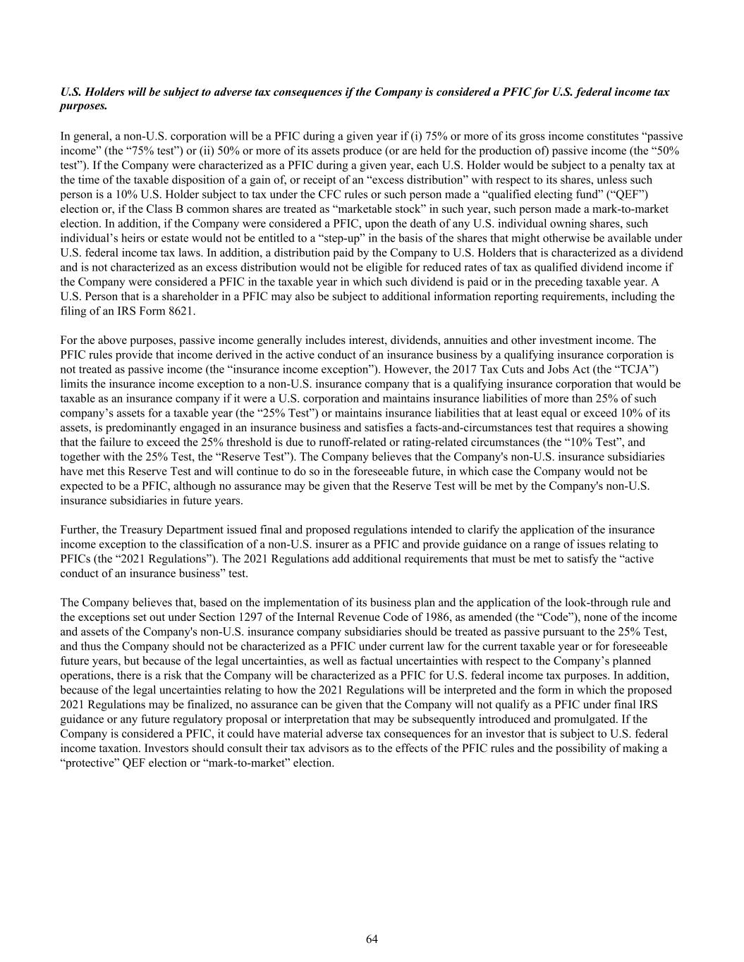 U.S. Holders will be subject to adverse tax consequences if the Company is considered a PFIC for U.S. federal income tax purposes. In general, a non-U.S. corporation will be a PFIC during a given year if (i) 75% or more of its gross income constitutes “passive income” (the “75% test”) or (ii) 50% or more of its assets produce (or are held for the production of) passive income (the “50% test”). If the Company were characterized as a PFIC during a given year, each U.S. Holder would be subject to a penalty tax at the time of the taxable disposition of a gain of, or receipt of an “excess distribution” with respect to its shares, unless such person is a 10% U.S. Holder subject to tax under the CFC rules or such person made a “qualified electing fund” (“QEF”) election or, if the Class B common shares are treated as “marketable stock” in such year, such person made a mark-to-market election. In addition, if the Company were considered a PFIC, upon the death of any U.S. individual owning shares, such individual’s heirs or estate would not be entitled to a “step-up” in the basis of the shares that might otherwise be available under U.S. federal income tax laws. In addition, a distribution paid by the Company to U.S. Holders that is characterized as a dividend and is not characterized as an excess distribution would not be eligible for reduced rates of tax as qualified dividend income if the Company were considered a PFIC in the taxable year in which such dividend is paid or in the preceding taxable year. A U.S. Person that is a shareholder in a PFIC may also be subject to additional information reporting requirements, including the filing of an IRS Form 8621. For the above purposes, passive income generally includes interest, dividends, annuities and other investment income. The PFIC rules provide that income derived in the active conduct of an insurance business by a qualifying insurance corporation is not treated as passive income (the “insurance income exception”). However, the 2017 Tax Cuts and Jobs Act (the “TCJA”) limits the insurance income exception to a non-U.S. insurance company that is a qualifying insurance corporation that would be taxable as an insurance company if it were a U.S. corporation and maintains insurance liabilities of more than 25% of such company’s assets for a taxable year (the “25% Test”) or maintains insurance liabilities that at least equal or exceed 10% of its assets, is predominantly engaged in an insurance business and satisfies a facts-and-circumstances test that requires a showing that the failure to exceed the 25% threshold is due to runoff-related or rating-related circumstances (the “10% Test”, and together with the 25% Test, the “Reserve Test”). The Company believes that the Company's non-U.S. insurance subsidiaries have met this Reserve Test and will continue to do so in the foreseeable future, in which case the Company would not be expected to be a PFIC, although no assurance may be given that the Reserve Test will be met by the Company's non-U.S. insurance subsidiaries in future years. Further, the Treasury Department issued final and proposed regulations intended to clarify the application of the insurance income exception to the classification of a non-U.S. insurer as a PFIC and provide guidance on a range of issues relating to PFICs (the “2021 Regulations”). The 2021 Regulations add additional requirements that must be met to satisfy the “active conduct of an insurance business” test. The Company believes that, based on the implementation of its business plan and the application of the look-through rule and the exceptions set out under Section 1297 of the Internal Revenue Code of 1986, as amended (the “Code”), none of the income and assets of the Company's non-U.S. insurance company subsidiaries should be treated as passive pursuant to the 25% Test, and thus the Company should not be characterized as a PFIC under current law for the current taxable year or for foreseeable future years, but because of the legal uncertainties, as well as factual uncertainties with respect to the Company’s planned operations, there is a risk that the Company will be characterized as a PFIC for U.S. federal income tax purposes. In addition, because of the legal uncertainties relating to how the 2021 Regulations will be interpreted and the form in which the proposed 2021 Regulations may be finalized, no assurance can be given that the Company will not qualify as a PFIC under final IRS guidance or any future regulatory proposal or interpretation that may be subsequently introduced and promulgated. If the Company is considered a PFIC, it could have material adverse tax consequences for an investor that is subject to U.S. federal income taxation. Investors should consult their tax advisors as to the effects of the PFIC rules and the possibility of making a “protective” QEF election or “mark-to-market” election. 64