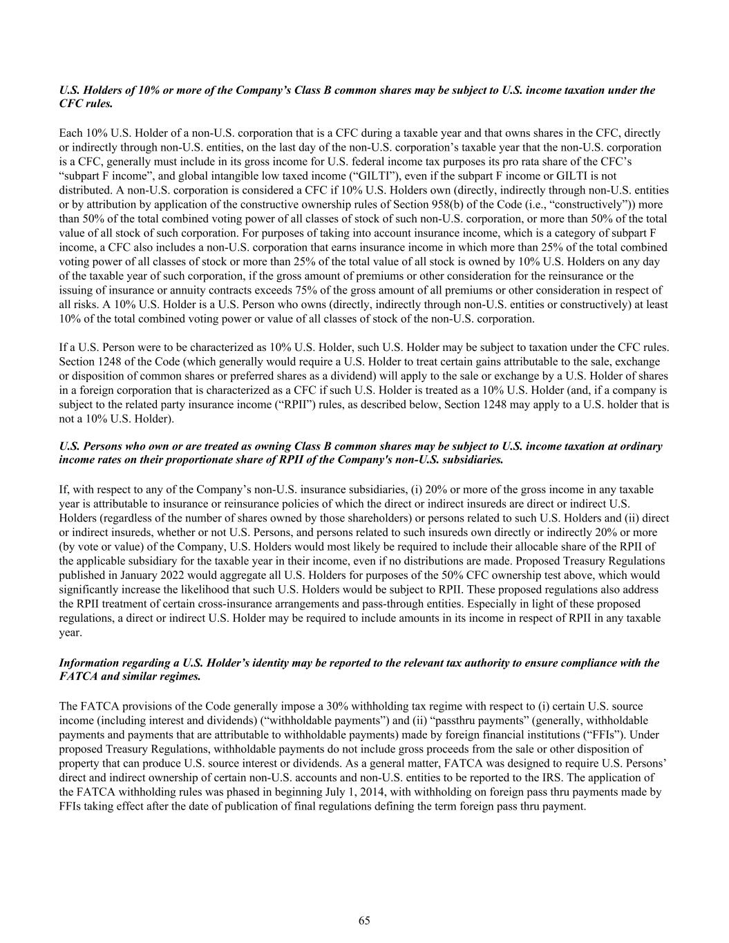 U.S. Holders of 10% or more of the Company’s Class B common shares may be subject to U.S. income taxation under the CFC rules. Each 10% U.S. Holder of a non-U.S. corporation that is a CFC during a taxable year and that owns shares in the CFC, directly or indirectly through non-U.S. entities, on the last day of the non-U.S. corporation’s taxable year that the non-U.S. corporation is a CFC, generally must include in its gross income for U.S. federal income tax purposes its pro rata share of the CFC’s “subpart F income”, and global intangible low taxed income (“GILTI”), even if the subpart F income or GILTI is not distributed. A non-U.S. corporation is considered a CFC if 10% U.S. Holders own (directly, indirectly through non-U.S. entities or by attribution by application of the constructive ownership rules of Section 958(b) of the Code (i.e., “constructively”)) more than 50% of the total combined voting power of all classes of stock of such non-U.S. corporation, or more than 50% of the total value of all stock of such corporation. For purposes of taking into account insurance income, which is a category of subpart F income, a CFC also includes a non-U.S. corporation that earns insurance income in which more than 25% of the total combined voting power of all classes of stock or more than 25% of the total value of all stock is owned by 10% U.S. Holders on any day of the taxable year of such corporation, if the gross amount of premiums or other consideration for the reinsurance or the issuing of insurance or annuity contracts exceeds 75% of the gross amount of all premiums or other consideration in respect of all risks. A 10% U.S. Holder is a U.S. Person who owns (directly, indirectly through non-U.S. entities or constructively) at least 10% of the total combined voting power or value of all classes of stock of the non-U.S. corporation. If a U.S. Person were to be characterized as 10% U.S. Holder, such U.S. Holder may be subject to taxation under the CFC rules. Section 1248 of the Code (which generally would require a U.S. Holder to treat certain gains attributable to the sale, exchange or disposition of common shares or preferred shares as a dividend) will apply to the sale or exchange by a U.S. Holder of shares in a foreign corporation that is characterized as a CFC if such U.S. Holder is treated as a 10% U.S. Holder (and, if a company is subject to the related party insurance income (“RPII”) rules, as described below, Section 1248 may apply to a U.S. holder that is not a 10% U.S. Holder). U.S. Persons who own or are treated as owning Class B common shares may be subject to U.S. income taxation at ordinary income rates on their proportionate share of RPII of the Company's non-U.S. subsidiaries. If, with respect to any of the Company’s non-U.S. insurance subsidiaries, (i) 20% or more of the gross income in any taxable year is attributable to insurance or reinsurance policies of which the direct or indirect insureds are direct or indirect U.S. Holders (regardless of the number of shares owned by those shareholders) or persons related to such U.S. Holders and (ii) direct or indirect insureds, whether or not U.S. Persons, and persons related to such insureds own directly or indirectly 20% or more (by vote or value) of the Company, U.S. Holders would most likely be required to include their allocable share of the RPII of the applicable subsidiary for the taxable year in their income, even if no distributions are made. Proposed Treasury Regulations published in January 2022 would aggregate all U.S. Holders for purposes of the 50% CFC ownership test above, which would significantly increase the likelihood that such U.S. Holders would be subject to RPII. These proposed regulations also address the RPII treatment of certain cross-insurance arrangements and pass-through entities. Especially in light of these proposed regulations, a direct or indirect U.S. Holder may be required to include amounts in its income in respect of RPII in any taxable year. Information regarding a U.S. Holder’s identity may be reported to the relevant tax authority to ensure compliance with the FATCA and similar regimes. The FATCA provisions of the Code generally impose a 30% withholding tax regime with respect to (i) certain U.S. source income (including interest and dividends) (“withholdable payments”) and (ii) “passthru payments” (generally, withholdable payments and payments that are attributable to withholdable payments) made by foreign financial institutions (“FFIs”). Under proposed Treasury Regulations, withholdable payments do not include gross proceeds from the sale or other disposition of property that can produce U.S. source interest or dividends. As a general matter, FATCA was designed to require U.S. Persons’ direct and indirect ownership of certain non-U.S. accounts and non-U.S. entities to be reported to the IRS. The application of the FATCA withholding rules was phased in beginning July 1, 2014, with withholding on foreign pass thru payments made by FFIs taking effect after the date of publication of final regulations defining the term foreign pass thru payment. 65