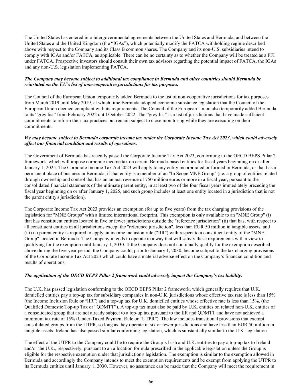 The United States has entered into intergovernmental agreements between the United States and Bermuda, and between the United States and the United Kingdom (the “IGAs”), which potentially modify the FATCA withholding regime described above with respect to the Company and its Class B common shares. The Company and its non-U.S. subsidiaries intend to comply with IGAs and/or FATCA, as applicable. There can be no certainty as to whether the Company will be treated as a FFI under FATCA. Prospective investors should consult their own tax advisors regarding the potential impact of FATCA, the IGAs and any non-U.S. legislation implementing FATCA. The Company may become subject to additional tax compliance in Bermuda and other countries should Bermuda be reinstated on the EU’s list of non-cooperative jurisdictions for tax purposes. The Council of the European Union temporarily added Bermuda to the list of non-cooperative jurisdictions for tax purposes from March 2019 until May 2019, at which time Bermuda adopted economic substance legislation that the Council of the European Union deemed compliant with its requirements. The Council of the European Union also temporarily added Bermuda to its “grey list” from February 2022 until October 2022. The “grey list” is a list of jurisdictions that have made sufficient commitments to reform their tax practices but remain subject to close monitoring while they are executing on their commitments. We may become subject to Bermuda corporate income tax under the Corporate Income Tax Act 2023, which could adversely affect our financial condition and results of operations. The Government of Bermuda has recently passed the Corporate Income Tax Act 2023, conforming to the OECD BEPS Pillar 2 framework, which will impose corporate income tax on certain Bermuda-based entities for fiscal years beginning on or after January 1, 2025. The Corporate Income Tax Act 2023 will apply to any entity incorporated or formed in Bermuda, or that has a permanent place of business in Bermuda, if that entity is a member of an "In Scope MNE Group" (i.e. a group of entities related through ownership and control that has an annual revenue of 750 million euros or more in a fiscal year, pursuant to the consolidated financial statements of the ultimate parent entity, in at least two of the four fiscal years immediately preceding the fiscal year beginning on or after January 1, 2025, and such group includes at least one entity located in a jurisdiction that is not the parent entity's jurisdiction). The Corporate Income Tax Act 2023 provides an exemption (for up to five years) from the tax charging provisions of the legislation for "MNE Groups" with a limited international footprint. This exemption is only available to an "MNE Group" (i) that has constituent entities located in five or fewer jurisdictions outside the "reference jurisdiction" (ii) that has, with respect to all constituent entities in all jurisdictions except the "reference jurisdiction", less than EUR 50 million in tangible assets, and (iii) no parent entity is required to apply an income inclusion rule ("IIR") with respect to a constituent entity of the "MNE Group" located in Bermuda. The Company intends to operate in a way that will satisfy these requirements with a view to qualifying for the exemption until January 1, 2030. If the Company does not continually qualify for the exemption described above during the five-year period, the Company could, prior to January 1, 2030, become subject to the tax charging provisions of the Corporate Income Tax Act 2023 which could have a material adverse effect on the Company’s financial condition and results of operations. The application of the OECD BEPS Pillar 2 framework could adversely impact the Company’s tax liability. The U.K. has passed legislation conforming to the OECD BEPS Pillar 2 framework, which generally requires that U.K. domiciled entities pay a top-up tax for subsidiary companies in non-U.K. jurisdictions whose effective tax rate is less than 15% (the Income Inclusion Rule or “IIR”) and a top-up tax for U.K. domiciled entities whose effective rate is less than 15%, (the Qualified Domestic Top-up Tax or “QDMTT”). A top-up tax must also be paid by U.K. entities on related non-U.K. entities of a consolidated group that are not already subject to a top-up tax pursuant to the IIR and QDMTT and have not achieved a minimum tax rate of 15% (Under-Taxed Payment Rule or “UTPR”). The law includes transitional provisions that exempt consolidated groups from the UTPR, so long as they operate in six or fewer jurisdictions and have less than EUR 50 million in tangible assets. Ireland has also passed similar conforming legislation, which is substantially similar to the U.K. legislation. The effect of the UTPR to the Company could be to require the Group’s Irish and U.K. entities to pay a top-up tax to Ireland and/or the U.K., respectively, pursuant to an allocation formula prescribed in the applicable legislation unless the Group is eligible for the respective exemption under that jurisdiction's legislation. The exemption is similar to the exemption allowed in Bermuda and accordingly the Company intends to meet the exemption requirements and be exempt from applying the UTPR to its Bermuda entities until January 1, 2030. However, no assurance can be made that the Company will meet the requirement in 66