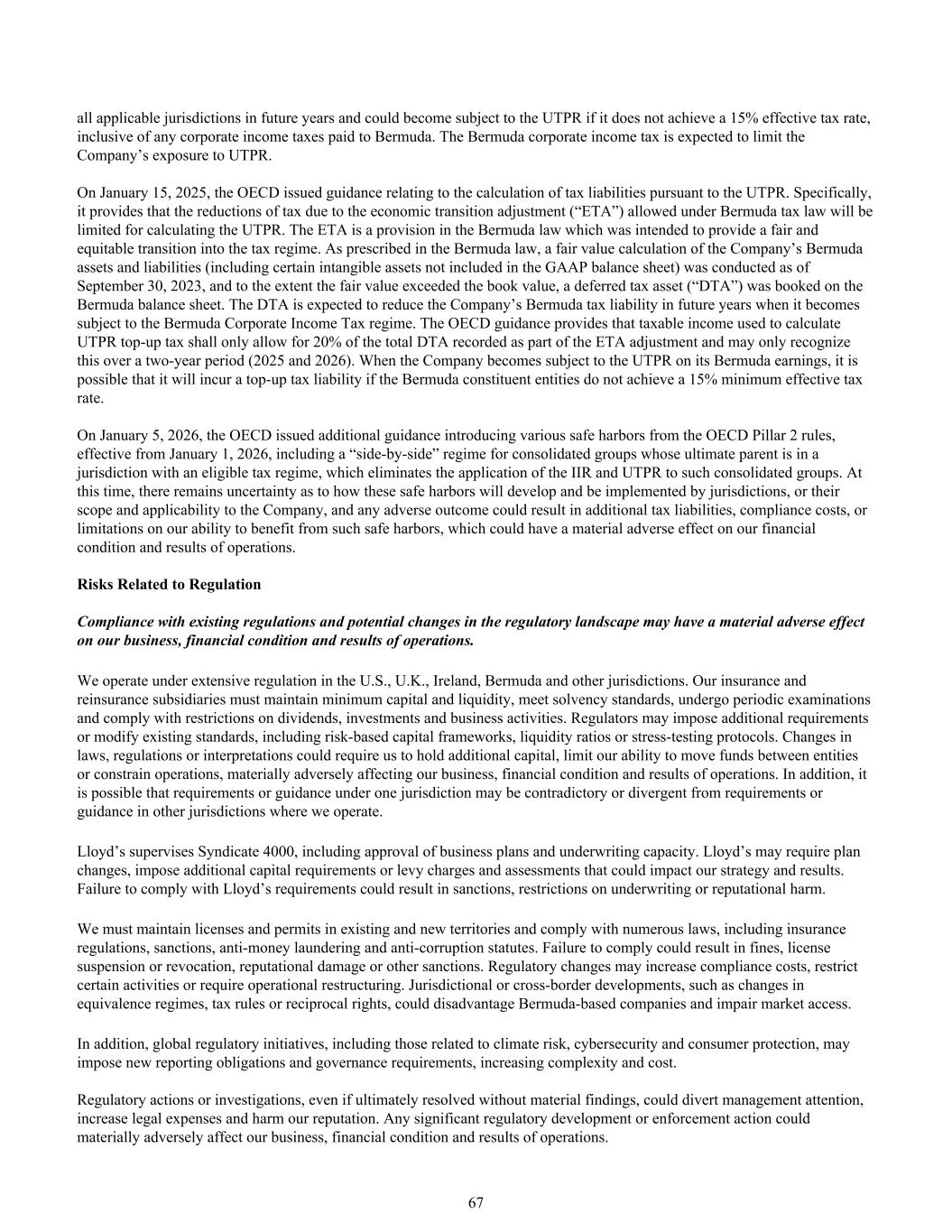 all applicable jurisdictions in future years and could become subject to the UTPR if it does not achieve a 15% effective tax rate, inclusive of any corporate income taxes paid to Bermuda. The Bermuda corporate income tax is expected to limit the Company’s exposure to UTPR. On January 15, 2025, the OECD issued guidance relating to the calculation of tax liabilities pursuant to the UTPR. Specifically, it provides that the reductions of tax due to the economic transition adjustment (“ETA”) allowed under Bermuda tax law will be limited for calculating the UTPR. The ETA is a provision in the Bermuda law which was intended to provide a fair and equitable transition into the tax regime. As prescribed in the Bermuda law, a fair value calculation of the Company’s Bermuda assets and liabilities (including certain intangible assets not included in the GAAP balance sheet) was conducted as of September 30, 2023, and to the extent the fair value exceeded the book value, a deferred tax asset (“DTA”) was booked on the Bermuda balance sheet. The DTA is expected to reduce the Company’s Bermuda tax liability in future years when it becomes subject to the Bermuda Corporate Income Tax regime. The OECD guidance provides that taxable income used to calculate UTPR top-up tax shall only allow for 20% of the total DTA recorded as part of the ETA adjustment and may only recognize this over a two-year period (2025 and 2026). When the Company becomes subject to the UTPR on its Bermuda earnings, it is possible that it will incur a top-up tax liability if the Bermuda constituent entities do not achieve a 15% minimum effective tax rate. On January 5, 2026, the OECD issued additional guidance introducing various safe harbors from the OECD Pillar 2 rules, effective from January 1, 2026, including a “side-by-side” regime for consolidated groups whose ultimate parent is in a jurisdiction with an eligible tax regime, which eliminates the application of the IIR and UTPR to such consolidated groups. At this time, there remains uncertainty as to how these safe harbors will develop and be implemented by jurisdictions, or their scope and applicability to the Company, and any adverse outcome could result in additional tax liabilities, compliance costs, or limitations on our ability to benefit from such safe harbors, which could have a material adverse effect on our financial condition and results of operations. Risks Related to Regulation Compliance with existing regulations and potential changes in the regulatory landscape may have a material adverse effect on our business, financial condition and results of operations. We operate under extensive regulation in the U.S., U.K., Ireland, Bermuda and other jurisdictions. Our insurance and reinsurance subsidiaries must maintain minimum capital and liquidity, meet solvency standards, undergo periodic examinations and comply with restrictions on dividends, investments and business activities. Regulators may impose additional requirements or modify existing standards, including risk-based capital frameworks, liquidity ratios or stress-testing protocols. Changes in laws, regulations or interpretations could require us to hold additional capital, limit our ability to move funds between entities or constrain operations, materially adversely affecting our business, financial condition and results of operations. In addition, it is possible that requirements or guidance under one jurisdiction may be contradictory or divergent from requirements or guidance in other jurisdictions where we operate. Lloyd’s supervises Syndicate 4000, including approval of business plans and underwriting capacity. Lloyd’s may require plan changes, impose additional capital requirements or levy charges and assessments that could impact our strategy and results. Failure to comply with Lloyd’s requirements could result in sanctions, restrictions on underwriting or reputational harm. We must maintain licenses and permits in existing and new territories and comply with numerous laws, including insurance regulations, sanctions, anti-money laundering and anti-corruption statutes. Failure to comply could result in fines, license suspension or revocation, reputational damage or other sanctions. Regulatory changes may increase compliance costs, restrict certain activities or require operational restructuring. Jurisdictional or cross-border developments, such as changes in equivalence regimes, tax rules or reciprocal rights, could disadvantage Bermuda-based companies and impair market access. In addition, global regulatory initiatives, including those related to climate risk, cybersecurity and consumer protection, may impose new reporting obligations and governance requirements, increasing complexity and cost. Regulatory actions or investigations, even if ultimately resolved without material findings, could divert management attention, increase legal expenses and harm our reputation. Any significant regulatory development or enforcement action could materially adversely affect our business, financial condition and results of operations. 67