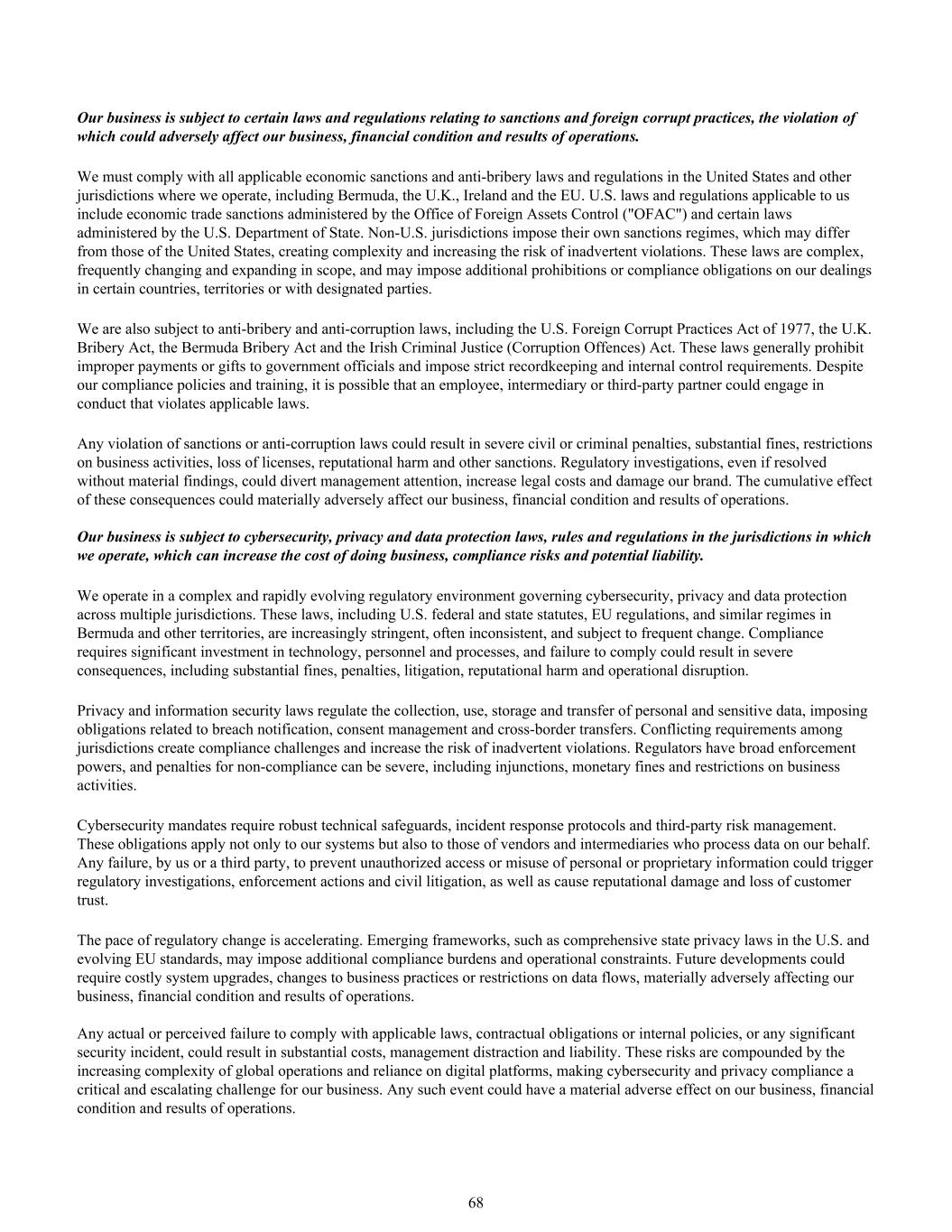Our business is subject to certain laws and regulations relating to sanctions and foreign corrupt practices, the violation of which could adversely affect our business, financial condition and results of operations. We must comply with all applicable economic sanctions and anti-bribery laws and regulations in the United States and other jurisdictions where we operate, including Bermuda, the U.K., Ireland and the EU. U.S. laws and regulations applicable to us include economic trade sanctions administered by the Office of Foreign Assets Control ("OFAC") and certain laws administered by the U.S. Department of State. Non-U.S. jurisdictions impose their own sanctions regimes, which may differ from those of the United States, creating complexity and increasing the risk of inadvertent violations. These laws are complex, frequently changing and expanding in scope, and may impose additional prohibitions or compliance obligations on our dealings in certain countries, territories or with designated parties. We are also subject to anti-bribery and anti-corruption laws, including the U.S. Foreign Corrupt Practices Act of 1977, the U.K. Bribery Act, the Bermuda Bribery Act and the Irish Criminal Justice (Corruption Offences) Act. These laws generally prohibit improper payments or gifts to government officials and impose strict recordkeeping and internal control requirements. Despite our compliance policies and training, it is possible that an employee, intermediary or third-party partner could engage in conduct that violates applicable laws. Any violation of sanctions or anti-corruption laws could result in severe civil or criminal penalties, substantial fines, restrictions on business activities, loss of licenses, reputational harm and other sanctions. Regulatory investigations, even if resolved without material findings, could divert management attention, increase legal costs and damage our brand. The cumulative effect of these consequences could materially adversely affect our business, financial condition and results of operations. Our business is subject to cybersecurity, privacy and data protection laws, rules and regulations in the jurisdictions in which we operate, which can increase the cost of doing business, compliance risks and potential liability. We operate in a complex and rapidly evolving regulatory environment governing cybersecurity, privacy and data protection across multiple jurisdictions. These laws, including U.S. federal and state statutes, EU regulations, and similar regimes in Bermuda and other territories, are increasingly stringent, often inconsistent, and subject to frequent change. Compliance requires significant investment in technology, personnel and processes, and failure to comply could result in severe consequences, including substantial fines, penalties, litigation, reputational harm and operational disruption. Privacy and information security laws regulate the collection, use, storage and transfer of personal and sensitive data, imposing obligations related to breach notification, consent management and cross-border transfers. Conflicting requirements among jurisdictions create compliance challenges and increase the risk of inadvertent violations. Regulators have broad enforcement powers, and penalties for non-compliance can be severe, including injunctions, monetary fines and restrictions on business activities. Cybersecurity mandates require robust technical safeguards, incident response protocols and third-party risk management. These obligations apply not only to our systems but also to those of vendors and intermediaries who process data on our behalf. Any failure, by us or a third party, to prevent unauthorized access or misuse of personal or proprietary information could trigger regulatory investigations, enforcement actions and civil litigation, as well as cause reputational damage and loss of customer trust. The pace of regulatory change is accelerating. Emerging frameworks, such as comprehensive state privacy laws in the U.S. and evolving EU standards, may impose additional compliance burdens and operational constraints. Future developments could require costly system upgrades, changes to business practices or restrictions on data flows, materially adversely affecting our business, financial condition and results of operations. Any actual or perceived failure to comply with applicable laws, contractual obligations or internal policies, or any significant security incident, could result in substantial costs, management distraction and liability. These risks are compounded by the increasing complexity of global operations and reliance on digital platforms, making cybersecurity and privacy compliance a critical and escalating challenge for our business. Any such event could have a material adverse effect on our business, financial condition and results of operations. 68