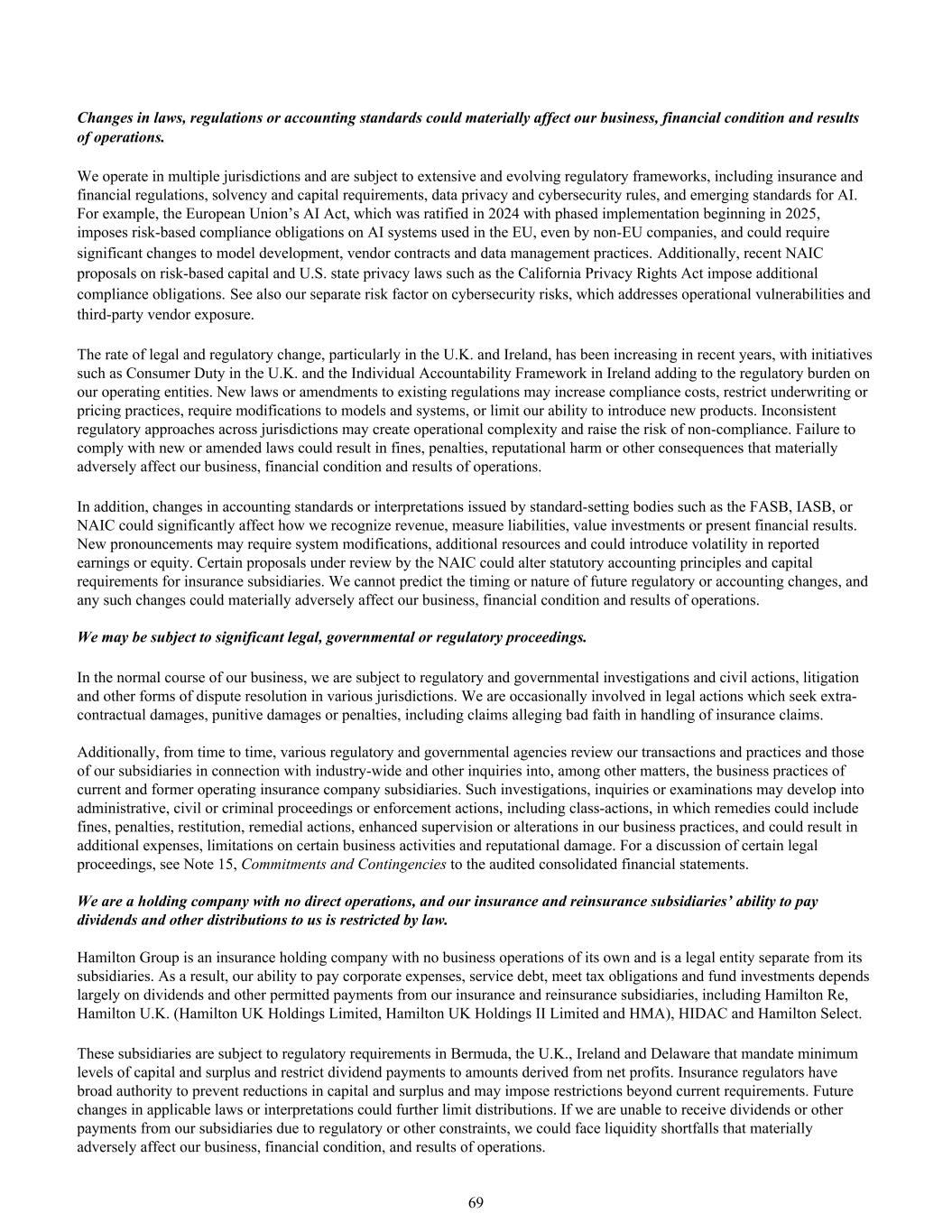 Changes in laws, regulations or accounting standards could materially affect our business, financial condition and results of operations. We operate in multiple jurisdictions and are subject to extensive and evolving regulatory frameworks, including insurance and financial regulations, solvency and capital requirements, data privacy and cybersecurity rules, and emerging standards for AI. For example, the European Union’s AI Act, which was ratified in 2024 with phased implementation beginning in 2025, imposes risk-based compliance obligations on AI systems used in the EU, even by non-EU companies, and could require significant changes to model development, vendor contracts and data management practices. Additionally, recent NAIC proposals on risk-based capital and U.S. state privacy laws such as the California Privacy Rights Act impose additional compliance obligations. See also our separate risk factor on cybersecurity risks, which addresses operational vulnerabilities and third-party vendor exposure. The rate of legal and regulatory change, particularly in the U.K. and Ireland, has been increasing in recent years, with initiatives such as Consumer Duty in the U.K. and the Individual Accountability Framework in Ireland adding to the regulatory burden on our operating entities. New laws or amendments to existing regulations may increase compliance costs, restrict underwriting or pricing practices, require modifications to models and systems, or limit our ability to introduce new products. Inconsistent regulatory approaches across jurisdictions may create operational complexity and raise the risk of non-compliance. Failure to comply with new or amended laws could result in fines, penalties, reputational harm or other consequences that materially adversely affect our business, financial condition and results of operations. In addition, changes in accounting standards or interpretations issued by standard-setting bodies such as the FASB, IASB, or NAIC could significantly affect how we recognize revenue, measure liabilities, value investments or present financial results. New pronouncements may require system modifications, additional resources and could introduce volatility in reported earnings or equity. Certain proposals under review by the NAIC could alter statutory accounting principles and capital requirements for insurance subsidiaries. We cannot predict the timing or nature of future regulatory or accounting changes, and any such changes could materially adversely affect our business, financial condition and results of operations. We may be subject to significant legal, governmental or regulatory proceedings. In the normal course of our business, we are subject to regulatory and governmental investigations and civil actions, litigation and other forms of dispute resolution in various jurisdictions. We are occasionally involved in legal actions which seek extra- contractual damages, punitive damages or penalties, including claims alleging bad faith in handling of insurance claims. Additionally, from time to time, various regulatory and governmental agencies review our transactions and practices and those of our subsidiaries in connection with industry-wide and other inquiries into, among other matters, the business practices of current and former operating insurance company subsidiaries. Such investigations, inquiries or examinations may develop into administrative, civil or criminal proceedings or enforcement actions, including class-actions, in which remedies could include fines, penalties, restitution, remedial actions, enhanced supervision or alterations in our business practices, and could result in additional expenses, limitations on certain business activities and reputational damage. For a discussion of certain legal proceedings, see Note 15, Commitments and Contingencies to the audited consolidated financial statements. We are a holding company with no direct operations, and our insurance and reinsurance subsidiaries’ ability to pay dividends and other distributions to us is restricted by law. Hamilton Group is an insurance holding company with no business operations of its own and is a legal entity separate from its subsidiaries. As a result, our ability to pay corporate expenses, service debt, meet tax obligations and fund investments depends largely on dividends and other permitted payments from our insurance and reinsurance subsidiaries, including Hamilton Re, Hamilton U.K. (Hamilton UK Holdings Limited, Hamilton UK Holdings II Limited and HMA), HIDAC and Hamilton Select. These subsidiaries are subject to regulatory requirements in Bermuda, the U.K., Ireland and Delaware that mandate minimum levels of capital and surplus and restrict dividend payments to amounts derived from net profits. Insurance regulators have broad authority to prevent reductions in capital and surplus and may impose restrictions beyond current requirements. Future changes in applicable laws or interpretations could further limit distributions. If we are unable to receive dividends or other payments from our subsidiaries due to regulatory or other constraints, we could face liquidity shortfalls that materially adversely affect our business, financial condition, and results of operations. 69