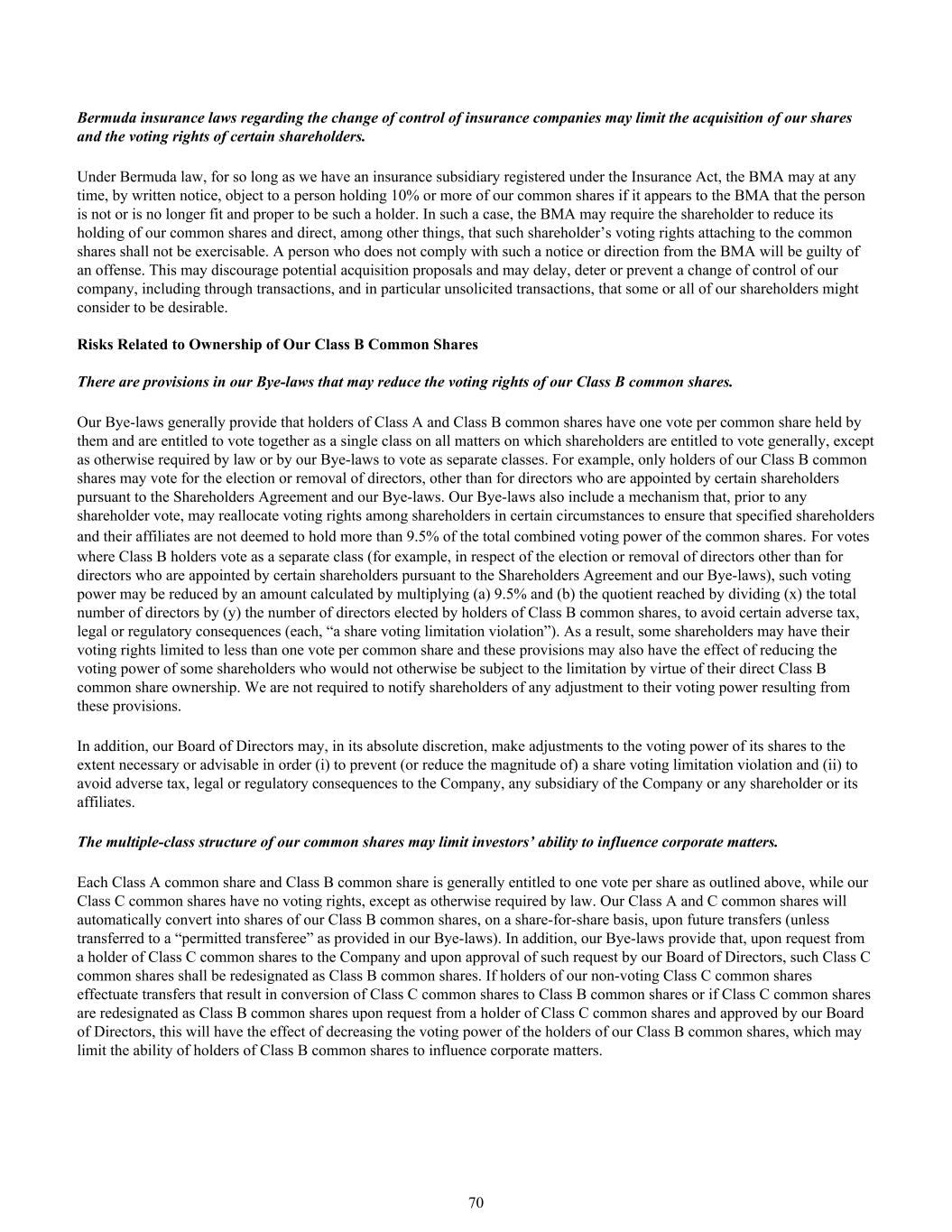 Bermuda insurance laws regarding the change of control of insurance companies may limit the acquisition of our shares and the voting rights of certain shareholders. Under Bermuda law, for so long as we have an insurance subsidiary registered under the Insurance Act, the BMA may at any time, by written notice, object to a person holding 10% or more of our common shares if it appears to the BMA that the person is not or is no longer fit and proper to be such a holder. In such a case, the BMA may require the shareholder to reduce its holding of our common shares and direct, among other things, that such shareholder’s voting rights attaching to the common shares shall not be exercisable. A person who does not comply with such a notice or direction from the BMA will be guilty of an offense. This may discourage potential acquisition proposals and may delay, deter or prevent a change of control of our company, including through transactions, and in particular unsolicited transactions, that some or all of our shareholders might consider to be desirable. Risks Related to Ownership of Our Class B Common Shares There are provisions in our Bye-laws that may reduce the voting rights of our Class B common shares. Our Bye-laws generally provide that holders of Class A and Class B common shares have one vote per common share held by them and are entitled to vote together as a single class on all matters on which shareholders are entitled to vote generally, except as otherwise required by law or by our Bye-laws to vote as separate classes. For example, only holders of our Class B common shares may vote for the election or removal of directors, other than for directors who are appointed by certain shareholders pursuant to the Shareholders Agreement and our Bye-laws. Our Bye-laws also include a mechanism that, prior to any shareholder vote, may reallocate voting rights among shareholders in certain circumstances to ensure that specified shareholders and their affiliates are not deemed to hold more than 9.5% of the total combined voting power of the common shares. For votes where Class B holders vote as a separate class (for example, in respect of the election or removal of directors other than for directors who are appointed by certain shareholders pursuant to the Shareholders Agreement and our Bye-laws), such voting power may be reduced by an amount calculated by multiplying (a) 9.5% and (b) the quotient reached by dividing (x) the total number of directors by (y) the number of directors elected by holders of Class B common shares, to avoid certain adverse tax, legal or regulatory consequences (each, “a share voting limitation violation”). As a result, some shareholders may have their voting rights limited to less than one vote per common share and these provisions may also have the effect of reducing the voting power of some shareholders who would not otherwise be subject to the limitation by virtue of their direct Class B common share ownership. We are not required to notify shareholders of any adjustment to their voting power resulting from these provisions. In addition, our Board of Directors may, in its absolute discretion, make adjustments to the voting power of its shares to the extent necessary or advisable in order (i) to prevent (or reduce the magnitude of) a share voting limitation violation and (ii) to avoid adverse tax, legal or regulatory consequences to the Company, any subsidiary of the Company or any shareholder or its affiliates. The multiple-class structure of our common shares may limit investors’ ability to influence corporate matters. Each Class A common share and Class B common share is generally entitled to one vote per share as outlined above, while our Class C common shares have no voting rights, except as otherwise required by law. Our Class A and C common shares will automatically convert into shares of our Class B common shares, on a share-for-share basis, upon future transfers (unless transferred to a “permitted transferee” as provided in our Bye-laws). In addition, our Bye-laws provide that, upon request from a holder of Class C common shares to the Company and upon approval of such request by our Board of Directors, such Class C common shares shall be redesignated as Class B common shares. If holders of our non-voting Class C common shares effectuate transfers that result in conversion of Class C common shares to Class B common shares or if Class C common shares are redesignated as Class B common shares upon request from a holder of Class C common shares and approved by our Board of Directors, this will have the effect of decreasing the voting power of the holders of our Class B common shares, which may limit the ability of holders of Class B common shares to influence corporate matters. 70