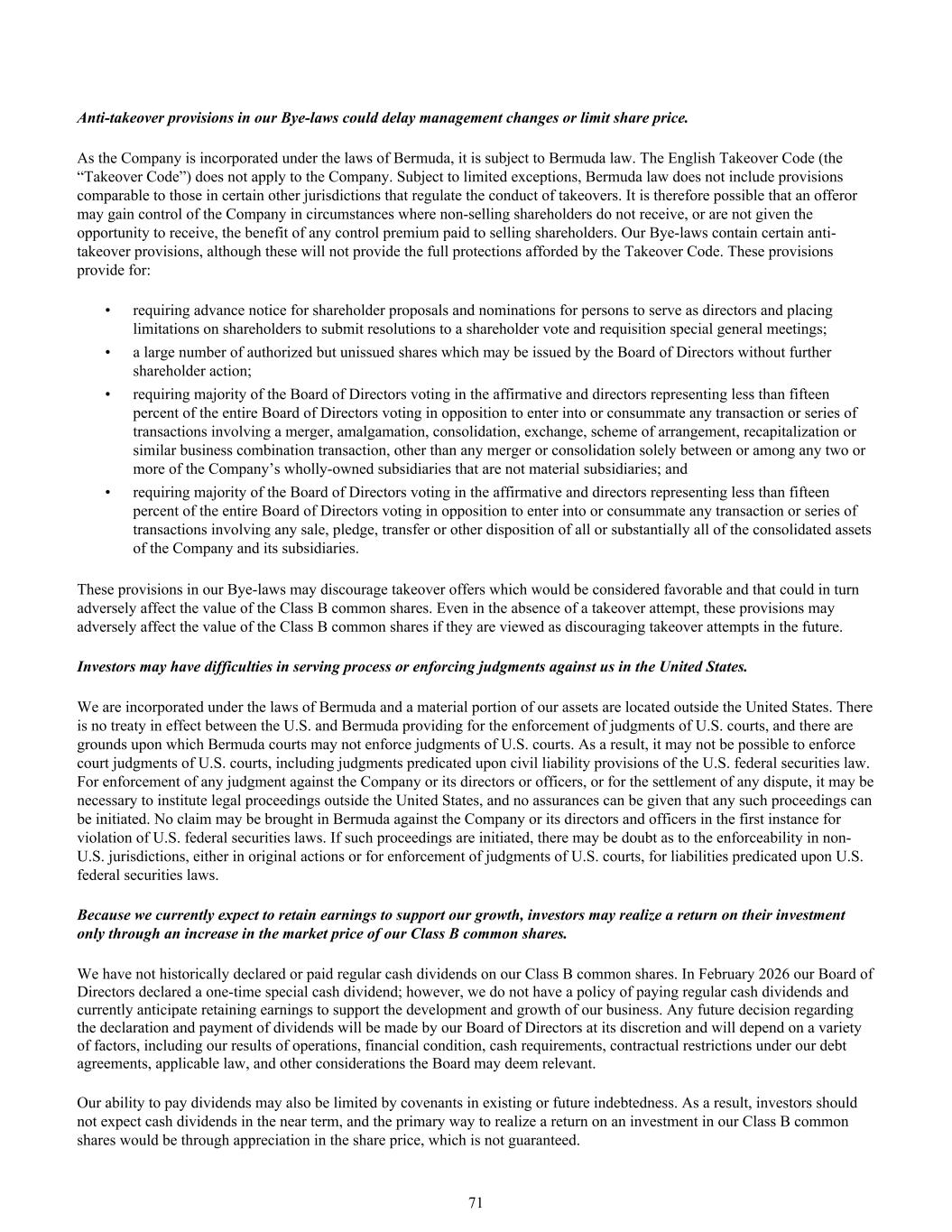 Anti-takeover provisions in our Bye-laws could delay management changes or limit share price. As the Company is incorporated under the laws of Bermuda, it is subject to Bermuda law. The English Takeover Code (the “Takeover Code”) does not apply to the Company. Subject to limited exceptions, Bermuda law does not include provisions comparable to those in certain other jurisdictions that regulate the conduct of takeovers. It is therefore possible that an offeror may gain control of the Company in circumstances where non-selling shareholders do not receive, or are not given the opportunity to receive, the benefit of any control premium paid to selling shareholders. Our Bye-laws contain certain anti- takeover provisions, although these will not provide the full protections afforded by the Takeover Code. These provisions provide for: • requiring advance notice for shareholder proposals and nominations for persons to serve as directors and placing limitations on shareholders to submit resolutions to a shareholder vote and requisition special general meetings; • a large number of authorized but unissued shares which may be issued by the Board of Directors without further shareholder action; • requiring majority of the Board of Directors voting in the affirmative and directors representing less than fifteen percent of the entire Board of Directors voting in opposition to enter into or consummate any transaction or series of transactions involving a merger, amalgamation, consolidation, exchange, scheme of arrangement, recapitalization or similar business combination transaction, other than any merger or consolidation solely between or among any two or more of the Company’s wholly-owned subsidiaries that are not material subsidiaries; and • requiring majority of the Board of Directors voting in the affirmative and directors representing less than fifteen percent of the entire Board of Directors voting in opposition to enter into or consummate any transaction or series of transactions involving any sale, pledge, transfer or other disposition of all or substantially all of the consolidated assets of the Company and its subsidiaries. These provisions in our Bye-laws may discourage takeover offers which would be considered favorable and that could in turn adversely affect the value of the Class B common shares. Even in the absence of a takeover attempt, these provisions may adversely affect the value of the Class B common shares if they are viewed as discouraging takeover attempts in the future. Investors may have difficulties in serving process or enforcing judgments against us in the United States. We are incorporated under the laws of Bermuda and a material portion of our assets are located outside the United States. There is no treaty in effect between the U.S. and Bermuda providing for the enforcement of judgments of U.S. courts, and there are grounds upon which Bermuda courts may not enforce judgments of U.S. courts. As a result, it may not be possible to enforce court judgments of U.S. courts, including judgments predicated upon civil liability provisions of the U.S. federal securities law. For enforcement of any judgment against the Company or its directors or officers, or for the settlement of any dispute, it may be necessary to institute legal proceedings outside the United States, and no assurances can be given that any such proceedings can be initiated. No claim may be brought in Bermuda against the Company or its directors and officers in the first instance for violation of U.S. federal securities laws. If such proceedings are initiated, there may be doubt as to the enforceability in non- U.S. jurisdictions, either in original actions or for enforcement of judgments of U.S. courts, for liabilities predicated upon U.S. federal securities laws. Because we currently expect to retain earnings to support our growth, investors may realize a return on their investment only through an increase in the market price of our Class B common shares. We have not historically declared or paid regular cash dividends on our Class B common shares. In February 2026 our Board of Directors declared a one-time special cash dividend; however, we do not have a policy of paying regular cash dividends and currently anticipate retaining earnings to support the development and growth of our business. Any future decision regarding the declaration and payment of dividends will be made by our Board of Directors at its discretion and will depend on a variety of factors, including our results of operations, financial condition, cash requirements, contractual restrictions under our debt agreements, applicable law, and other considerations the Board may deem relevant. Our ability to pay dividends may also be limited by covenants in existing or future indebtedness. As a result, investors should not expect cash dividends in the near term, and the primary way to realize a return on an investment in our Class B common shares would be through appreciation in the share price, which is not guaranteed. 71