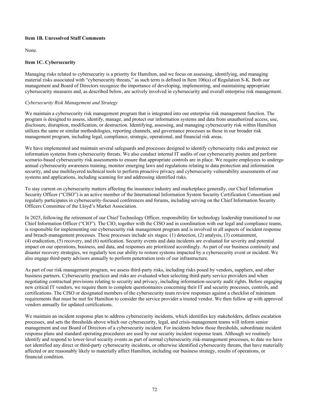 Item 1B. Unresolved Staff Comments None. Item 1C. Cybersecurity Managing risks related to cybersecurity is a priority for Hamilton, and we focus on assessing, identifying, and managing material risks associated with “cybersecurity threats,” as such term is defined in Item 106(a) of Regulation S-K. Both our management and Board of Directors recognize the importance of developing, implementing, and maintaining appropriate cybersecurity measures and, as described below, are actively involved in cybersecurity and overall enterprise risk management. Cybersecurity Risk Management and Strategy We maintain a cybersecurity risk management program that is integrated into our enterprise risk management function. The program is designed to assess, identify, manage, and protect our information systems and data from unauthorized access, use, disclosure, disruption, modification, or destruction. Identifying, assessing, and managing cybersecurity risk within Hamilton utilizes the same or similar methodologies, reporting channels, and governance processes as those in our broader risk management program, including legal, compliance, strategic, operational, and financial risk areas. We have implemented and maintain several safeguards and processes designed to identify cybersecurity risks and protect our information systems from cybersecurity threats. We also conduct internal IT audits of our cybersecurity posture and perform scenario-based cybersecurity risk assessments to ensure that appropriate controls are in place. We require employees to undergo annual cybersecurity awareness training, monitor emerging laws and regulations relating to data protection and information security, and use multilayered technical tools to perform proactive privacy and cybersecurity vulnerability assessments of our systems and applications, including scanning for and addressing identified risks. To stay current on cybersecurity matters affecting the insurance industry and marketplace generally, our Chief Information Security Officer (“CISO”) is an active member of the International Information System Security Certification Consortium and regularly participates in cybersecurity-focused conferences and forums, including serving on the Chief Information Security Officers Committee of the Lloyd’s Market Association. In 2025, following the retirement of our Chief Technology Officer, responsibility for technology leadership transitioned to our Chief Information Officer (“CIO”). The CIO, together with the CISO and in coordination with our legal and compliance teams, is responsible for implementing our cybersecurity risk management program and is involved in all aspects of incident response and breach-management processes. These processes include six stages: (1) detection, (2) analysis, (3) containment, (4) eradication, (5) recovery, and (6) notification. Security events and data incidents are evaluated for severity and potential impact on our operations, business, and data, and responses are prioritized accordingly. As part of our business continuity and disaster recovery strategies, we regularly test our ability to restore systems impacted by a cybersecurity event or incident. We also engage third-party advisors annually to perform penetration tests of our infrastructure. As part of our risk management program, we assess third-party risks, including risks posed by vendors, suppliers, and other business partners. Cybersecurity practices and risks are evaluated when selecting third-party service providers and when negotiating contractual provisions relating to security and privacy, including information-security audit rights. Before engaging new critical IT vendors, we require them to complete questionnaires concerning their IT and security processes, controls, and certifications. The CISO or designated members of the cybersecurity team review responses against a checklist of minimum requirements that must be met for Hamilton to consider the service provider a trusted vendor. We then follow up with approved vendors annually for updated certifications. We maintain an incident response plan to address cybersecurity incidents, which identifies key stakeholders, defines escalation processes, and sets the thresholds above which our cybersecurity, legal, and crisis-management teams will inform senior management and our Board of Directors of a cybersecurity incident. For incidents below those thresholds, subordinate incident response plans and standard operating procedures are used by our security incident response team. Although we routinely identify and respond to lower-level security events as part of normal cybersecurity risk-management processes, to date we have not identified any direct or third-party cybersecurity incidents, or otherwise identified cybersecurity threats, that have materially affected or are reasonably likely to materially affect Hamilton, including our business strategy, results of operations, or financial condition. 72