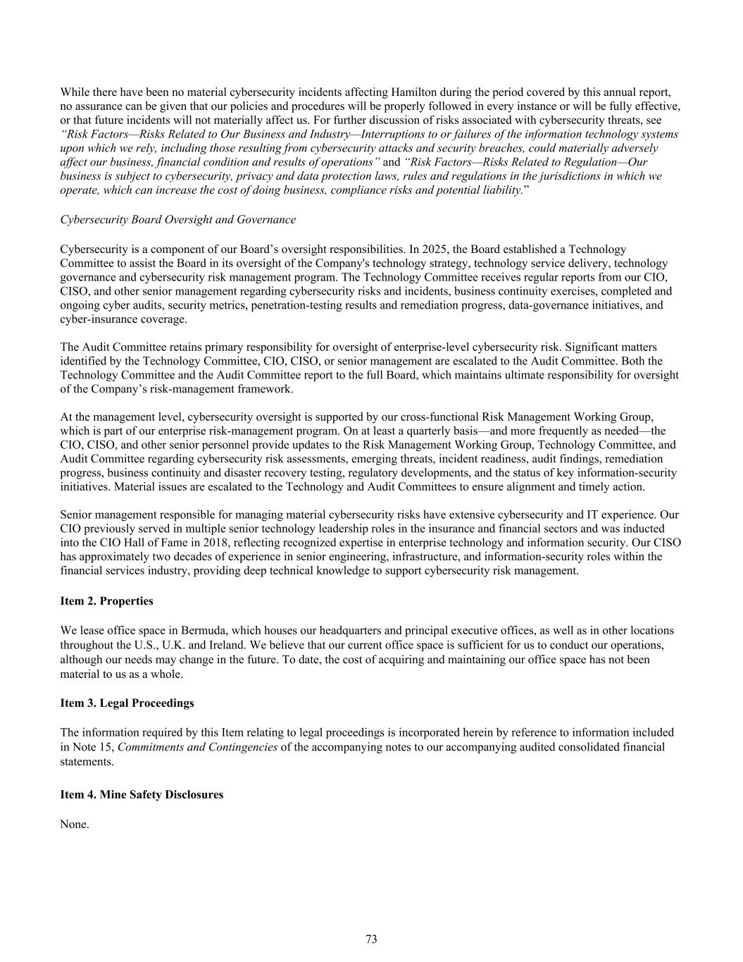 While there have been no material cybersecurity incidents affecting Hamilton during the period covered by this annual report, no assurance can be given that our policies and procedures will be properly followed in every instance or will be fully effective, or that future incidents will not materially affect us. For further discussion of risks associated with cybersecurity threats, see “Risk Factors—Risks Related to Our Business and Industry—Interruptions to or failures of the information technology systems upon which we rely, including those resulting from cybersecurity attacks and security breaches, could materially adversely affect our business, financial condition and results of operations” and “Risk Factors—Risks Related to Regulation—Our business is subject to cybersecurity, privacy and data protection laws, rules and regulations in the jurisdictions in which we operate, which can increase the cost of doing business, compliance risks and potential liability.” Cybersecurity Board Oversight and Governance Cybersecurity is a component of our Board’s oversight responsibilities. In 2025, the Board established a Technology Committee to assist the Board in its oversight of the Company's technology strategy, technology service delivery, technology governance and cybersecurity risk management program. The Technology Committee receives regular reports from our CIO, CISO, and other senior management regarding cybersecurity risks and incidents, business continuity exercises, completed and ongoing cyber audits, security metrics, penetration-testing results and remediation progress, data-governance initiatives, and cyber-insurance coverage. The Audit Committee retains primary responsibility for oversight of enterprise-level cybersecurity risk. Significant matters identified by the Technology Committee, CIO, CISO, or senior management are escalated to the Audit Committee. Both the Technology Committee and the Audit Committee report to the full Board, which maintains ultimate responsibility for oversight of the Company’s risk-management framework. At the management level, cybersecurity oversight is supported by our cross-functional Risk Management Working Group, which is part of our enterprise risk-management program. On at least a quarterly basis—and more frequently as needed—the CIO, CISO, and other senior personnel provide updates to the Risk Management Working Group, Technology Committee, and Audit Committee regarding cybersecurity risk assessments, emerging threats, incident readiness, audit findings, remediation progress, business continuity and disaster recovery testing, regulatory developments, and the status of key information-security initiatives. Material issues are escalated to the Technology and Audit Committees to ensure alignment and timely action. Senior management responsible for managing material cybersecurity risks have extensive cybersecurity and IT experience. Our CIO previously served in multiple senior technology leadership roles in the insurance and financial sectors and was inducted into the CIO Hall of Fame in 2018, reflecting recognized expertise in enterprise technology and information security. Our CISO has approximately two decades of experience in senior engineering, infrastructure, and information-security roles within the financial services industry, providing deep technical knowledge to support cybersecurity risk management. Item 2. Properties We lease office space in Bermuda, which houses our headquarters and principal executive offices, as well as in other locations throughout the U.S., U.K. and Ireland. We believe that our current office space is sufficient for us to conduct our operations, although our needs may change in the future. To date, the cost of acquiring and maintaining our office space has not been material to us as a whole. Item 3. Legal Proceedings The information required by this Item relating to legal proceedings is incorporated herein by reference to information included in Note 15, Commitments and Contingencies of the accompanying notes to our accompanying audited consolidated financial statements. Item 4. Mine Safety Disclosures None. 73