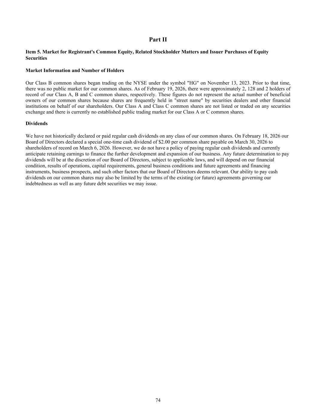 Part II Item 5. Market for Registrant's Common Equity, Related Stockholder Matters and Issuer Purchases of Equity Securities Market Information and Number of Holders Our Class B common shares began trading on the NYSE under the symbol "HG" on November 13, 2023. Prior to that time, there was no public market for our common shares. As of February 19, 2026, there were approximately 2, 128 and 2 holders of record of our Class A, B and C common shares, respectively. These figures do not represent the actual number of beneficial owners of our common shares because shares are frequently held in "street name" by securities dealers and other financial institutions on behalf of our shareholders. Our Class A and Class C common shares are not listed or traded on any securities exchange and there is currently no established public trading market for our Class A or C common shares. Dividends We have not historically declared or paid regular cash dividends on any class of our common shares. On February 18, 2026 our Board of Directors declared a special one-time cash dividend of $2.00 per common share payable on March 30, 2026 to shareholders of record on March 6, 2026. However, we do not have a policy of paying regular cash dividends and currently anticipate retaining earnings to finance the further development and expansion of our business. Any future determination to pay dividends will be at the discretion of our Board of Directors, subject to applicable laws, and will depend on our financial condition, results of operations, capital requirements, general business conditions and future agreements and financing instruments, business prospects, and such other factors that our Board of Directors deems relevant. Our ability to pay cash dividends on our common shares may also be limited by the terms of the existing (or future) agreements governing our indebtedness as well as any future debt securities we may issue. 74