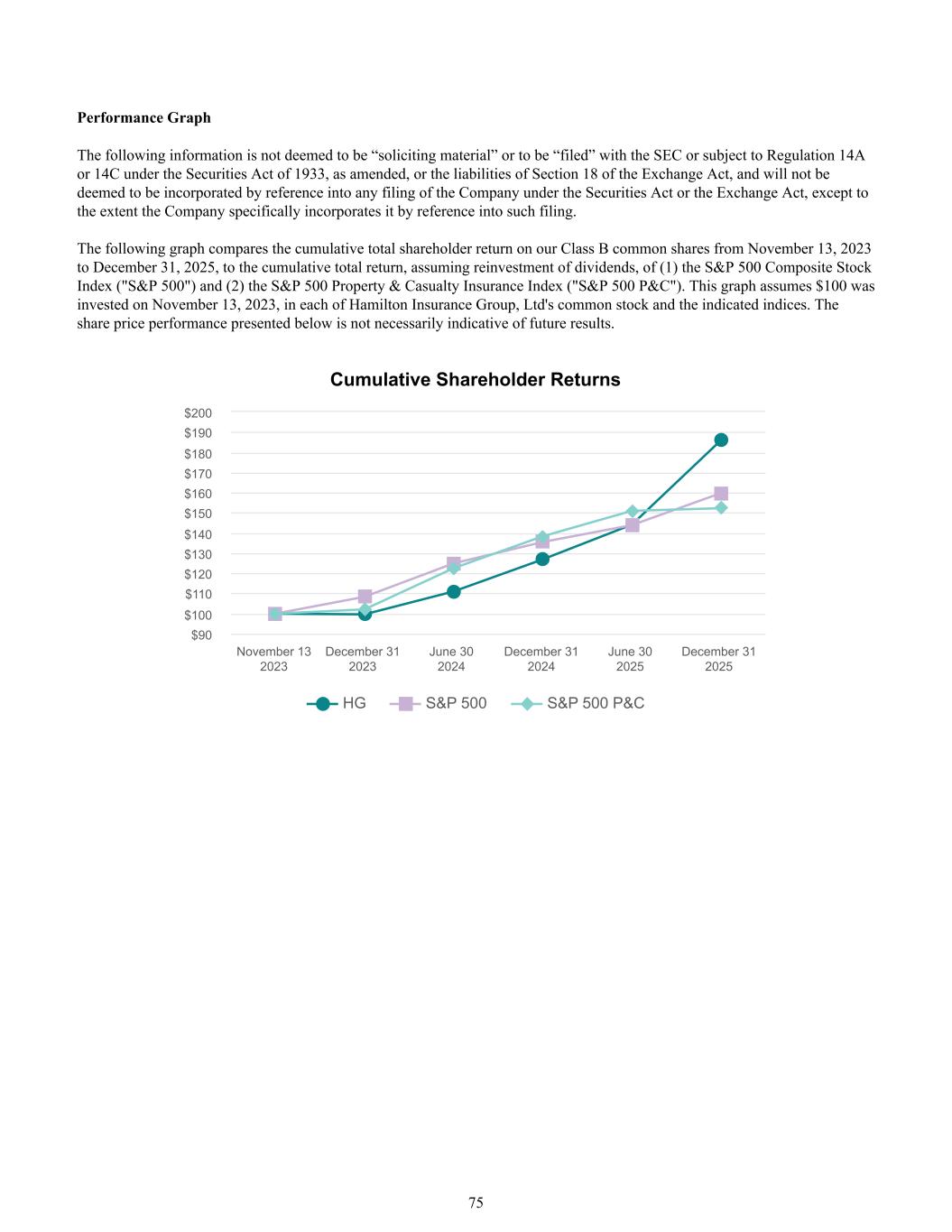 Performance Graph The following information is not deemed to be “soliciting material” or to be “filed” with the SEC or subject to Regulation 14A or 14C under the Securities Act of 1933, as amended, or the liabilities of Section 18 of the Exchange Act, and will not be deemed to be incorporated by reference into any filing of the Company under the Securities Act or the Exchange Act, except to the extent the Company specifically incorporates it by reference into such filing. The following graph compares the cumulative total shareholder return on our Class B common shares from November 13, 2023 to December 31, 2025, to the cumulative total return, assuming reinvestment of dividends, of (1) the S&P 500 Composite Stock Index ("S&P 500") and (2) the S&P 500 Property & Casualty Insurance Index ("S&P 500 P&C"). This graph assumes $100 was invested on November 13, 2023, in each of Hamilton Insurance Group, Ltd's common stock and the indicated indices. The share price performance presented below is not necessarily indicative of future results. Cumulative Shareholder Returns HG S&P 500 S&P 500 P&C November 13 2023 December 31 2023 June 30 2024 December 31 2024 June 30 2025 December 31 2025 $90 $100 $110 $120 $130 $140 $150 $160 $170 $180 $190 $200 75