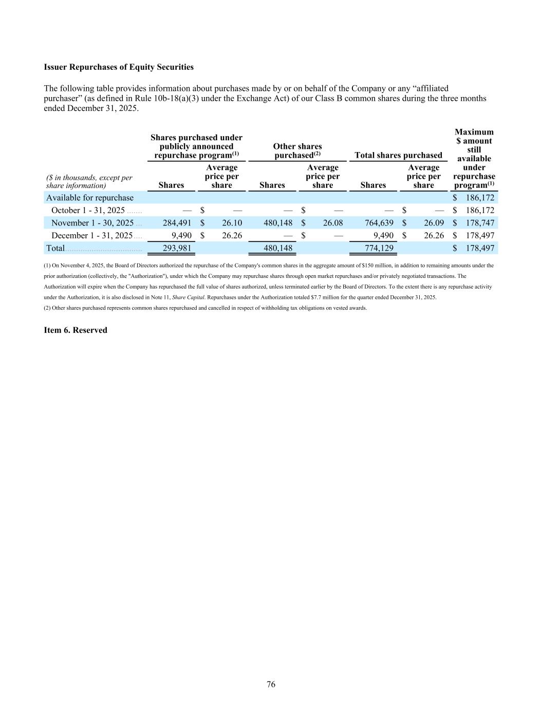Issuer Repurchases of Equity Securities The following table provides information about purchases made by or on behalf of the Company or any “affiliated purchaser” (as defined in Rule 10b-18(a)(3) under the Exchange Act) of our Class B common shares during the three months ended December 31, 2025. Shares purchased under publicly announced repurchase program(1) Other shares purchased(2) Total shares purchased Maximum $ amount still available under repurchase program(1) ($ in thousands, except per share information) Shares Average price per share Shares Average price per share Shares Average price per share Available for repurchase $ 186,172 October 1 - 31, 2025 ....... — $ — — $ — — $ — $ 186,172 November 1 - 30, 2025 ... 284,491 $ 26.10 480,148 $ 26.08 764,639 $ 26.09 $ 178,747 December 1 - 31, 2025 .... 9,490 $ 26.26 — $ — 9,490 $ 26.26 $ 178,497 Total ................................... 293,981 480,148 774,129 $ 178,497 (1) On November 4, 2025, the Board of Directors authorized the repurchase of the Company's common shares in the aggregate amount of $150 million, in addition to remaining amounts under the prior authorization (collectively, the "Authorization"), under which the Company may repurchase shares through open market repurchases and/or privately negotiated transactions. The Authorization will expire when the Company has repurchased the full value of shares authorized, unless terminated earlier by the Board of Directors. To the extent there is any repurchase activity under the Authorization, it is also disclosed in Note 11, Share Capital. Repurchases under the Authorization totaled $7.7 million for the quarter ended December 31, 2025. (2) Other shares purchased represents common shares repurchased and cancelled in respect of withholding tax obligations on vested awards. Item 6. Reserved 76