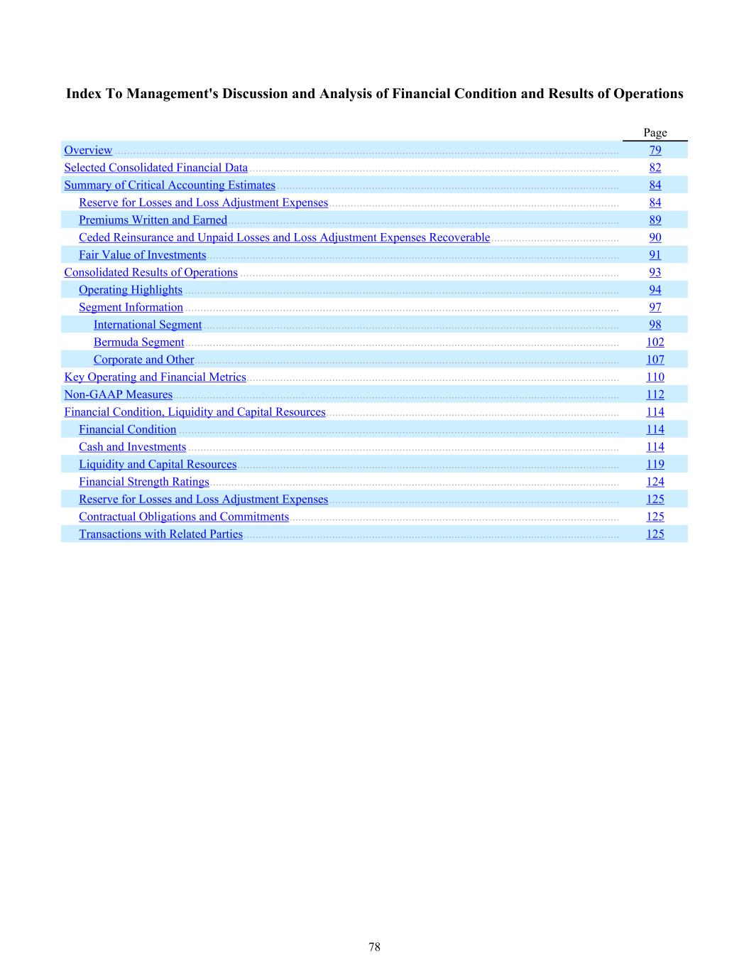 Index To Management's Discussion and Analysis of Financial Condition and Results of Operations Page Overview ..................................................................................................................................................................... 79 Selected Consolidated Financial Data ......................................................................................................................... 82 Summary of Critical Accounting Estimates ................................................................................................................ 84 Reserve for Losses and Loss Adjustment Expenses ............................................................................................... 84 Premiums Written and Earned ................................................................................................................................ 89 Ceded Reinsurance and Unpaid Losses and Loss Adjustment Expenses Recoverable .......................................... 90 Fair Value of Investments ....................................................................................................................................... 91 Consolidated Results of Operations ............................................................................................................................ 93 Operating Highlights .............................................................................................................................................. 94 Segment Information .............................................................................................................................................. 97 International Segment ........................................................................................................................................ 98 Bermuda Segment .............................................................................................................................................. 102 Corporate and Other ........................................................................................................................................... 107 Key Operating and Financial Metrics .......................................................................................................................... 110 Non-GAAP Measures .................................................................................................................................................. 112 Financial Condition, Liquidity and Capital Resources ................................................................................................ 114 Financial Condition ................................................................................................................................................ 114 Cash and Investments ............................................................................................................................................. 114 Liquidity and Capital Resources ............................................................................................................................. 119 Financial Strength Ratings ...................................................................................................................................... 124 Reserve for Losses and Loss Adjustment Expenses ............................................................................................... 125 Contractual Obligations and Commitments............................................................................................................ 125 Transactions with Related Parties ........................................................................................................................... 125 78