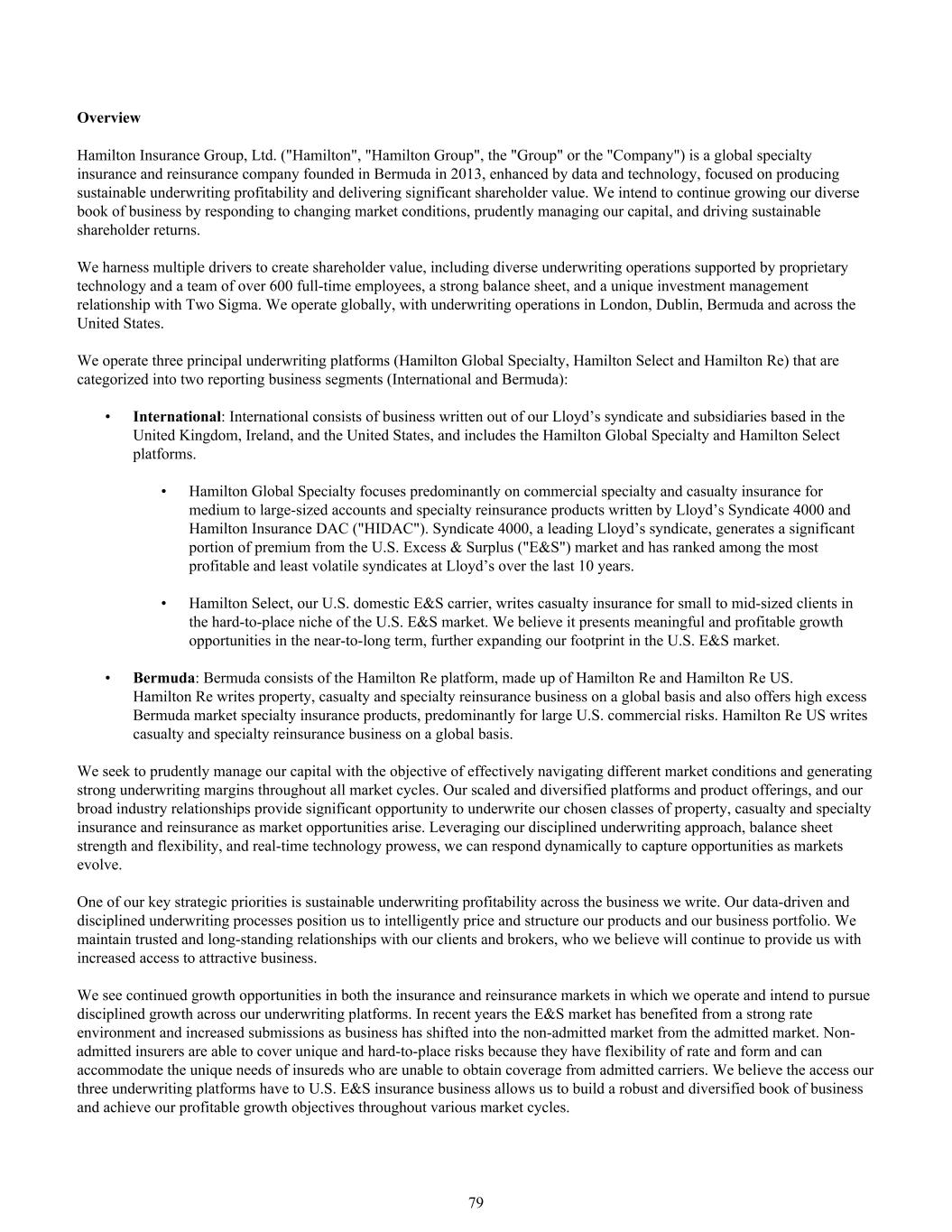 Overview Hamilton Insurance Group, Ltd. ("Hamilton", "Hamilton Group", the "Group" or the "Company") is a global specialty insurance and reinsurance company founded in Bermuda in 2013, enhanced by data and technology, focused on producing sustainable underwriting profitability and delivering significant shareholder value. We intend to continue growing our diverse book of business by responding to changing market conditions, prudently managing our capital, and driving sustainable shareholder returns. We harness multiple drivers to create shareholder value, including diverse underwriting operations supported by proprietary technology and a team of over 600 full-time employees, a strong balance sheet, and a unique investment management relationship with Two Sigma. We operate globally, with underwriting operations in London, Dublin, Bermuda and across the United States. We operate three principal underwriting platforms (Hamilton Global Specialty, Hamilton Select and Hamilton Re) that are categorized into two reporting business segments (International and Bermuda): • International: International consists of business written out of our Lloyd’s syndicate and subsidiaries based in the United Kingdom, Ireland, and the United States, and includes the Hamilton Global Specialty and Hamilton Select platforms. • Hamilton Global Specialty focuses predominantly on commercial specialty and casualty insurance for medium to large-sized accounts and specialty reinsurance products written by Lloyd’s Syndicate 4000 and Hamilton Insurance DAC ("HIDAC"). Syndicate 4000, a leading Lloyd’s syndicate, generates a significant portion of premium from the U.S. Excess & Surplus ("E&S") market and has ranked among the most profitable and least volatile syndicates at Lloyd’s over the last 10 years. • Hamilton Select, our U.S. domestic E&S carrier, writes casualty insurance for small to mid-sized clients in the hard-to-place niche of the U.S. E&S market. We believe it presents meaningful and profitable growth opportunities in the near-to-long term, further expanding our footprint in the U.S. E&S market. • Bermuda: Bermuda consists of the Hamilton Re platform, made up of Hamilton Re and Hamilton Re US. Hamilton Re writes property, casualty and specialty reinsurance business on a global basis and also offers high excess Bermuda market specialty insurance products, predominantly for large U.S. commercial risks. Hamilton Re US writes casualty and specialty reinsurance business on a global basis. We seek to prudently manage our capital with the objective of effectively navigating different market conditions and generating strong underwriting margins throughout all market cycles. Our scaled and diversified platforms and product offerings, and our broad industry relationships provide significant opportunity to underwrite our chosen classes of property, casualty and specialty insurance and reinsurance as market opportunities arise. Leveraging our disciplined underwriting approach, balance sheet strength and flexibility, and real-time technology prowess, we can respond dynamically to capture opportunities as markets evolve. One of our key strategic priorities is sustainable underwriting profitability across the business we write. Our data-driven and disciplined underwriting processes position us to intelligently price and structure our products and our business portfolio. We maintain trusted and long-standing relationships with our clients and brokers, who we believe will continue to provide us with increased access to attractive business. We see continued growth opportunities in both the insurance and reinsurance markets in which we operate and intend to pursue disciplined growth across our underwriting platforms. In recent years the E&S market has benefited from a strong rate environment and increased submissions as business has shifted into the non-admitted market from the admitted market. Non- admitted insurers are able to cover unique and hard-to-place risks because they have flexibility of rate and form and can accommodate the unique needs of insureds who are unable to obtain coverage from admitted carriers. We believe the access our three underwriting platforms have to U.S. E&S insurance business allows us to build a robust and diversified book of business and achieve our profitable growth objectives throughout various market cycles. 79