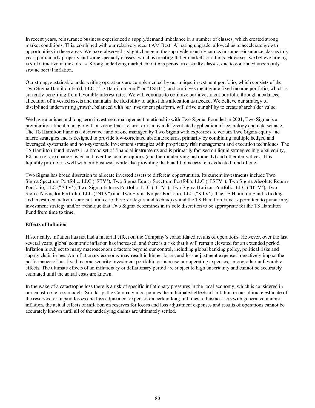 In recent years, reinsurance business experienced a supply/demand imbalance in a number of classes, which created strong market conditions. This, combined with our relatively recent AM Best "A" rating upgrade, allowed us to accelerate growth opportunities in these areas. We have observed a slight change in the supply/demand dynamics in some reinsurance classes this year, particularly property and some specialty classes, which is creating flatter market conditions. However, we believe pricing is still attractive in most areas. Strong underlying market conditions persist in casualty classes, due to continued uncertainty around social inflation. Our strong, sustainable underwriting operations are complemented by our unique investment portfolio, which consists of the Two Sigma Hamilton Fund, LLC ("TS Hamilton Fund" or "TSHF"), and our investment grade fixed income portfolio, which is currently benefiting from favorable interest rates. We will continue to optimize our investment portfolio through a balanced allocation of invested assets and maintain the flexibility to adjust this allocation as needed. We believe our strategy of disciplined underwriting growth, balanced with our investment platform, will drive our ability to create shareholder value. We have a unique and long-term investment management relationship with Two Sigma. Founded in 2001, Two Sigma is a premier investment manager with a strong track record, driven by a differentiated application of technology and data science. The TS Hamilton Fund is a dedicated fund of one managed by Two Sigma with exposures to certain Two Sigma equity and macro strategies and is designed to provide low-correlated absolute returns, primarily by combining multiple hedged and leveraged systematic and non-systematic investment strategies with proprietary risk management and execution techniques. The TS Hamilton Fund invests in a broad set of financial instruments and is primarily focused on liquid strategies in global equity, FX markets, exchange-listed and over the counter options (and their underlying instruments) and other derivatives. This liquidity profile fits well with our business, while also providing the benefit of access to a dedicated fund of one. Two Sigma has broad discretion to allocate invested assets to different opportunities. Its current investments include Two Sigma Spectrum Portfolio, LLC ("STV"), Two Sigma Equity Spectrum Portfolio, LLC ("ESTV"), Two Sigma Absolute Return Portfolio, LLC ("ATV"), Two Sigma Futures Portfolio, LLC ("FTV"), Two Sigma Horizon Portfolio, LLC ("HTV"), Two Sigma Navigator Portfolio, LLC ("NTV") and Two Sigma Kuiper Portfolio, LLC ("KTV"). The TS Hamilton Fund’s trading and investment activities are not limited to these strategies and techniques and the TS Hamilton Fund is permitted to pursue any investment strategy and/or technique that Two Sigma determines in its sole discretion to be appropriate for the TS Hamilton Fund from time to time. Effects of Inflation Historically, inflation has not had a material effect on the Company’s consolidated results of operations. However, over the last several years, global economic inflation has increased, and there is a risk that it will remain elevated for an extended period. Inflation is subject to many macroeconomic factors beyond our control, including global banking policy, political risks and supply chain issues. An inflationary economy may result in higher losses and loss adjustment expenses, negatively impact the performance of our fixed income security investment portfolio, or increase our operating expenses, among other unfavorable effects. The ultimate effects of an inflationary or deflationary period are subject to high uncertainty and cannot be accurately estimated until the actual costs are known. In the wake of a catastrophe loss there is a risk of specific inflationary pressures in the local economy, which is considered in our catastrophe loss models. Similarly, the Company incorporates the anticipated effects of inflation in our ultimate estimate of the reserves for unpaid losses and loss adjustment expenses on certain long-tail lines of business. As with general economic inflation, the actual effects of inflation on reserves for losses and loss adjustment expenses and results of operations cannot be accurately known until all of the underlying claims are ultimately settled. 80