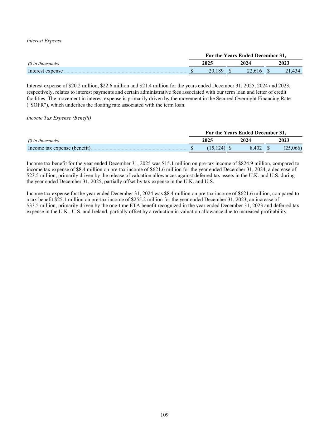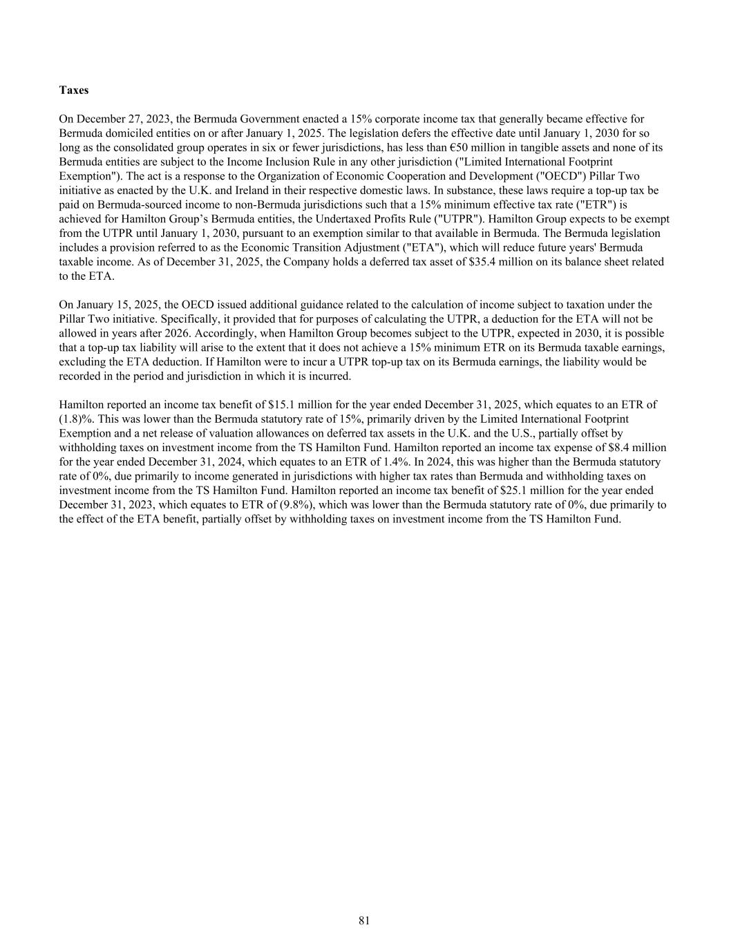 Taxes On December 27, 2023, the Bermuda Government enacted a 15% corporate income tax that generally became effective for Bermuda domiciled entities on or after January 1, 2025. The legislation defers the effective date until January 1, 2030 for so long as the consolidated group operates in six or fewer jurisdictions, has less than €50 million in tangible assets and none of its Bermuda entities are subject to the Income Inclusion Rule in any other jurisdiction ("Limited International Footprint Exemption"). The act is a response to the Organization of Economic Cooperation and Development ("OECD") Pillar Two initiative as enacted by the U.K. and Ireland in their respective domestic laws. In substance, these laws require a top-up tax be paid on Bermuda-sourced income to non-Bermuda jurisdictions such that a 15% minimum effective tax rate ("ETR") is achieved for Hamilton Group’s Bermuda entities, the Undertaxed Profits Rule ("UTPR"). Hamilton Group expects to be exempt from the UTPR until January 1, 2030, pursuant to an exemption similar to that available in Bermuda. The Bermuda legislation includes a provision referred to as the Economic Transition Adjustment ("ETA"), which will reduce future years' Bermuda taxable income. As of December 31, 2025, the Company holds a deferred tax asset of $35.4 million on its balance sheet related to the ETA. On January 15, 2025, the OECD issued additional guidance related to the calculation of income subject to taxation under the Pillar Two initiative. Specifically, it provided that for purposes of calculating the UTPR, a deduction for the ETA will not be allowed in years after 2026. Accordingly, when Hamilton Group becomes subject to the UTPR, expected in 2030, it is possible that a top-up tax liability will arise to the extent that it does not achieve a 15% minimum ETR on its Bermuda taxable earnings, excluding the ETA deduction. If Hamilton were to incur a UTPR top-up tax on its Bermuda earnings, the liability would be recorded in the period and jurisdiction in which it is incurred. Hamilton reported an income tax benefit of $15.1 million for the year ended December 31, 2025, which equates to an ETR of (1.8)%. This was lower than the Bermuda statutory rate of 15%, primarily driven by the Limited International Footprint Exemption and a net release of valuation allowances on deferred tax assets in the U.K. and the U.S., partially offset by withholding taxes on investment income from the TS Hamilton Fund. Hamilton reported an income tax expense of $8.4 million for the year ended December 31, 2024, which equates to an ETR of 1.4%. In 2024, this was higher than the Bermuda statutory rate of 0%, due primarily to income generated in jurisdictions with higher tax rates than Bermuda and withholding taxes on investment income from the TS Hamilton Fund. Hamilton reported an income tax benefit of $25.1 million for the year ended December 31, 2023, which equates to ETR of (9.8%), which was lower than the Bermuda statutory rate of 0%, due primarily to the effect of the ETA benefit, partially offset by withholding taxes on investment income from the TS Hamilton Fund. 81