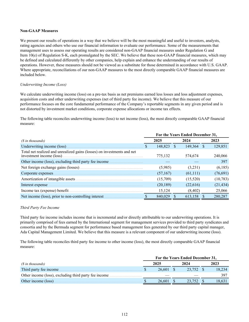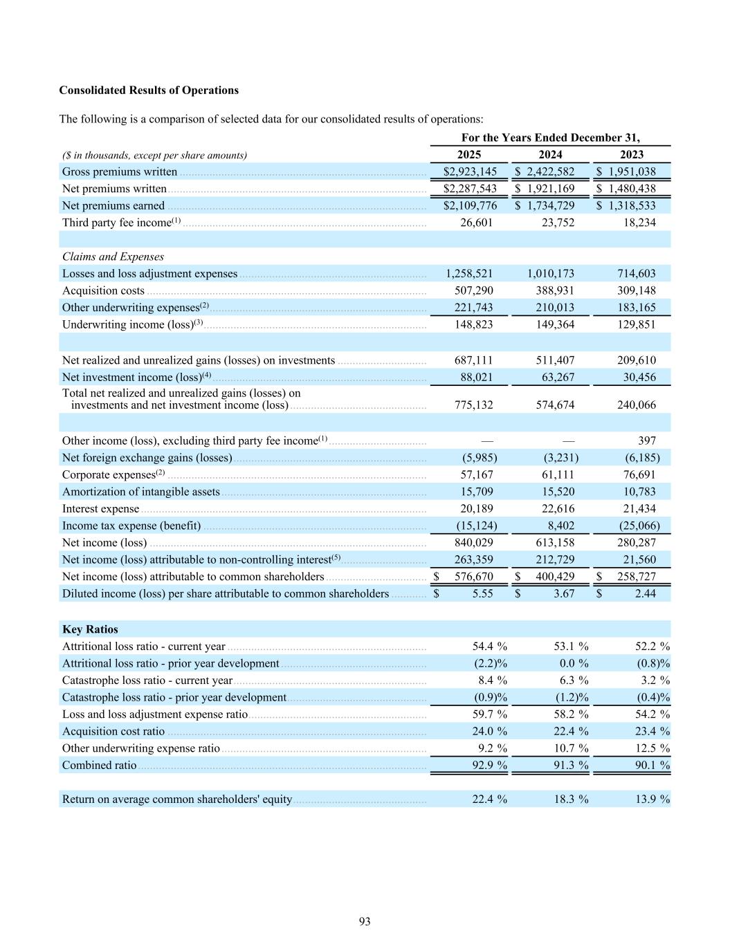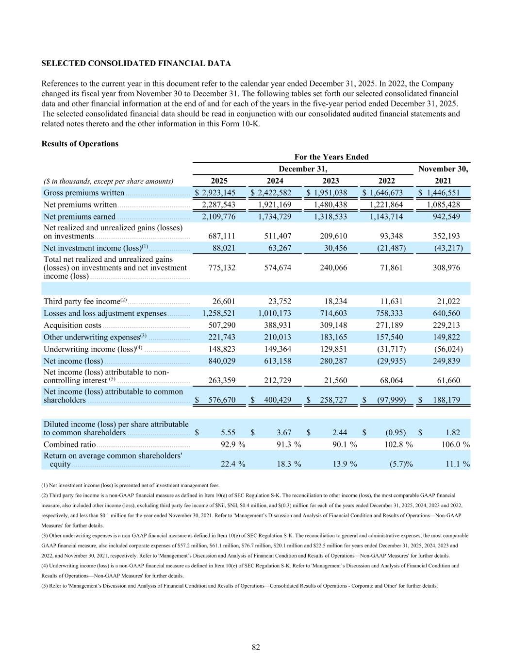 SELECTED CONSOLIDATED FINANCIAL DATA References to the current year in this document refer to the calendar year ended December 31, 2025. In 2022, the Company changed its fiscal year from November 30 to December 31. The following tables set forth our selected consolidated financial data and other financial information at the end of and for each of the years in the five-year period ended December 31, 2025. The selected consolidated financial data should be read in conjunction with our consolidated audited financial statements and related notes thereto and the other information in this Form 10-K. Results of Operations ($ in thousands, except per share amounts) For the Years Ended December 31, November 30, 2025 2024 2023 2022 2021 Gross premiums written ............................... $ 2,923,145 $ 2,422,582 $ 1,951,038 $ 1,646,673 $ 1,446,551 Net premiums written ................................... 2,287,543 1,921,169 1,480,438 1,221,864 1,085,428 Net premiums earned ................................... 2,109,776 1,734,729 1,318,533 1,143,714 942,549 Net realized and unrealized gains (losses) on investments .............................................. 687,111 511,407 209,610 93,348 352,193 Net investment income (loss)(1) .................... 88,021 63,267 30,456 (21,487) (43,217) Total net realized and unrealized gains (losses) on investments and net investment income (loss) ................................................ 775,132 574,674 240,066 71,861 308,976 Third party fee income(2) .............................. 26,601 23,752 18,234 11,631 21,022 Losses and loss adjustment expenses ........... 1,258,521 1,010,173 714,603 758,333 640,560 Acquisition costs .......................................... 507,290 388,931 309,148 271,189 229,213 Other underwriting expenses(3) .................... 221,743 210,013 183,165 157,540 149,822 Underwriting income (loss)(4) ...................... 148,823 149,364 129,851 (31,717) (56,024) Net income (loss) ......................................... 840,029 613,158 280,287 (29,935) 249,839 Net income (loss) attributable to non- controlling interest (5) ................................... 263,359 212,729 21,560 68,064 61,660 Net income (loss) attributable to common shareholders ................................................. $ 576,670 $ 400,429 $ 258,727 $ (97,999) $ 188,179 Diluted income (loss) per share attributable to common shareholders .............................. $ 5.55 $ 3.67 $ 2.44 $ (0.95) $ 1.82 Combined ratio ............................................. 92.9 % 91.3 % 90.1 % 102.8 % 106.0 % Return on average common shareholders' equity ......................................................... 22.4 % 18.3 % 13.9 % (5.7) % 11.1 % (1) Net investment income (loss) is presented net of investment management fees. (2) Third party fee income is a non-GAAP financial measure as defined in Item 10(e) of SEC Regulation S-K. The reconciliation to other income (loss), the most comparable GAAP financial measure, also included other income (loss), excluding third party fee income of $Nil, $Nil, $0.4 million, and $(0.3) million for each of the years ended December 31, 2025, 2024, 2023 and 2022, respectively, and less than $0.1 million for the year ended November 30, 2021. Refer to 'Management’s Discussion and Analysis of Financial Condition and Results of Operations—Non-GAAP Measures' for further details. (3) Other underwriting expenses is a non-GAAP financial measure as defined in Item 10(e) of SEC Regulation S-K. The reconciliation to general and administrative expenses, the most comparable GAAP financial measure, also included corporate expenses of $57.2 million, $61.1 million, $76.7 million, $20.1 million and $22.5 million for years ended December 31, 2025, 2024, 2023 and 2022, and November 30, 2021, respectively. Refer to 'Management’s Discussion and Analysis of Financial Condition and Results of Operations—Non-GAAP Measures' for further details. (4) Underwriting income (loss) is a non-GAAP financial measure as defined in Item 10(e) of SEC Regulation S-K. Refer to 'Management’s Discussion and Analysis of Financial Condition and Results of Operations—Non-GAAP Measures' for further details. (5) Refer to 'Management’s Discussion and Analysis of Financial Condition and Results of Operations—Consolidated Results of Operations - Corporate and Other' for further details. 82
