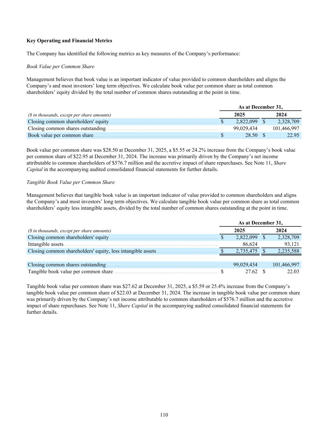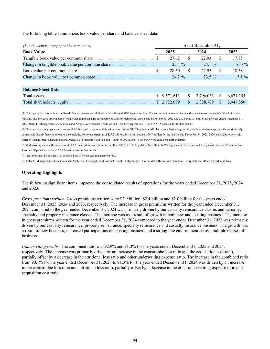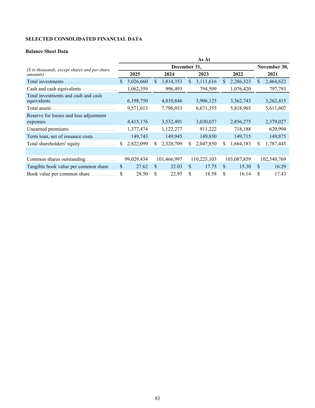 SELECTED CONSOLIDATED FINANCIAL DATA Balance Sheet Data ($ in thousands, except shares and per share amounts) As At December 31, November 30, 2025 2024 2023 2022 2021 Total investments ......................................... $ 5,026,660 $ 3,814,353 $ 3,111,616 $ 2,286,323 $ 2,464,622 Cash and cash equivalents ............................ 1,062,359 996,493 794,509 1,076,420 797,793 Total investments and cash and cash equivalents.................................................... 6,198,750 4,810,846 3,906,125 3,362,743 3,262,415 Total assets ................................................... 9,571,613 7,796,033 6,671,355 5,818,965 5,611,607 Reserve for losses and loss adjustment expenses ....................................................... 4,415,176 3,532,491 3,030,037 2,856,275 2,379,027 Unearned premiums ..................................... 1,377,474 1,122,277 911,222 718,188 620,994 Term loan, net of issuance costs .................. 149,743 149,945 149,830 149,715 149,875 Total shareholders' equity ............................ $ 2,822,099 $ 2,328,709 $ 2,047,850 $ 1,664,183 $ 1,787,445 Common shares outstanding ........................ 99,029,434 101,466,997 110,225,103 103,087,859 102,540,769 Tangible book value per common share ...... $ 27.62 $ 22.03 $ 17.75 $ 15.30 $ 16.29 Book value per common share ..................... $ 28.50 $ 22.95 $ 18.58 $ 16.14 $ 17.43 83