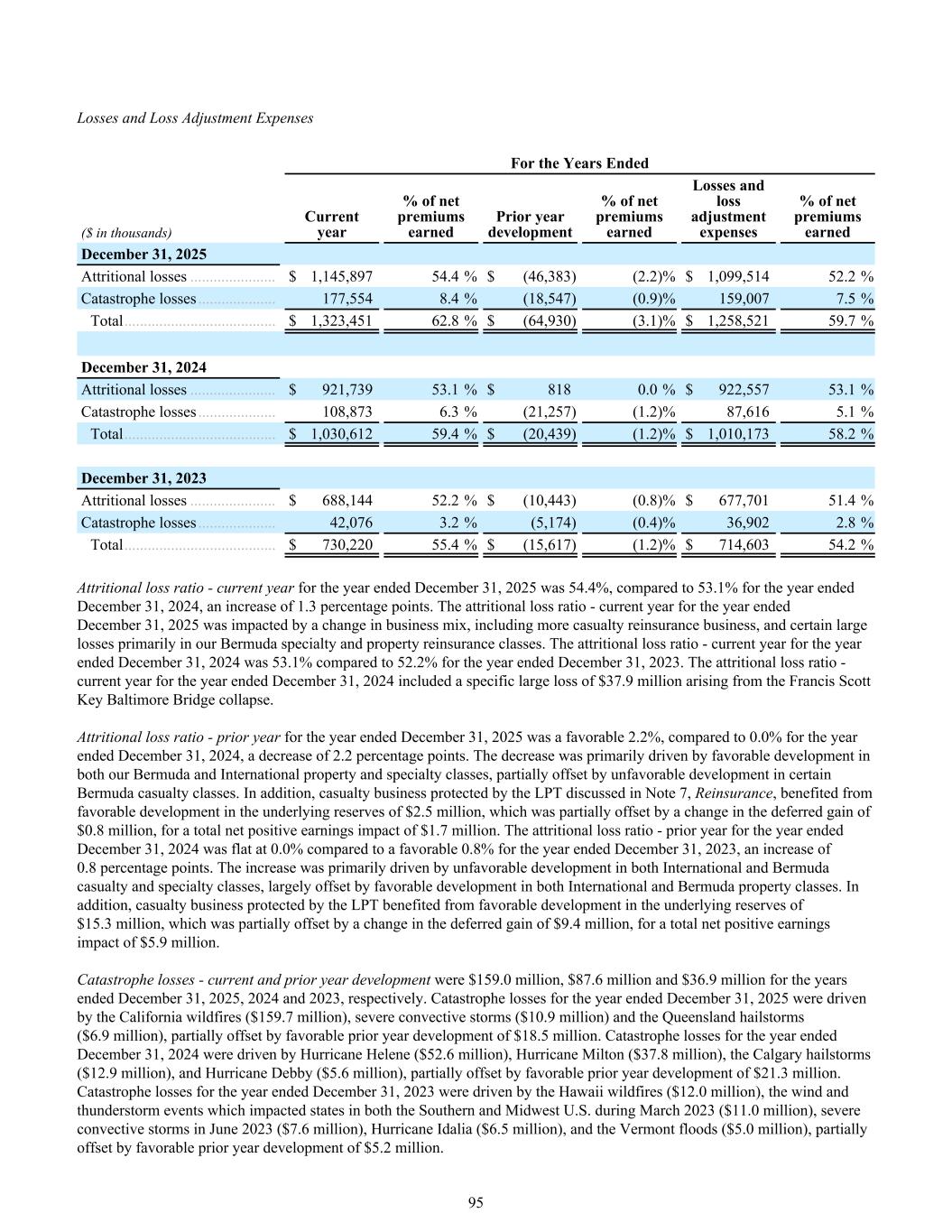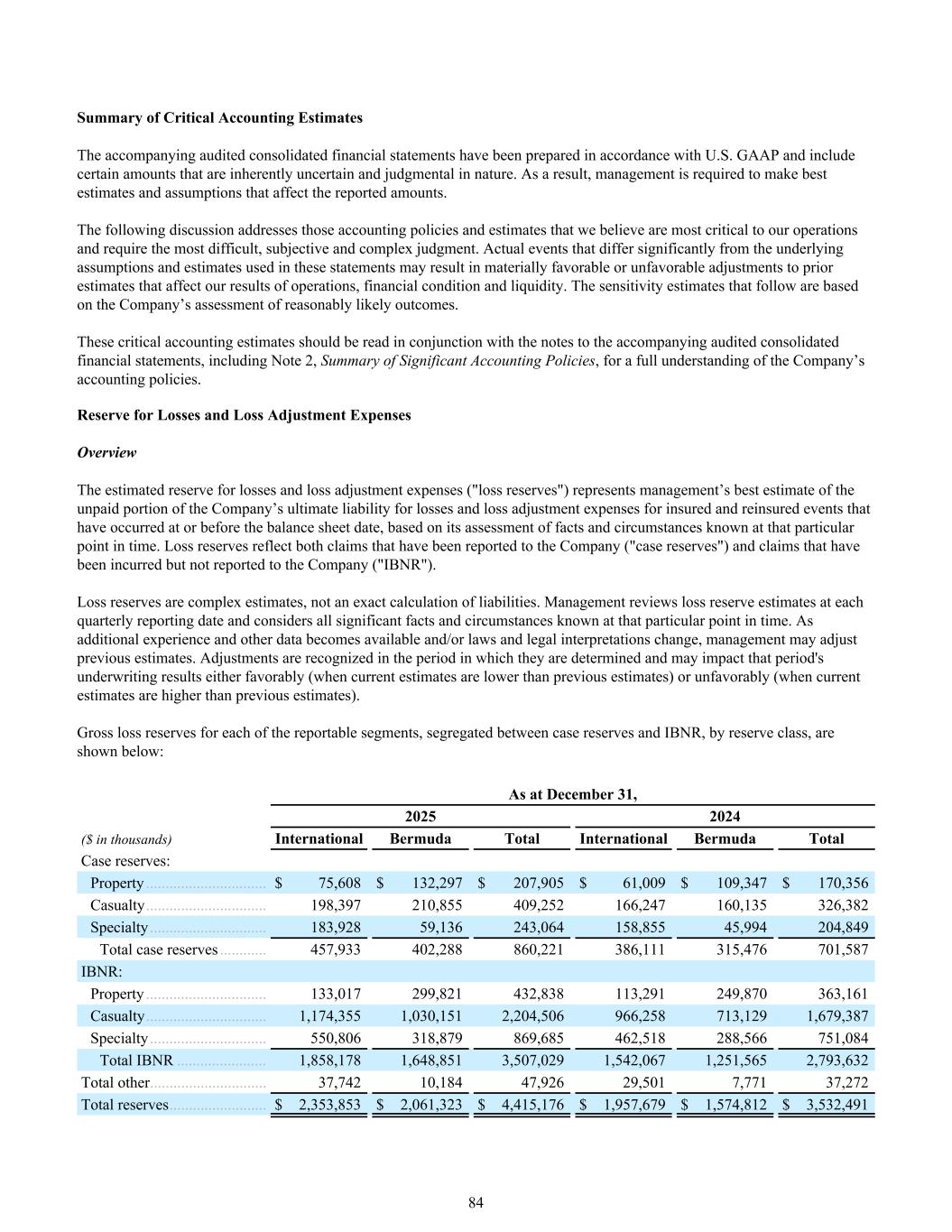 Summary of Critical Accounting Estimates The accompanying audited consolidated financial statements have been prepared in accordance with U.S. GAAP and include certain amounts that are inherently uncertain and judgmental in nature. As a result, management is required to make best estimates and assumptions that affect the reported amounts. The following discussion addresses those accounting policies and estimates that we believe are most critical to our operations and require the most difficult, subjective and complex judgment. Actual events that differ significantly from the underlying assumptions and estimates used in these statements may result in materially favorable or unfavorable adjustments to prior estimates that affect our results of operations, financial condition and liquidity. The sensitivity estimates that follow are based on the Company’s assessment of reasonably likely outcomes. These critical accounting estimates should be read in conjunction with the notes to the accompanying audited consolidated financial statements, including Note 2, Summary of Significant Accounting Policies, for a full understanding of the Company’s accounting policies. Reserve for Losses and Loss Adjustment Expenses Overview The estimated reserve for losses and loss adjustment expenses ("loss reserves") represents management’s best estimate of the unpaid portion of the Company’s ultimate liability for losses and loss adjustment expenses for insured and reinsured events that have occurred at or before the balance sheet date, based on its assessment of facts and circumstances known at that particular point in time. Loss reserves reflect both claims that have been reported to the Company ("case reserves") and claims that have been incurred but not reported to the Company ("IBNR"). Loss reserves are complex estimates, not an exact calculation of liabilities. Management reviews loss reserve estimates at each quarterly reporting date and considers all significant facts and circumstances known at that particular point in time. As additional experience and other data becomes available and/or laws and legal interpretations change, management may adjust previous estimates. Adjustments are recognized in the period in which they are determined and may impact that period's underwriting results either favorably (when current estimates are lower than previous estimates) or unfavorably (when current estimates are higher than previous estimates). Gross loss reserves for each of the reportable segments, segregated between case reserves and IBNR, by reserve class, are shown below: As at December 31, 2025 2024 ($ in thousands) International Bermuda Total International Bermuda Total Case reserves: Property ............................... $ 75,608 $ 132,297 $ 207,905 $ 61,009 $ 109,347 $ 170,356 Casualty ............................... 198,397 210,855 409,252 166,247 160,135 326,382 Specialty .............................. 183,928 59,136 243,064 158,855 45,994 204,849 Total case reserves ............ 457,933 402,288 860,221 386,111 315,476 701,587 IBNR: Property ............................... 133,017 299,821 432,838 113,291 249,870 363,161 Casualty ............................... 1,174,355 1,030,151 2,204,506 966,258 713,129 1,679,387 Specialty .............................. 550,806 318,879 869,685 462,518 288,566 751,084 Total IBNR ....................... 1,858,178 1,648,851 3,507,029 1,542,067 1,251,565 2,793,632 Total other .............................. 37,742 10,184 47,926 29,501 7,771 37,272 Total reserves ......................... $ 2,353,853 $ 2,061,323 $ 4,415,176 $ 1,957,679 $ 1,574,812 $ 3,532,491 84