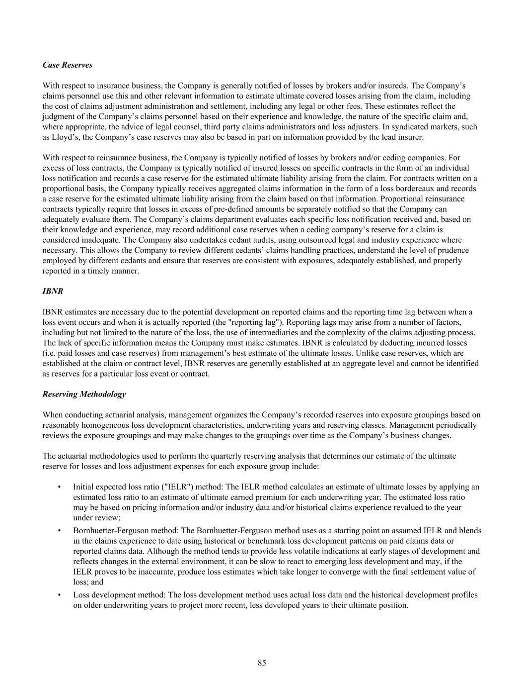 Case Reserves With respect to insurance business, the Company is generally notified of losses by brokers and/or insureds. The Company’s claims personnel use this and other relevant information to estimate ultimate covered losses arising from the claim, including the cost of claims adjustment administration and settlement, including any legal or other fees. These estimates reflect the judgment of the Company’s claims personnel based on their experience and knowledge, the nature of the specific claim and, where appropriate, the advice of legal counsel, third party claims administrators and loss adjusters. In syndicated markets, such as Lloyd’s, the Company’s case reserves may also be based in part on information provided by the lead insurer. With respect to reinsurance business, the Company is typically notified of losses by brokers and/or ceding companies. For excess of loss contracts, the Company is typically notified of insured losses on specific contracts in the form of an individual loss notification and records a case reserve for the estimated ultimate liability arising from the claim. For contracts written on a proportional basis, the Company typically receives aggregated claims information in the form of a loss bordereaux and records a case reserve for the estimated ultimate liability arising from the claim based on that information. Proportional reinsurance contracts typically require that losses in excess of pre-defined amounts be separately notified so that the Company can adequately evaluate them. The Company’s claims department evaluates each specific loss notification received and, based on their knowledge and experience, may record additional case reserves when a ceding company’s reserve for a claim is considered inadequate. The Company also undertakes cedant audits, using outsourced legal and industry experience where necessary. This allows the Company to review different cedants’ claims handling practices, understand the level of prudence employed by different cedants and ensure that reserves are consistent with exposures, adequately established, and properly reported in a timely manner. IBNR IBNR estimates are necessary due to the potential development on reported claims and the reporting time lag between when a loss event occurs and when it is actually reported (the "reporting lag"). Reporting lags may arise from a number of factors, including but not limited to the nature of the loss, the use of intermediaries and the complexity of the claims adjusting process. The lack of specific information means the Company must make estimates. IBNR is calculated by deducting incurred losses (i.e. paid losses and case reserves) from management’s best estimate of the ultimate losses. Unlike case reserves, which are established at the claim or contract level, IBNR reserves are generally established at an aggregate level and cannot be identified as reserves for a particular loss event or contract. Reserving Methodology When conducting actuarial analysis, management organizes the Company’s recorded reserves into exposure groupings based on reasonably homogeneous loss development characteristics, underwriting years and reserving classes. Management periodically reviews the exposure groupings and may make changes to the groupings over time as the Company’s business changes. The actuarial methodologies used to perform the quarterly reserving analysis that determines our estimate of the ultimate reserve for losses and loss adjustment expenses for each exposure group include: • Initial expected loss ratio ("IELR") method: The IELR method calculates an estimate of ultimate losses by applying an estimated loss ratio to an estimate of ultimate earned premium for each underwriting year. The estimated loss ratio may be based on pricing information and/or industry data and/or historical claims experience revalued to the year under review; • Bornhuetter-Ferguson method: The Bornhuetter-Ferguson method uses as a starting point an assumed IELR and blends in the claims experience to date using historical or benchmark loss development patterns on paid claims data or reported claims data. Although the method tends to provide less volatile indications at early stages of development and reflects changes in the external environment, it can be slow to react to emerging loss development and may, if the IELR proves to be inaccurate, produce loss estimates which take longer to converge with the final settlement value of loss; and • Loss development method: The loss development method uses actual loss data and the historical development profiles on older underwriting years to project more recent, less developed years to their ultimate position. 85